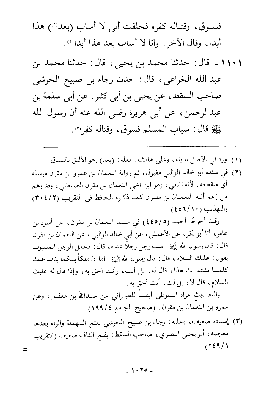 1101 - قَالَ: حَدَّثَنَا مُحَمَّدُ بْنُ يَحْيَى، قَالَ: حَدَّثَنَا مُحَمَّدُ بْنُ عَبْدِ اللَّهِ الْخُزَاعِيُّ، قَالَ: حَدَّثَنَا رَجَاءُ بْنُ صُبَيْحٍ الْحَرَشِيُّ، صَاحِبُ السَّقَطِ عَنْ يَحْيَى بْنِ أَبِي كَثِيرٍ، عَنْ أَبِي سَلَمَةَ بْنِ عَبْدِ الرَّحْمَنِ، عَنْ أَبِي هُرَيْرَةَ، رَضِيَ اللَّهُ عَنْهُ أَنَّ رَسُولَ اللَّهِ صَلَّى اللهُ عَلَيْهِ وَسَلَّمَ قَالَ: «§سِبَابُ الْمُسْلِمِ فُسُوقٌ وَقِتَالُهُ كُفْرٌ»