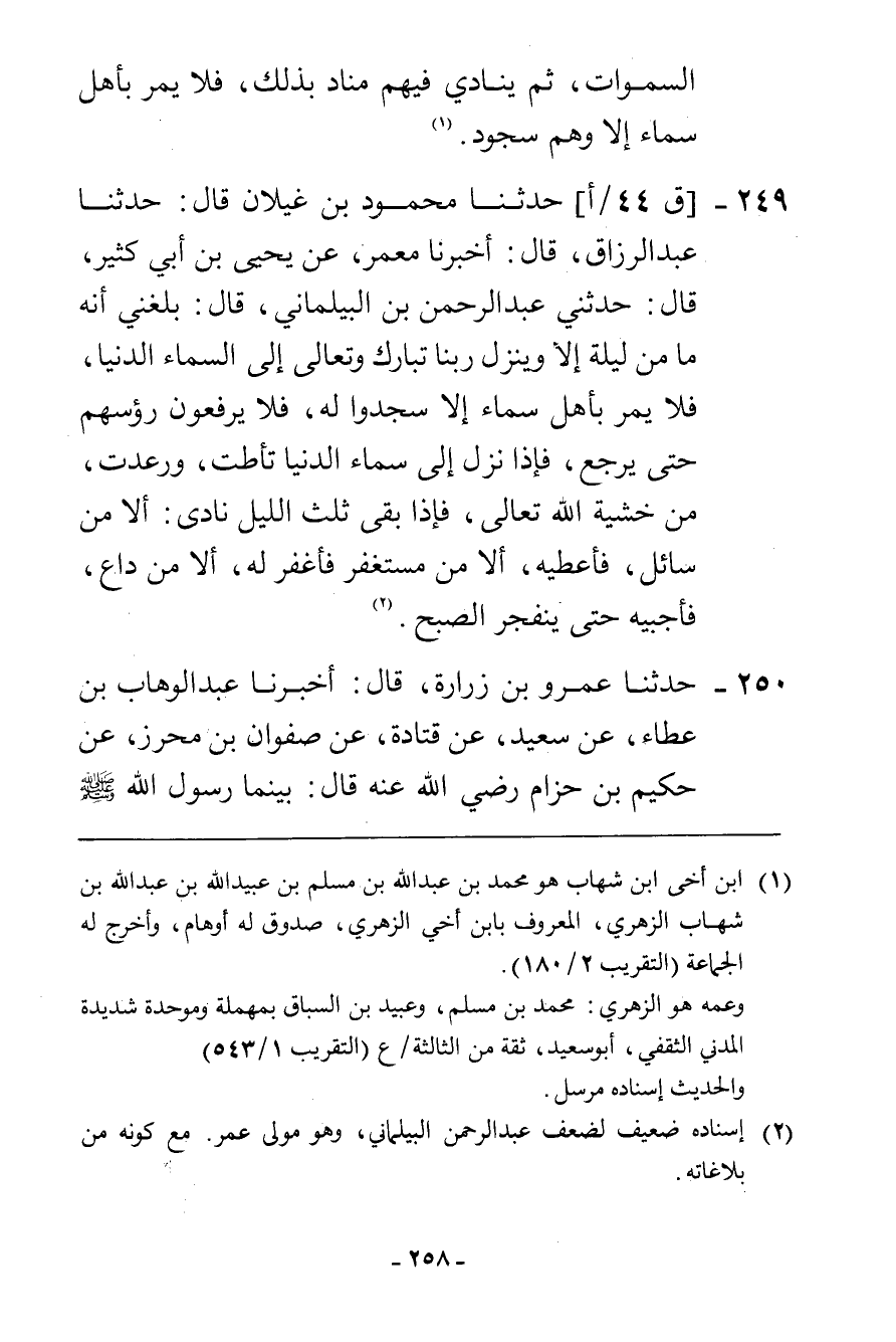 249 - حَدَّثَنَا مَحْمُودُ بْنُ غَيْلَانَ، قَالَ: حَدَّثَنَا عَبْدُ الرَّزَّاقِ، قَالَ: أَخْبَرَنَا مَعْمَرٌ، عَنْ يَحْيَى بْنِ أَبِي كَثِيرٍ، قَالَ: حَدَّثَنِي عَبْدُ الرَّحْمَنِ بْنُ الْبَيْلَمَانِيُّ، قَالَ: بَلَغَنِي أَنَّهُ " §مَا مِنْ لَيْلَةٍ إِلَّا وَيَنْزِلُ رَبُّنَا تَبَارَكَ وَتَعَالَى إِلَى السَّمَاءِ الدُّنْيَا، فَلَا يَمُرُّ بِأَهْلِ سَمَاءٍ إِلَّا سَجَدُوا لَهُ، فَلَا يَرْفَعُونَ رُءُوسَهُمْ حَتَّى يَرْجِعَ، فَإِذَا نَزَلَ إِلَى سَمَاءِ الدُّنْيَا تَأَطَّتْ وَرَعَدَتْ مِنْ خَشْيَةِ اللَّهِ تَعَالَى، فَإِذَا بَقِيَ ثُلُثُ اللَّيْلِ نَادَى: أَلَا مِنْ سَائِلٍ فَأُعْطِيَهُ، أَلَا مِنْ مُسْتَغْفِرٍ فَأَغْفِرَ لَهُ، أَلَا مِنْ دَاعٍ فَأُجِيبَهُ، حَتَّى يَنْفَجِرَ الصُّبْحُ "