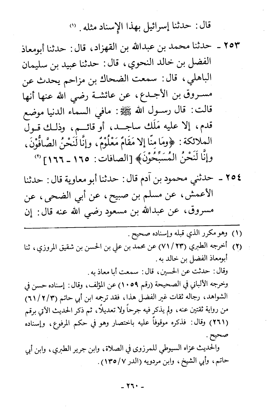 254 - حَدَّثَنِي مَحْمُودُ بْنُ آدَمَ، قَالَ: حَدَّثَنَا أَبُو مُعَاوِيَةَ، قَالَ: حَدَّثَنَا الْأَعْمَشُ، عَنْ مُسْلِمِ بْنِ صُبَيْحٍ، عَنْ أَبِي الضُّحَى، عَنْ مَسْرُوقٍ، عَنْ عَبْدِ اللَّهِ بْنِ مَسْعُودٍ، رَضِيَ اللَّهُ عَنْهُ قَالَ: " إِنَّ §-[261]- مِنَ السَّمَوَاتِ سَمَاءً مَا فِيهَا مَوْضِعُ شِبْرٍ إِلَّا وَعَلَيْهِ جَبْهَةُ مَلَكٍ أَوْ قَدَمَاهُ قَائِمًا، ثُمَّ قَرَأَ {وَإِنَّا لَنَحْنُ الصَّافُّونَ وَإِنَّا لَنَحْنُ الْمُسَبِّحُونَ} [الصافات: 166] "