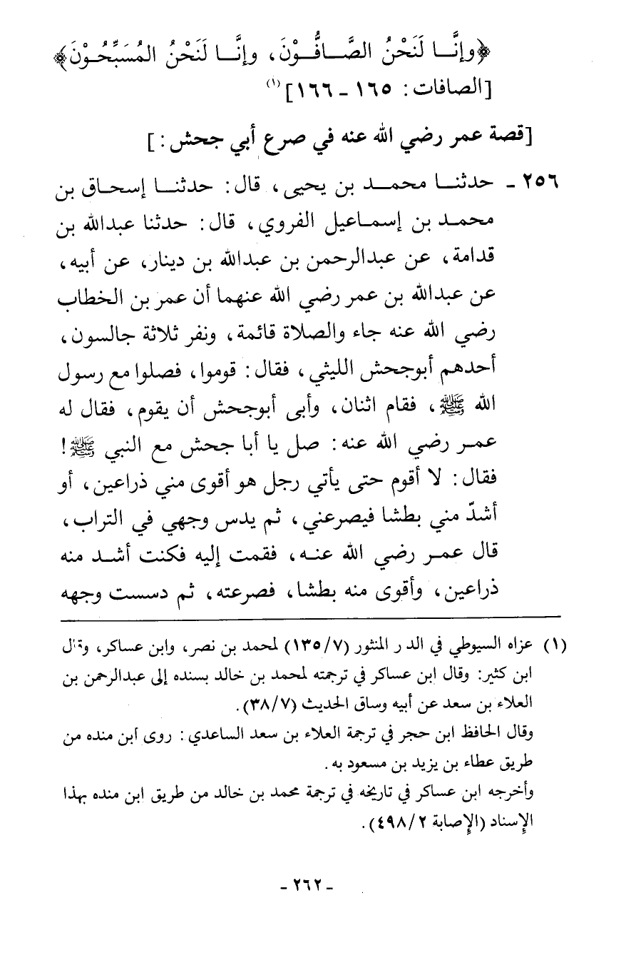 256 - حَدَّثَنَا مُحَمَّدُ بْنُ يَحْيَى، قَالَ: حَدَّثَنَا إِسْحَاقُ بْنُ مُحَمَّدِ بْنِ إِسْمَاعِيلَ الْفَرَوِيُّ، قَالَ: حَدَّثَنَا عَبْدُ اللَّهِ بْنُ قُدَامَةَ، عَنْ عَبْدِ الرَّحْمَنِ بْنِ عَبْدِ اللَّهِ بْنِ دِينَارٍ، عَنْ أَبِيهِ، عَنْ عَبْدِ اللَّهِ بْنِ عُمَرَ، رَضِيَ اللَّهُ عَنْهُمَا، أَنَّ عُمَرَ بْنَ الْخَطَّابٍ رَضِيَ اللَّهُ، عَنْهُ جَاءَ وَالصَّلَاةُ قَائِمَةٌ، وَنَفَرٌ ثَلَاثَةٌ جَالِسُونَ، أَحَدُهُمْ أَبُو جَحْشٍ اللَّيْثِيُّ، فَقَالَ: قُومُوا فَصَلُّوا مَعَ رَسُولِ اللَّهِ صَلَّى اللهُ عَلَيْهِ وَسَلَّمَ، فَقَامَ اثْنَانِ، وَأَبَى أَبُو جَحْشٍ أَنْ يَقُومَ، فَقَالَ لَهُ عُمَرُ رَضِيَ اللَّهُ عَنْهُ: صَلِّ يَا أَبَا جَحْشٍ مَعَ النَّبِيِّ صَلَّى اللهُ عَلَيْهِ وَسَلَّمَ، فَقَالَ: لَا أَقُومُ حَتَّى يَأْتِيَ رَجُلٌ هُوَ أَقْوَى مِنِّي ذِرَاعَيْنِ، أَوْ أَشَدُّ مِنِّي بَطْشًا فَيَصْرَعَنِي، ثُمَّ يَدُسُّ وَجْهِي فِي التُّرَابِ، قَالَ عُمَرُ رَضِيَ اللَّهُ عَنْهُ: فَقُمْتُ إِلَيْهِ فَكُنْتُ أَشَدَّ مِنْهُ ذِرَاعَيْنِ وَأَقْوَى مِنْهُ بَطْشًا، فَصَرَعْتُهُ ثُمَّ دَسَسْتُ وَجْهَهُ -[263]- فِي التُّرَابِ، فَأَتَى عَلَيَّ عُثْمَانُ بْنُ عَفَّانَ رَضِيَ اللَّهُ عَنْهُ فَحَجَزَنِي عَنْهُ، فَخَرَجَ عُمَرُ بْنُ الْخَطَّابٍ رَضِيَ اللَّهُ عَنْهُ مُغْضَبًا حَتَّى انْتَهَى إِلَى النَّبِيِّ صَلَّى اللهُ عَلَيْهِ وَسَلَّمَ، فَلَمَّا رَآهُ النَّبِيُّ صَلَّى اللهُ عَلَيْهِ وَسَلَّمَ قَالَ: «مَاذَا بِكَ يَا أَبَا حَفْصٍ» فَقَالَ: يَا رَسُولَ اللَّهِ، أَتَيْتُ عَلَى نَفَرٍ جُلُوسٍ عَلَى بَابِ الْمَسْجِدِ.، فَقَصَّ الْقِصَّةَ إِلَى قَوْلِهِ: فَأَتَى عَلَيَّ عُثْمَانُ فَحَجَزَنِي عَنْهُ، مَا ذَاكَ إِلَّا أَنَّهُ ضَافَهُ لَيْلَةً فَأَحَبَّ أَنْ يَشْكُرَهَا لَهُ، فَسَمِعَ ذَلِكَ عُثْمَانُ فَقَالَ: يَا رَسُولَ اللَّهِ، أَلَا تَسْمَعُ مَا يَقُولُ لَنَا عُمَرُ عِنْدَكَ؟ فَقَالَ رَسُولُ اللَّهِ صَلَّى اللهُ عَلَيْهِ وَسَلَّمَ: «إِنَّ رِضَى عُمَرَ رَحْمَةٌ، وَاللَّهِ عَلَى ذَاكَ لَوَدِدْتُ أَنَّكَ كُنْتَ جِئْتَنِي بِرَأْسِ الْخَبِيثِ» فَقَامَ عُمَرُ فَوَجَّهَ، فَلَمَّا أَبْعَدَ شَيْئًا نَادَاهُ فَقَالَ: " اجْلِسْ حَتَّى أُخْبِرَكَ بِغِنَى الرَّبِّ عَنْ صَلَاةِ أَبِي جَحْشٍ، إِنَّ §لِلَّهِ فِي السَّمَاءِ الدُّنْيَا مَلَائِكَةً خُشُوعًا لَا يَرْفَعُونَ رُءُوسَهُمْ حَتَّى تَقُومَ السَّاعَةُ، فَإِذَا قَامَتِ السَّاعَةُ رَفَعُوا رُءُوسِهُمْ ثُمَّ قَالُوا: رَبَّنَا مَا عَبَدْنَاكَ حَقَّ عِبَادَتِكَ، وَإِنَّ لِلَّهِ فِي السَّمَاءِ الثَّانِيَةِ مَلَائِكَةً سُجُودًا لَا يَرْفَعُونَ رُءُوسَهُمْ حَتَّى تَقُومَ السَّاعَةُ، فَإِذَا قَامَتِ السَّاعَةُ رَفَعُوا رُءُوسَهُمْ ثُمَّ قَالُوا: رَبَّنَا مَا عَبَدْنَاكَ حَقَّ عِبَادَتِكَ، وَإِنَّ لِلَّهِ فِي السَّمَاءِ الثَّالِثَةِ مَلَائِكَةً رُكُوعًا لَا يَرْفَعُونَ رُءُوسَهُمْ حَتَّى تَقُومَ السَّاعَةُ، فَإِذَا قَامَتِ السَّاعَةُ رَفَعُوا رُءُوسَهُمْ وَقَالُوا: سُبْحَانَكَ مَا عَبَدْنَاكَ حَقَّ عِبَادَتِكَ " فَقَالَ لَهُ عُمَرُ: وَمَا يَقُولُونَ يَا رَسُولَ اللَّهِ؟ قَالَ: " أَمَّا أَهْلُ -[264]- سَمَاءِ الدُّنْيَا فَيَقُولُونَ: سُبْحَانَ ذِي الْمُلْكِ وَالْمَلَكُوتِ، وَأَمَّا أَهْلُ السَّمَاءِ الثَّانِيَةِ فَيَقُولُونَ: سُبْحَانَ ذِي الْعِزِّ وَالْجَبَرُوتِ، وَأَمَّا أَهْلِ السَّمَاءِ الثَّالِثَةِ فَيَقُولُونَ: سُبْحَانَ الْحَيِّ الَّذِي لَا يَمُوتُ، فَقُلْهَا يَا عُمَرُ فِي صَلَاتِكَ " فَقَالَ عُمَرُ: يَا رَسُولَ اللَّهِ، فَكَيْفَ الَّذِي عَلَّمْتَنِي وَأَمَرْتَنِي أَنْ أَقُولَهُ فِي صَلَاتِي، قَالَ: «قُلْ هَذِهِ مَرَّةً، وَهَذِهِ مَرَّ