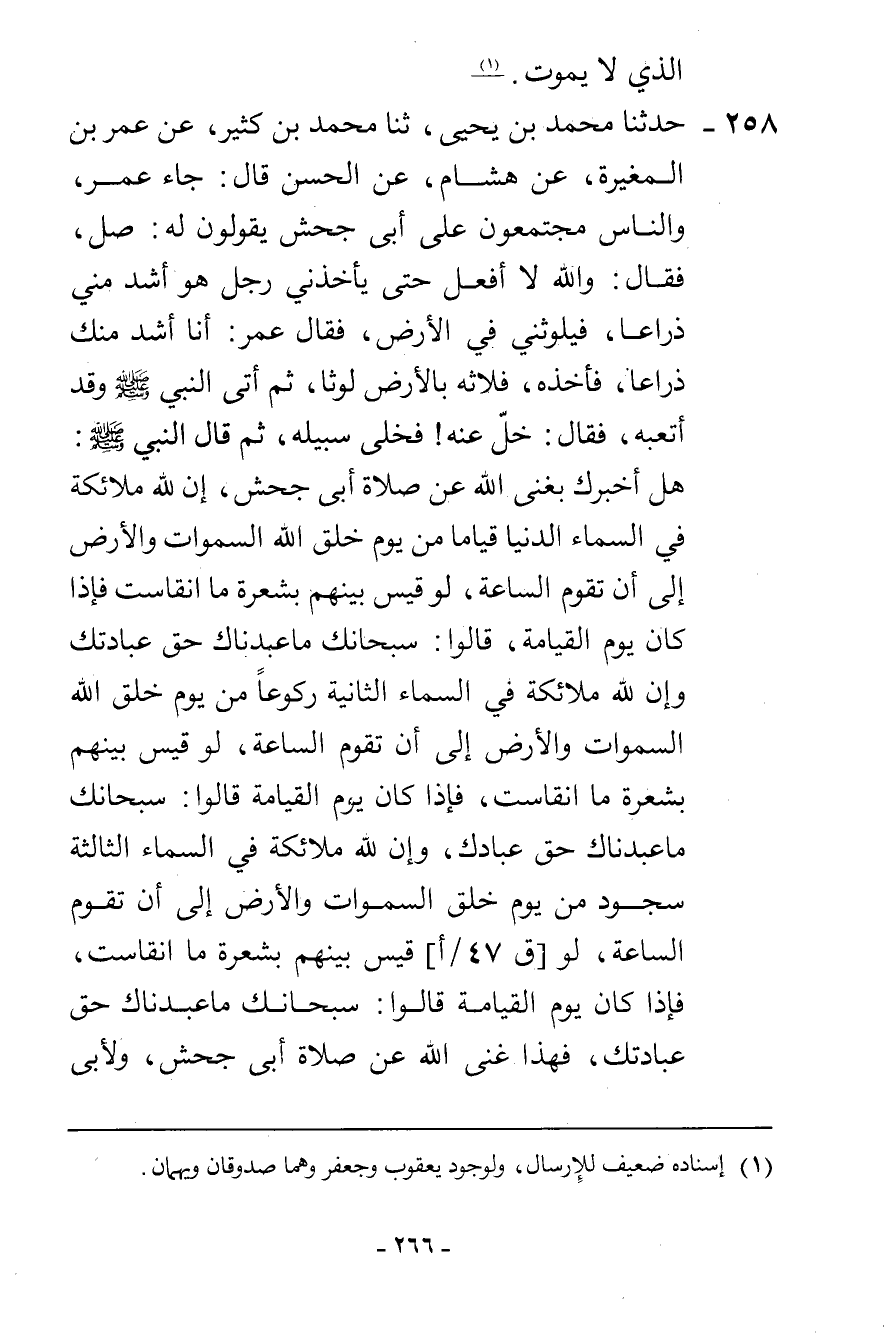 258 - حَدَّثَنَا مُحَمَّدُ بْنُ يَحْيَى، ثنا مُحَمَّدُ بْنُ كَثِيرٍ، عَنْ عُمَرَ بْنِ الْمُغِيرَةِ، عَنْ هِشَامٍ، عَنِ الْحَسَنِ، قَالَ: جَاءَ عُمَرُ وَالنَّاسُ مُجْتَمِعُونَ عَلَى أَبِي جَحْشٍ يَقُولُونَ لَهُ: صَلِّ، فَقَالَ: وَاللَّهِ لَا أَفْعَلُ حَتَّى يَأْخُذَنِي رَجُلٌ هُوَ أَشَدُّ مِنِّي ذِرَاعًا فَيَلُوثُنِي فِي الْأَرْضِ، فَقَالَ عُمَرُ: أَنَا أَشَدُّ مِنْكَ ذِرَاعًا، فَأَخَذَهُ فَلَاثَهُ بِالْأَرْضِ لَوْثًا، ثُمَّ أَتَى النَّبِيَّ صَلَّى اللهُ عَلَيْهِ وَسَلَّمَ وَقَدْ أَتْعَبَهُ فَقَالَ: خَلِّ عَنْهُ، فَخَلَّى سَبِيلَهُ، ثُمَّ قَالَ النَّبِيُّ صَلَّى اللهُ عَلَيْهِ وَسَلَّمَ: " §هَلْ أُخْبِرُكَ بِغِنَى اللَّهِ عَنْ صَلَاةِ أَبِي جَحْشٍ، إِنَّ لِلَّهِ مَلَائِكَةً فِي السَّمَاءِ الدُّنْيَا قِيَامًا مِنْ يَوْمِ خَلَقَ اللَّهُ السَّمَوَاتِ وَالْأَرْضَ إِلَى أَنْ تَقُومَ السَّاعَةُ، لَوْ قِيسَ بَيْنَهُمْ بِشَعْرَةٍ مَا انْقَاسَتْ، فَإِذَا كَانَ يَوْمُ الْقِيَامَةِ قَالُوا: سُبْحَانَكَ مَا عَبَدْنَاكَ حَقَّ عِبَادَتِكَ، وَإِنَّ لِلَّهِ مَلَائِكَةً فِي السَّمَاءِ الثَّانِيَةِ رُكُوعًا مِنْ يَوْمِ خَلَقَ اللَّهُ السَّمَوَاتِ وَالْأَرْضَ إِلَى أَنْ تَقُومَ السَّاعَةُ، لَوْ قِيسَ بَيْنَهُمْ بِشَعْرَةٍ مَا انْقَاسَتْ، فَإِذَا كَانَ يَوْمُ الْقِيَامَةِ قَالُوا: سُبْحَانَكَ مَا عَبَدْنَاكَ حَقَّ عِبَادَكَ، وَإِنَّ لِلَّهِ مَلَائِكَةً فِي السَّمَاءِ الثَّالِثَةِ سُجُودٌ مِنْ يَوْمِ خَلَقَ السَّمَوَاتِ وَالْأَرْضَ إِلَى أَنْ تَقُومَ السَّاعَةُ، لَوْ قِيسَ بَيْنَهُمْ بِشَعْرَةٍ مَا انْقَاسَتْ، فَإِذَا كَانَ يَوْمُ الْقِيَامَةِ قَالُوا: سُبْحَانَكَ مَا عَبَدْنَاكَ حَقَّ عِبَادَتِكَ، فَهَذَا غِنَى اللَّهِ عَنْ صَلَاةِ أَبِي جَحْشٍ، وَلِأَبِي -[267]- جَحْشٍ فِي النَّارِ مَثْوًى " فَقَالَ عُمَرُ: يَا رَسُولَ اللَّهِ، فَمَا يَقُولُ أَهْلُ السَّمَاءِ الدُّنْيَا وَأَهْلُ السَّمَاءِ الثَّانِيَةِ وَأَهْلُ السَّمَاءِ الثَّالِثَةِ؟ قَالَ: «لَا أَدْرِي» فَأَتَاهُ جِبْرِيلُ فَقَالَ: يَقُولُ أَهْلُ السَّمَاءِ الدُّنْيَا: سُبْحَانَ ذِي الْمُلْكِ وَالْمَلَكُوتِ، وَيَقُولُ أَهْلُ السَّمَاءِ الثَّانِيَةِ: سُبْحَانَ ذِي الْعِزَّةِ وَالْجَبَرُوتِ، وَيَقُولُ أَهْلُ السَّمَاءِ الثَّالِثَةِ: سُبْحَانَ الْحَيِّ الَّذِي لَا يَمُوتُ "