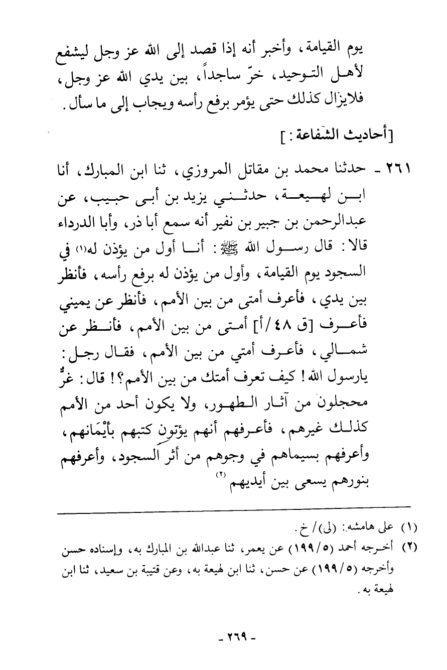 261 - حَدَّثَنَا مُحَمَّدُ بْنُ مُقَاتِلٍ الْمَرْوَزِيُّ، ثنا ابْنُ الْمُبَارَكِ، أَنَا ابْنُ لَهِيعَةَ، حَدَّثَنِي يَزِيدُ بْنُ أَبِي حَبِيبٍ، عَنْ عَبْدِ الرَّحْمَنِ بْنِ جُبَيْرِ بْنِ نُفَيْرٍ، أَنَّهُ سَمِعَ أَبَا ذَرٍّ، وَأَبَا الدَّرْدَاءِ، قَالَا: قَالَ رَسُولُ اللَّهِ صَلَّى اللهُ عَلَيْهِ وَسَلَّمَ: «§أَنَا أَوَّلُ مَنْ يُؤْذَنُ لَهُ فِي السُّجُودِ يَوْمَ الْقِيَامَةِ، وَأَوَّلُ مَنْ يُؤْذَنُ لَهُ بِرَفْعِ رَأْسِهِ، فَأَنْظُرُ بَيْنَ يَدَيَّ فَأَعْرِفُ أُمَّتِي مِنْ بَيْنِ الْأُمَمِ، فَأَنْظُرُ عَنْ يَمِينِي فَأَعْرِفُ أُمَّتِي مِنْ بَيْنِ الْأُمَمِ، فَأَنْظُرُ عَنْ شِمَالِي فَأَعْرِفُ أُمَّتِي مِنْ بَيْنِ الْأُمَمِ» فَقَالَ رَجُلٌ: يَا رَسُولَ اللَّهِ، كَيْفَ تَعْرِفُ أُمَّتَكَ مِنْ بَيْنِ الْأُمَمِ؟ قَالَ: «غُرٌّ مُحَجَّلُونَ مِنْ آثَارِ الطُّهُورِ، وَلَا يَكُونُ أَحَدٌ مِنَ الْأُمَمِ كَذَلِكَ غَيْرُهُمْ، فَأَعْرِفُهُمْ أَنَّهُمْ يُؤْتَوْنَ كُتُبَهُمْ بِأَيْمَانِهِمْ، وَأَعْرِفُهُمْ بِسِيمَاهُمْ فِي وُجُوهِهِمْ مِنْ أَثَرِ السُّجُودِ، وَأَعْرِفُهُمْ بِنُورِهِمْ يَسْعَى بَيْنَ أَيْدِيهِمْ»