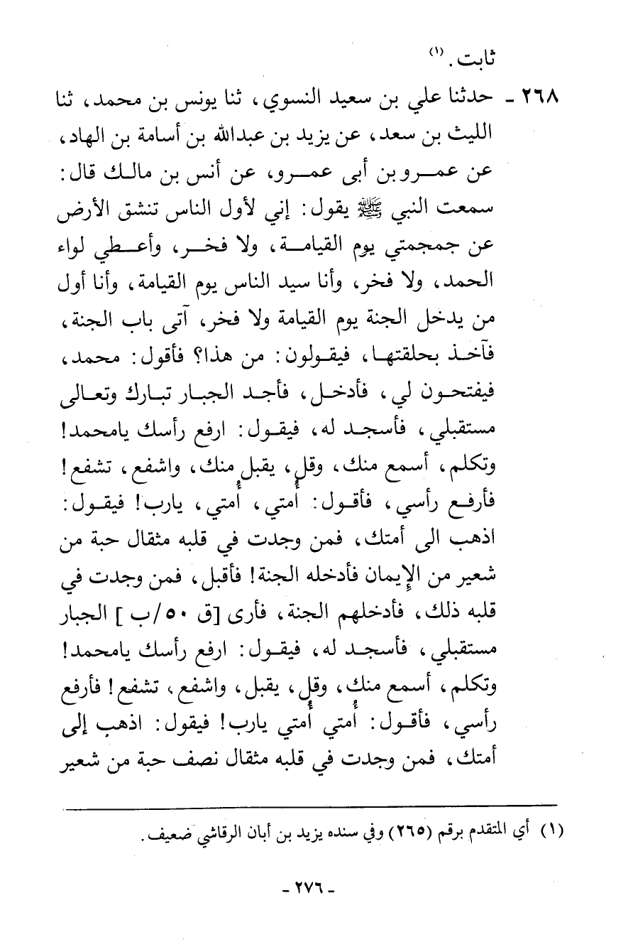 268 - حَدَّثَنَا عَلِيُّ بْنُ سَعِيدٍ النَّسَوِيُّ، ثنا يُونُسُ بْنُ مُحَمَّدٍ، ثنا اللَّيْثُ بْنُ سَعْدٍ، عَنْ يَزِيدَ بْنِ عَبْدِ اللَّهِ بْنِ أُسَامَةَ بْنِ الْهَادِ، عَنْ عَمْرِو بْنِ أَبِي عَمْرٍو، عَنْ أَنَسِ بْنِ مَالِكٍ، قَالَ: سَمِعْتُ النَّبِيَّ صَلَّى اللهُ عَلَيْهِ وَسَلَّمَ يَقُولُ: " §إِنِّي لَأَوَّلُ النَّاسِ تَنْشَقُّ الْأَرْضُ عَنْ جُمْجُمَتِي يَوْمَ الْقِيَامَةِ وَلَا فَخْرَ، وَأُعْطَى لِوَاءَ الْحَمْدِ وَلَا فَخْرَ، وَأَنَا سَيِّدُ النَّاسِ يَوْمَ الْقِيَامَةِ، وَأَنَا أَوَّلُ مَنْ يَدْخُلُ الْجَنَّةَ يَوْمَ الْقِيَامَةِ وَلَا فَخْرَ، آتِي بَابَ الْجَنَّةِ فَآخُذُ بِحَلْقَتِهَا فَيَقُولُونَ: مَنْ هَذَا؟ فَأَقُولُ: مُحَمَّدٌ، فَيَفْتَحُونَ لِي فَأَدْخَلُ فَأَجِدُ الْجَبَّارَ تَبَارَكَ وَتَعَالَى مُسْتَقْبِلِي، فَأَسْجُدُ لَهُ فَيَقُولُ: «ارْفَعْ رَأْسَكَ يَا مُحَمَّدُ، وَتَكَلَّمْ أَسْمَعْ مِنْكَ، وَقُلْ يُقْبَلْ مِنْكَ، وَاشْفَعْ تُشَفَّعْ» ، فَأَرْفَعُ رَأْسِي فَأَقُولُ: «أُمَّتِي أُمَّتِي يَا رَبِّ» ، فَيَقُولُ: «اذْهَبْ إِلَى أُمَّتِكَ فَمَنْ وَجَدْتَ فِي قَلْبِهِ مِثْقَالَ حَبَّةٍ مِنْ شَعِيرٍ مِنَ الْإِيمَانِ فَأَدْخِلْهُ الْجَنَّةَ، فَأُقْبِلُ فَمَنْ وَجَدْتُ فِي قَلْبِهِ ذَلِكَ فَأُدْخِلُهُمُ الْجَنَّةَ» ، فَأَرَى الْجَبَّارَ مُسْتَقْبِلِي، فَأَسْجُدُ لَهُ فَيَقُولُ: «ارْفَعْ رَأْسَكَ يَا مُحَمَّدُ، وَتَكَلَّمْ أَسْمَعْ مِنْكَ، وَقُلْ يُقْبَلْ، وَاشْفَعْ تُشَفَّعْ» ، فَأَرْفَعُ رَأْسِي فَأَقُولُ: أُمَّتِي أُمَّتِي يَا رَبِّ، فَيَقُولُ: «اذْهَبْ إِلَى أُمَّتِكَ فَمَنْ وَجَدْتَ فِي قَلْبِهِ مِثْقَالَ نِصْفِ حَبَّةٍ مِنْ شَعِيرٍ ثَابِتٍ -[277]- مِنَ الْإِيمَانِ فَأَدْخِلْهُ الْجَنَّةَ» ، فَأَذْهَبُ فَمَنْ وَجَدْتُ فِي قَلْبِهِ مِثْقَالَ ذَلِكَ أَدْخَلْتُهُمُ الْجَنَّةَ، فَأَجِدُ الْجَبَّارَ مُسْتَقْبِلِي، فَأَسْجُدُ لَهُ فَيَقُولُ: «ارْفَعْ رَأْسَكَ يَا مُحَمَّدُ، وَتَكَلَّمْ يُسْمَعْ مِنْكَ، وَقُلْ يُقْبَلْ مِنْكَ، وَاشْفَعْ تُشَفَّعْ» ، فَأَرْفَعُ رَأْسِي فَأَقُولُ: أُمَّتِي أُمَّتِي يَا رَبِّ، فَيَقُولُ: «اذْهَبْ إِلَى أُمَّتِكَ، فَمَنْ وَجَدْتَ فِي قَلْبِهِ مِثْقَالَ حَبَّةٍ مِنْ خَرْدَلٍ مِنَ الْإِيمَانِ فَأَدْخِلْهُ الْجَنَّةَ» ، فَأَذْهَبُ فَمَنْ وَجَدْتُ فِي قَلْبِهِ ذَلِكَ أَدْخَلْتُهُمُ الْجَنَّةَ، وَفَرَغَ مِنْ حِسَابِ النَّاسِ، وَأُدْخِلُ مَنْ بَقِيَ مِنْ أُمَّتِي النَّارَ مَعَ أَهْلِ النَّارِ، فَيَقُولُ أَهْلُ النَّارِ: مَا أَغْنَى عَنْكُمْ أَنَّكُمْ كُنْتُمْ تَعْبُدُونَ اللَّهَ لَا تُشْرِكُونَ بِهِ شَيْئًا، فَيَقُولُ الْجَبَّارُ: «بِعِزَّتِي لَأُعْتِقَنَّهُمْ مِنَ النَّارِ» ، فَيُرْسِلُ إِلَيْهِمْ فَيَخْرُجُونَ مِنَ النَّارِ قَدِ امْتُحِشُوا، فَيَدْخُلُونَ فِي نَهَرِ الْحَيَاةِ فَيَنْبُتُونَ فِيهِ كَمَا يَنْبُتُ الْحَبَّةُ فِي غُثَاءِ السَّيْلِ، يُكْتَبُ بَيْنَ أَعْيُنِهِمْ: هَؤُلَاءِ عُتَقَاءُ اللَّهِ، فَيُذْهَبُ بِهِمْ فَيُدْخَلُونَ الْجَنَّةَ، فَيَقُولُ لَهُمْ أَهْلُ الْجَنَّةِ: هَؤُلَاءِ الْجَهَنَّمِيُّونَ، فَيَقُولُ الْجَبَّارُ: «هَؤُلَاءِ عُتَقَاءُ الْجَبَّارِ»