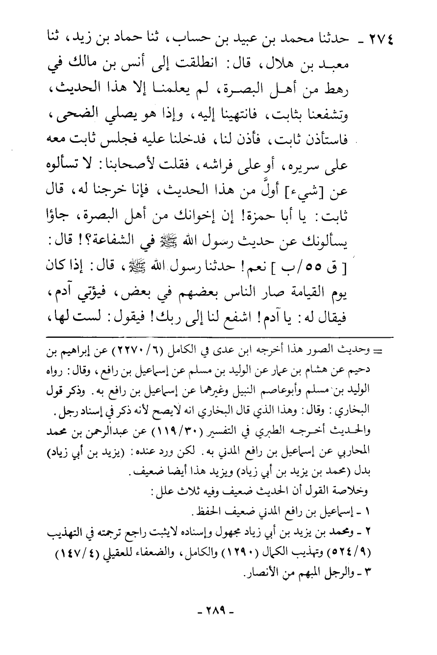 274 - حَدَّثَنَا مُحَمَّدُ بْنُ عُبَيْدِ بْنِ حِسَابٍ، ثنا حَمَّادُ بْنُ زَيْدٍ، ثنا مَعْبَدُ بْنُ هِلَالٍ، قَالَ: انْطَلَقْتُ إِلَى أَنَسِ بْنِ مَالِكٍ فِي رَهْطٍ مِنْ أَهْلِ الْبَصْرَةِ لَمْ يُعَلِّمْنَا إِلَّا هَذَا الْحَدِيثَ، وَتَشَفَّعْنَا بِثَابِتٍ فَانْتَهَيْنَا إِلَيْهِ، وَإِذَا هُوَ يُصَلِّي الضُّحَى، فَاسْتَأْذَنَ ثَابِتٌ فَأَذِنَ لَنَا، فَدَخَلْنَا عَلَيْهِ، فَجَلَسَ ثَابِتٌ مَعَهُ عَلَى سَرِيرِهِ أَوْ عَلَى فِرَاشِهِ فَقُلْتُ لِأَصْحَابِنَا: لَا تَسْأَلُوهُ عَنْ شَيْءٍ أَوَّلَ مِنْ هَذَا الْحَدِيثِ، فَإِنَّا خَرَجْنَا لَهُ، قَالَ ثَابِتٌ: يَا أَبَا حَمْزَةَ، إِنَّ إِخْوَانَكَ مِنْ أَهْلِ الْبَصْرَةِ جَاءُوا يَسْأَلُونَكَ عَنْ حَدِيثِ رَسُولِ اللَّهِ صَلَّى اللهُ عَلَيْهِ وَسَلَّمَ فِي الشَّفَاعَةِ، قَالَ: نَعَمْ، حَدَّثَنَا رَسُولُ اللَّهِ صَلَّى اللهُ عَلَيْهِ وَسَلَّمَ، قَالَ: " §إِذَا كَانَ يَوْمُ الْقِيَامَةِ صَارَ النَّاسُ بَعْضُهُمْ فِي بَعْضٍ، فَيُؤْتَى آدَمُ فَيُقَالُ لَهُ: يَا آدَمُ اشْفَعْ لَنَا إِلَى رَبِّكَ، فَيَقُولُ: لَسْتُ لَهَا -[290]-، وَلَكِنْ عَلَيْكُمْ بِإِبْرَاهِيمَ فَهُوَ خَلِيلُ اللَّهِ، فَيُؤْتَى إِبْرَاهِيمُ فَيَقُولُ: لَسْتُ لَهَا، وَلَكِنْ عَلَيْكُمْ بِمُوسَى، فَإِنَّهُ كَلِيمُ اللَّهِ، فَيُؤْتَى مُوسَى فَيَقُولُ: لَسْتُ لَهَا، لَكِنْ عَلَيْكُمْ بِعِيسَى فَهُوَ رَوْحُ اللَّهِ وَكَلِمَتُهُ، فَيُؤْتَى عِيسَى فَيَقُولُ: لَسْتُ لَهَا، وَلَكِنْ عَلَيْكُمْ بِمُحَمَّدٍ، فَأُوتَى فَأَقُولُ: أَنَا لَهَا، فَأَنْطَلِقُ فَأَسْتَأْذِنُ عَلَى رَبِّي فَيُؤْذَنُ لِي عَلَيْهِ، فَأَقُومُ بَيْنَ يَدَيْهِ وَيُعَلِّمُنِي مَحَامِدَ لَا أَقْدِرُ عَلَيْهَا الْآنَ، فَأَحْمَدُهُ بِتِلْكَ الْمَحَامِدِ، ثُمَّ أَخِرُّ لَهُ سَاجِدًا، فَيَقُولُ لِي: «مُحَمَّدُ ارْفَعْ رَأْسَكَ، وَقُلْ يُسْمَعْ لَكَ، وَسَلْ تُعْطَهْ، وَاشْفَعْ تُشَفَّعْ» ، فَأَقُولُ: يَا رَبِّ أُمَّتِي أُمَّتِي، فَيُقَالُ لِي: «انْطَلِقْ فَمَنْ كَانَ فِي قَلْبِهِ مِثْقَالُ بُرَّةٍ» ، وَإِمَّا قَالَ: «شَعِيرَةٍ مِنْ إِيمَانٍ، فَأَخْرِجْهُ مِنْهَا» ، فَأَنْطَلِقُ فَأَفْعَلُ ذَلِكَ، ثُمَّ أَعُودُ فَأَحْمَدُهُ بِتِلْكَ الْمَحَامِدِ، ثُمَّ أَخِرُّ لَهُ سَاجِدًا، فَيُقَالُ لِي: «مُحَمَّدُ ارْفَعْ رَأْسَكَ، وَقُلْ يُسْمَعْ لَكَ، وَسَلْ تُعْطَهْ، وَاشْفَعْ تُشَفَّعْ» ، فَأَقُولُ: أَيْ رَبِّ، أُمَّتِي أُمَّتِي، فَيُقَالُ لِي: " انْطَلِقْ فَمَنْ كَانَ فِي قَلْبِهِ مِثْقَالُ خَرْدَلَةٍ مِنْ إِيمَانٍ فَأَخْرِجْهُ مِنْهَا، فَأَنْطَلِقُ فَأَفْعَلُ، ثُمَّ أَعُودُ فَأَحْمَدُهُ بِتِلْكَ الْمَحَامِدِ فَأَخِرُّ لَهُ سَاجِدًا فَيُقَالُ لِي: «يَا مُحَمَّدُ، ارْفَعْ رَأْسَكَ، وَقُلْ يُسْمَعْ لَكَ، وَسَلْ تُعْطَ، وَاشْفَعْ تُشَفَّعْ» ، فَأَقُولُ: أَيْ رَبِّ، أُمَّتِي أُمَّتِي، فَيُقَالُ لِي: «انْطَلِقْ فَمَنْ كَانَ فِي قَلْبِهِ أَدْنَى مِنْ ثُلُثَيْ مِثْقَالٍ مِنْ خَرْدَلٍ فَأَخْرِجْهُ مِنَ النَّارِ» ، فَأَنْطَلِقُ فَأَفْعَلُ " -[291]- هَذَا حَدِيثُ أَنَسٍ الَّذِي أَنْبَأَنَا، حَتَّى إِذَا كُنَّا بِظَهْرِ الْجَبَانِ قُلْنَا: لَوْ مِلْنَا إِلَى الْحَسَنِ وَهُوَ مُسْتَخْفٍ فِي مَنْزِلِ أَبِي خَلِيفَةَ، فَأَتَيْنَاهُ فَدَخَلْنَا عَلَيْهِ فَقُلْنَا: يَا أَبَا سَعِيدٍ، جِئْنَا مِنْ عِنْدِ أَخِيكَ أَبِي حَمْزَةَ، فَلَمْ نَسْمَعْ بِمِثْلِ حَدِيثٍ حَدَّثَنَا فِي الشَّفَاعَةِ، فَقَالَ: هَاتُوا كَيْفَ حَدَّثَكُمْ، فَحَدَّثْنَاهُ حَتَّى إِذَا فَرَغْنَا قَالَ: هِيهِ، فَقُلْنَا: مَا زَادَنَا عَلَى هَذَا، فَقَالَ الْحَسَنُ: وَاللَّهِ لَقَدْ حَدَّثَنِي بِهَذَا الْحَدِيثِ مُنْذُ عِشْرِينَ سَنَةً وَهُوَ جَمِيعٌ فَمَا أَدْرِ