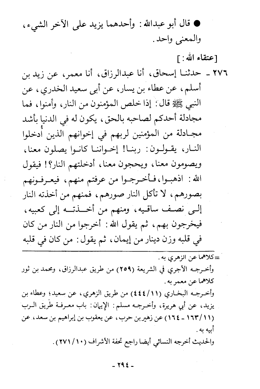 276 - حَدَّثَنَا إِسْحَاقُ، أَنَا عَبْدُ الرَّزَّاقِ، أَنَا مَعْمَرٌ، عَنْ زَيْدِ بْنِ أَسْلَمَ، عَنْ عَطَاءِ بْنِ يَسَارٍ، عَنْ أَبِي سَعِيدٍ الْخُدْرِيِّ، عَنِ النَّبِيِّ صَلَّى اللهُ عَلَيْهِ وَسَلَّمَ قَالَ: " §إِذَا خَلَصَ الْمُؤْمِنُونَ مِنَ النَّارِ وَأَمِنُوا، فَمَا مُجَادَلَةُ أَحَدِكُمْ لِصَاحِبِهِ بِالْحَقِّ يَكُونُ لَهُ فِي الدُّنْيَا بِأَشَدَّ مُجَادَلَةً مِنَ الْمُؤْمِنِينَ لِرَبِّهِمْ فِي إِخْوَانِهِمُ الَّذِينَ أُدْخِلُوا النَّارَ، يَقُولُونَ: رَبَّنَا إِخْوَانُنَا كَانُوا يُصَلُّونَ مَعَنَا، وَيَصُومُونَ مَعَنَا، وَيَحُجُّونَ مَعَنَا، أَدْخَلْتَهُمُ النَّارَ؟ فَيَقُولُ اللَّهُ: «اذْهَبُوا فَأَخْرِجُوا مَنْ عَرَفْتُمْ مِنْهُمْ، فَيَعْرِفُونَهُمْ بِصُوَرِهِمْ، لَا تَأْكُلُ النَّارُ صُوَرَهُمْ» ، فَمِنْهُمْ مَنْ أَخَذَتْهُ النَّارُ إِلَى نِصْفِ سَاقَيْهِ، وَمِنْهُمْ مَنْ أَخَذَتْهُ إِلَى كَعْبَيْهِ، فَيَخْرُجُونَ بِهِمْ، ثُمَّ يَقُولُ اللَّهُ: «أَخْرِجُوا مِنَ النَّارِ مَنْ كَانَ فِي قَلْبِهِ وَزْنُ دِينَارٍ مِنْ إِيمَانٍ» ، ثُمَّ يَقُولُ: «مَنْ كَانَ فِي قَلْبِهِ -[295]- وَزْنُ نِصْفِ دِينَارٍ مِنْ إِيمَانٍ» ، حَتَّى يَقُولَ: «مَنْ فِي قَلْبِهِ مِثْقَالُ ذَرَّةٍ مِنْ إِيمَانٍ» قَالَ أَبُو سَعِيدٍ: فَمَنْ لَمْ يُصَدِّقْ بِهَذَا فَلْيَقْرَأْ {إِنَّ اللَّهَ لَا يَظْلِمُ مِثْقَالَ ذَرَّةٍ وَإِنْ تَكُ حَسَنَةً يُضَاعِفْهَا وَيُؤْتِ مِنْ لَدُنْهُ أَجْرًا عَظِيمًا} [النساء: 40] فَيَقُولُونَ: يَا رَبَّنَا، أَخْرَجْنَا مَنْ أَمَرْتَنَا فَلَمْ يَبْقَ أَحَدٌ فِي النَّارِ فِيهِ خَيْرٌ، فَيَقُولُ اللَّهُ: «شَفَعَتِ الْمَلَائِكَةُ، وَشَفَعَتِ الْأَنْبِيَاءُ، وَشَفَعَ الْمُؤْمِنُونَ، وَبَقِيَ أَرْحَمُ الرَّاحِمِينَ» ، فَيُخْرِجُ اللَّهُ قَبْضَةً أَوْ قَبْضَتَيْنِ مِنَ النَّارِ، نَاسًا لَمْ يَعْرِفُوا لِلَّهِ خَيْرًا قَطُّ، وَقَدِ احْتَرَقُوا حَتَّى صَارُوا حُمَمًا، فَيُؤْتَى بِهِمْ إِلَى مَاءٍ يُقَالُ لَهُ مَاءُ الْحَيَاةِ، فَيَنْبُتُونَ كَمَا يَنْبُتُ الْحَبَّةُ فِي حَمِيلِ السَّيْلِ، فَيُخْرِجُونَ مِنْ أَجْسَادِهِمْ مِثْلَ اللُّؤْلُؤِ فِي أَعْنَاقِهِمُ الْخَاتَمُ: عُتَقَاءُ اللَّهِ، فَيَقُولُ لَهُمْ: «مَا غَنِمْتُمْ، أَوْ مَا رَأَيْتُمْ مِنْ شَيْءٍ فَهُوَ لَكُمْ» ، فَيَقُولُونَ: رَبَّنَا أَعْطَيْتَنَا مَا لَمْ تُعْطِ أَحَدًا مِنَ الْعَالَمِينَ، فَيَقُولُ: «إِنَّ لَكُمْ عِنْدِي فَضْلًا أُعْطِيكُمُوهُ» ، فَيَقُولُونَ: رَبَّنَا وَمَا أَفْضَلُ مِمَّا أَعْطَيْتَنَا، فَيَقُولُ: «رِضَايَ عَنْكُمْ، فَلَا أَسْخَطُ عَلَيْكُمْ بَعْدَهُ أَبَدًا»