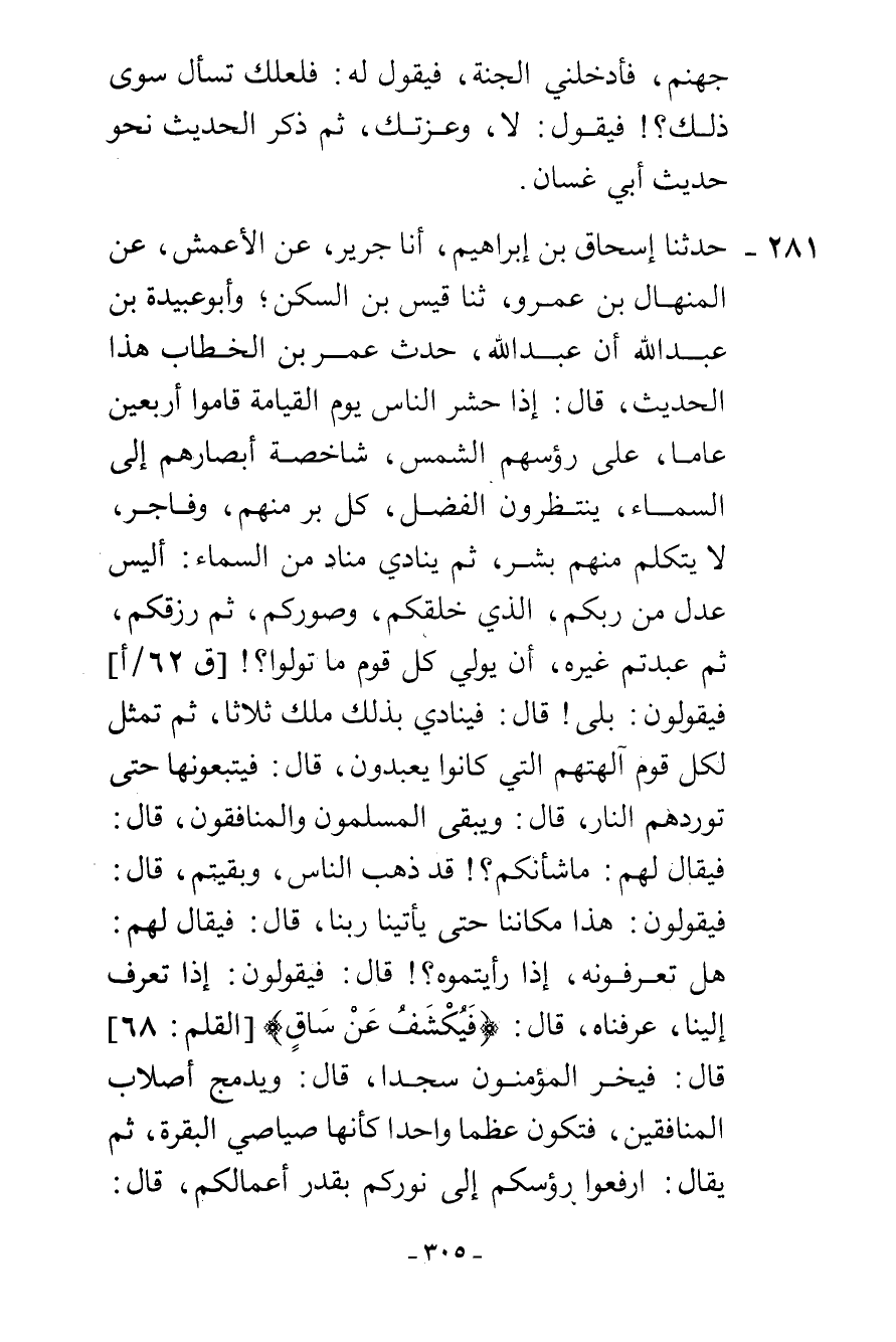 281 - حَدَّثَنَا إِسْحَاقُ بْنُ إِبْرَاهِيمَ، أَنَا جَرِيرٌ، عَنِ الْأَعْمَشِ، عَنِ الْمِنْهَالِ بْنِ عَمْرٍو، ثنا قَيْسُ بْنُ السَّكَنِ، وَأَبُو عُبَيْدَةَ بْنُ عَبْدِ اللَّهِ، أَنَّ عَبْدَ اللَّهِ، حَدَّثَ عُمَرَ بْنَ الْخَطَّابِ، هَذَا الْحَدِيثَ قَالَ: " §إِذَا حُشِرَ النَّاسُ يَوْمَ الْقِيَامَةِ قَامُوا أَرْبَعِينَ عَامًا عَلَى رُءُوسِهِمُ الشَّمْسُ، شَاخِصَةٌ أَبْصَارُهُمْ إِلَى السَّمَاءِ، يَنْتَظِرُونَ الْفَضْلَ، كُلُّ بَرٍّ مِنْهُمْ وَفَاجِرٍ، لَا يَتَكَلَّمُ مِنْهُمْ بَشَرٌ، ثُمَّ يُنَادِي مُنَادٍ مِنَ السَّمَاءِ: أَلَيْسَ عَدْلًا مِنْ رَبِّكُمُ الَّذِي خَلَقَكُمْ وَصَوَّرَكُمْ، ثُمَّ رَزَقَكُمْ، ثُمَّ عَبَدْتُمْ غَيْرَهُ أَنْ يُوَلِّيَ كُلَّ قَوْمٍ مَا تَوَلَّوْا؟ فَيَقُولُونَ: بَلَى، قَالَ: فَيُنَادِي بِذَلِكَ مَلَكٌ ثَلَاثًا، ثُمَّ تَمَثَّلَ لِكُلِّ قَوْمٍ آلِهَتُهُمُ الَّتِي كَانُوا يَعْبُدُونَ، قَالَ فَيَتْبَعُونَهَا حَتَّى تُورِدَهُمُ النَّارَ، قَالَ: وَيَبْقَى الْمُسْلِمُونَ وَالْمُنَافِقُونَ، قَالَ: فَيُقَالُ لَهُمْ: مَا شَأْنُكُمْ، قَدْ ذَهَبَ النَّاسُ وَبَقِيتُمْ؟ قَالَ: فَيَقُولُونَ: هَذَا مَكَانُنَا حَتَّى يَأْتِيَنَا رَبُّنَا، قَالَ: فَيُقَالُ لَهُمْ: هَلْ تَعْرِفُونَهُ إِذَا رَأَيْتُمُوهُ؟ قَالَ: فَيَقُولُونَ: إِذَا تَعَرَّفَ إِلَيْنَا عَرَفْنَاهُ، قَالَ: فَيُكْشَفُ عَنْ سَاقٍ، قَالَ: فَيَخِرُّ الْمُؤْمِنُونَ سُجَّدًا، قَالَ: وَيُدْمَجُ أَصْلَابُ الْمُنَافِقِينَ، فَتَكُونُ عَظْمًا وَاحِدًا، كَأَنَّهَا صَيَاصِيُّ الْبَقَرَةِ، ثُمَّ يُقَالُ: ارْفَعُوا رُءُوسَكُمْ إِلَى نُورِكُمْ بِقَدْرِ أَعْمَالِكُمْ، قَالَ -[306]-: فَيَرْفَعُ الرَّجُلُ رَأْسَهُ وَنُورُهُ بَيْنَ يَدَيْهِ مِثْلُ الْجَبَلِ، وَيَرْفَعُ الرَّجُلُ رَأْسَهُ وَنُورُهُ بَيْنَ يَدَيْهِ مِثْلُ الْقَصْرِ، وَيَرْفَعُ الرَّجُلُ رَأْسَهُ وَنُورُهُ بَيْنَ يَدَيْهِ مِثْلُ الْبَيْتِ، حَتَّى ذَكَرَ: مِثْلُ الشَّجَرَةِ، ثُمَّ يَمْضُونَ عَلَى الصِّرَاطِ كَالْبَرْقِ وَكَالرِّيحِ، وَكَحُضْرِ الْفَرَسِ، وَكَاشْتِدَادِ الرَّجُلِ، حَتَّى يَبْقَى آخِرُ النَّاسِ نُورُهُ عَلَى إِبْهَامِ رِجْلِهِ مِثْلُ السَّرَّاجِ، فَأَحْيَانًا يُضِئُ لَهُ فَيَمْشِي، وَأَحْيَانًا يَخْفَى عَلَيْهِ فَيَشْعَثُ مِنْهُ النَّارُ، فَلَا يَزَالُ كَذَلِكَ حَتَّى يَخْرُجَ فَيَقُولُ: مَا يَدْرِي أَحَدٌ مَا نَجَّى مِنْهُ غَيْرِي، وَلَا أَصَابَ أَحَدٌ مِثْلَ مَا أَصَبْتُ، إِنَّمَا أَصَابَنِي حَرُّهَا، وَنَجَوْتُ مِنْهَا، ثُمَّ يُفْتَحُ لَهُ بَابٌ مِنَ الْجَنَّةِ، فَيَقُولُ: يَا رَبِّ أَدْخِلْنِي هَذَا، فَيَقُولُ: لَعَلَّكَ إِنْ أَدْخَلْتُكَ تَسْأَلُنِي غَيْرَهُ، قَالَ: وَيَقُولُ: وَعِزَّتِكَ لَئِنْ أَدْخَلْتَنِي لَا أَسْأَلُكُ غَيْرَهَا، قَالَ: فَيَدْخُلُهُ، فَبَيْنَمَا هُوَ مُعْجَبٌ بِمَا هُوَ فِيهِ إِذْ فُتِحَ لَهُ بَابٌ آخَرُ، فَيَنْحَقِرُ فِي عَيْنِهِ الَّذِي هُوَ فِيهِ، فَيَقُولُ: بِعِزَّتِكَ أَدْخِلْنِي فِي هَذَا، فَيَقُولُ: أَوَلَمْ تَزْعُمْ أَنَّكَ لَا تَسْأَلُنِي غَيْرَهُ؟ قَالَ: يَقُولُ: وَعِزَّتِكَ لَئِنْ أَدْخَلْتِنِيهِ لَا أَسْأَلُكُ غَيْرَهُ، قَالَ: فَيَدْخُلُهُ حَتَّى يَدْخُلَ أَرْبَعَةَ أَبْوَابٍ، كُلَّهَا يَسْأَلُهَا، قَالَ ثُمَّ يَسْتَقْبِلُهُ رَجُلٌ عَلَيْهِ النُّورُ، فَإِذَا هُوَ رَآهُ هَوَى لِيَسْجُدَ لَهُ، قَالَ: يَقُولُ: مَا شَأْنُكَ؟ قَالَ: يَقُولُ: أَلَسْتَ رَبِّي؟ قَالَ: يَقُولُ: أَنَا قَهْرَمَانٌ لَكَ فِي أَلْفِ قَهْرَمَانٍ عَلَى أَلْفِ قَصْرٍ، يُرَى أَقْصَاهَا كَمَا يُرَى أَدْنَاهَا، قَالَ ثُمَّ -[307]- يُفْتَحُ لَهُ بَابٌ مِنْ زُمُرُّدَةٍ خَضْرَاءَ، فِيهَا سَبْعُونَ بَابًا، فِي كُلِّ بَابٍ مِ