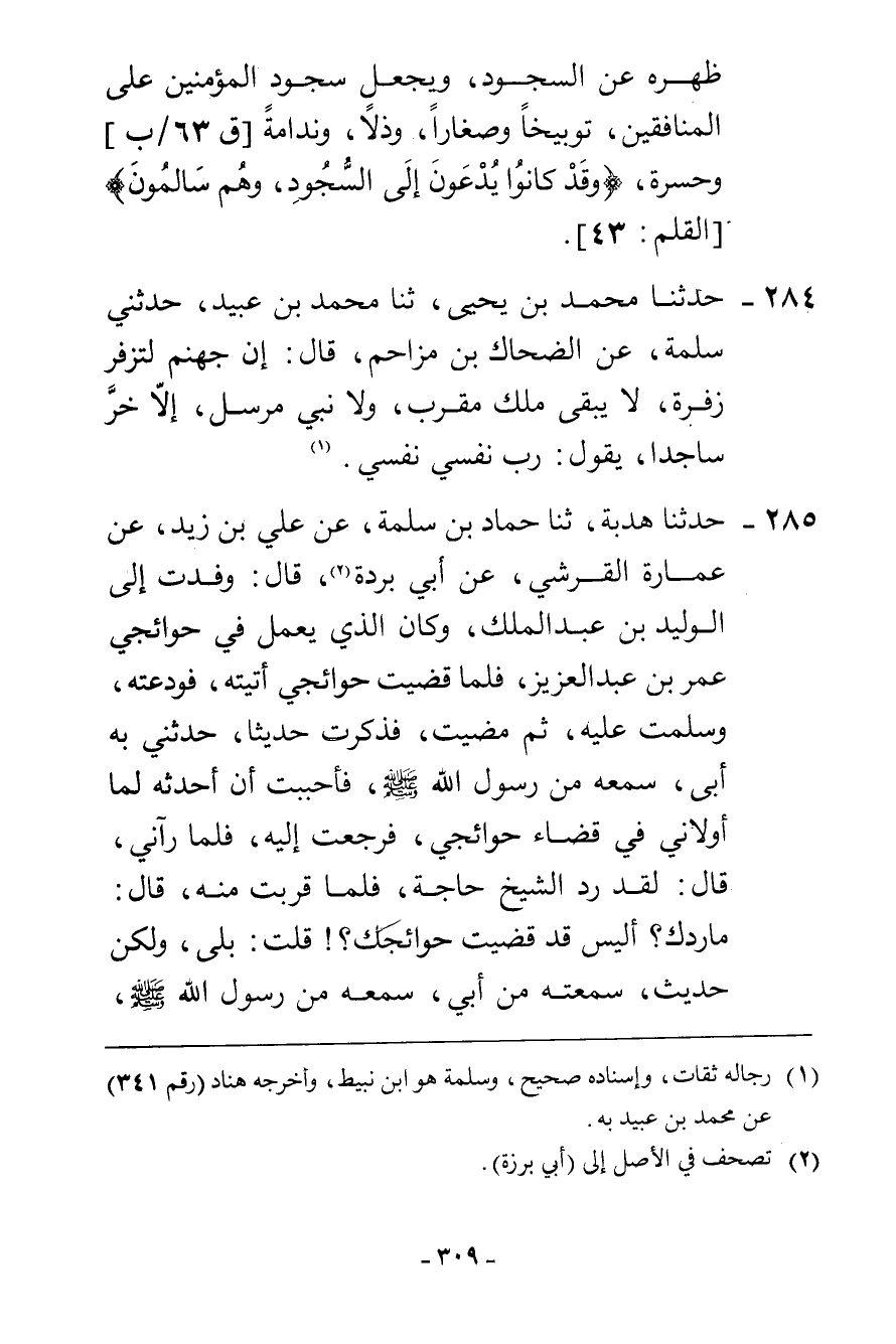 285 - حَدَّثَنَا هُدْبَةُ، ثنا حَمَّادُ بْنُ سَلَمَةَ، عَنْ عَلِيِّ بْنِ زَيْدٍ، عَنْ عُمَارَةَ الْقُرَشِيِّ، عَنْ أَبِي بُرْدَةَ، قَالَ: وَفَدْتُ إِلَى الْوَلِيدِ بْنِ عَبْدِ الْمَلِكِ، وَكَانَ الَّذِي يَعْمَلُ فِي حَوَائِجِي عُمَرُ بْنُ عَبْدِ الْعَزِيزِ، فَلَمَّا قَضَيْتُ حَوَائِجِي أَتَيْتُهُ فَوَدَّعْتُهُ، وَسَلَّمْتُ عَلَيْهِ ثُمَّ مَضَيْتُ، فَذَكَرْتُ حَدِيثًا حَدَّثَنِي بِهِ أَبِي، سَمِعَهُ مِنْ رَسُولِ اللَّهِ صَلَّى اللهُ عَلَيْهِ وَسَلَّمَ، فَأَحْبَبْتُ أَنْ أُحَدِّثَهُ: لِمَا أَوْلَانِي فِي قَضَاءِ حَوَائِجِي، فَرَجَعْتُ إِلَيْهِ، فَلَمَّا رَآنِي قَالَ: لَقَدْ رَدَّ الشَّيْخُ حَاجَةً، فَلَمَّا قُرِّبْتُ مِنْهُ قَالَ: مَا رَدَّكَ، أَلَيْسَ قَدْ قَضَيْتُ حَوَائِجَكَ؟ قُلْتُ: بَلَى، وَلَكِنْ حَدِيثٌ سَمِعْتُهُ مِنْ أَبِي، سَمِعَهُ مِنْ رَسُولِ اللَّهِ صَلَّى اللهُ عَلَيْهِ وَسَلَّمَ -[310]-، فَأَحْبَبْتُ أَنْ أُحَدِّثَكَ بِهِ لِمَا أَوْلَيْتَنِي، قَالَ: وَمَا هُوَ؟ قُلْتُ: حَدَّثَنِي أَبِي قَالَ: سَمِعْتُ رَسُولَ اللَّهِ صَلَّى اللهُ عَلَيْهِ وَسَلَّمَ يَقُولُ: " §إِذَا كَانَ يَوْمُ الْقِيَامَةِ مُثِّلَ لِكُلِّ قَوْمٍ مَا كَانُوا يَعْبُدُونَ فِي الدُّنْيَا، فَذَهَبَ كُلُّ قَوْمٍ إِلَى مَا كَانُوا يَعْبُدُونَ فِي الدُّنْيَا، وَيَبْقَى أَهْلُ التَّوْحِيدِ، فَيُقَالُ لَهُمْ: مَا يَنْتَظِرُونَ وَقَدْ ذَهَبَ النَّاسُ؟ فَيَقُولُونَ: إِنَّ لَنَا رَبًّا كُنَّا نَعْبُدُهُ فِي الدُّنْيَا، لَمَّا نَرَاهُ، قَالَ: وَتَعْرِفُونَهُ إِذَا رَأَيْتُمُوهُ؟ فَيَقُولُونَ: نَعَمْ، فَيُقَالُ لَهُمْ: وَكَيْفَ تَعْرِفُونَهُ وَلَمْ تَرَوْهُ؟ قَالُوا: إِنَّهُ لَا شِبْهَ لَهُ، فَيُكْشَفُ لَهُمْ عَنِ الْحِجَابِ، فَيَنْظُرُونَ إِلَى اللَّهِ تَبَارَكَ وَتَعَالَى، فَيَخِرُّونَ لَهُ سُجَّدًا، وَتَبْقَى أَقْوَامٌ فِي ظُهُورِهِمْ مِثْلُ صَيَاصِيِّ الْبَقَرِ، فَيُرِيدُونَ السُّجُودَ فَلَا يَسْتَطِيعُونَ، فَيَقُولُ اللَّهُ: «عِبَادِي ارْفَعُوا رُءُوسَكُمْ فَقَدْ جَعَلْتُ بَدَلَ كُلِّ رَجُلٍ مِنْكُمْ رَجُلًا مِنَ الْيَهُودِ وَالنَّصَارَى فِي النَّارِ» ، فَقَالَ عُمَرُ بْنُ عَبْدِ الْعَزِيزِ: وَاللَّهِ الَّذِي لَا إِلَهَ إِلَّا هُوَ لَحَدَّثَكَ أَبُوكَ هَذَا الْحَدِيثَ سَمِعَهُ مِنْ رَسُولِ اللَّهِ صَلَّى اللهُ عَلَيْهِ وَسَلَّمَ؟ فَحَلَفَ لَهُ ثَلَاثَةَ أَيْمَانٍ عَلَى ذَلِكَ، فَقَالَ عُمَرُ بْنُ عَبْدِ الْعَزِيزِ: مَا سَمِعْتُ فِي أَهْلِ التَّوْحِيدِ بِحَدِيثٍ هُوَ أَحَبُّ إِلَيَّ مِنْ هَذَا