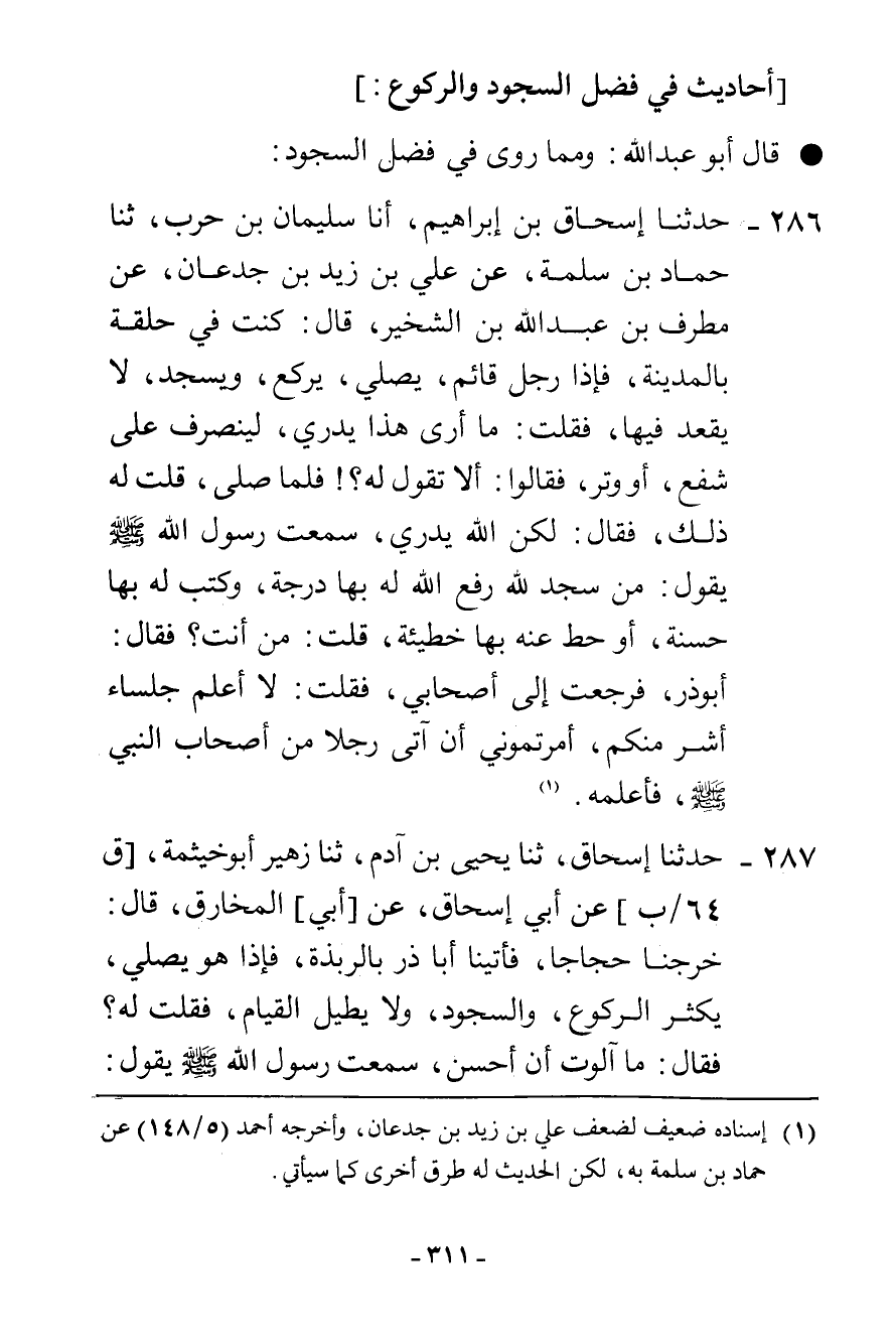 286 - حَدَّثَنَا إِسْحَاقُ بْنُ إِبْرَاهِيمَ، أَنَا سُلَيْمَانُ بْنُ حَرْبٍ، ثنا حَمَّادُ بْنُ سَلَمَةَ، عَنْ عَلِيِّ بْنِ زَيْدِ بْنِ جُدْعَانَ، عَنْ مُطَرِّفِ بْنِ عَبْدِ اللَّهِ بْنِ الشِّخِّيرِ، قَالَ: كُنْتُ فِي حَلْقَةٍ بِالْمَدِينَةِ، فَإِذَا رَجُلٌ قَائِمٌ يُصَلِّي، يَرْكَعُ وَيَسْجُدُ لَا يَقْعُدُ فِيهَا، فَقُلْتُ: مَا أَرَى هَذَا يَدْرِي، لِيَنْصَرِفْ عَلَى شَفْعٍ أَوْ وِتْرٍ، فَقَالُوا: أَلَا تَقُولُ لَهُ؟ فَلَمَّا صَلَّى قُلْتُ لَهُ ذَلِكَ فَقَالَ: لَكِنَّ اللَّهَ يَدْرِي، سَمِعْتُ رَسُولَ اللَّهِ صَلَّى اللهُ عَلَيْهِ وَسَلَّمَ يَقُولُ: «§مَنْ سَجَدَ لِلَّهِ رَفَعَ اللَّهُ لَهُ بِهَا دَرَجَةً، وَكَتَبَ لَهُ بِهَا حَسَنَةً، أَوْ حَطَّ عَنْهُ بِهَا خَطِيئَةً» قُلْتُ: مَنْ أَنْتَ؟ فَقَالَ: أَبُو ذَرٍّ، فَرَجَعْتُ إِلَى أَصْحَابِي فَقُلْتُ: لَا أَعْلَمُ جُلَسَاءَ أَشَرَّ مِنْكُمْ، أَمَرْتُمُونِي أَنْ آتِيَ رَجُلًا مِنْ أَصْحَابِ النَّبِيِّ صَلَّى اللهُ عَلَيْهِ وَسَلَّمَ فَأُعَلِّمَهُ "