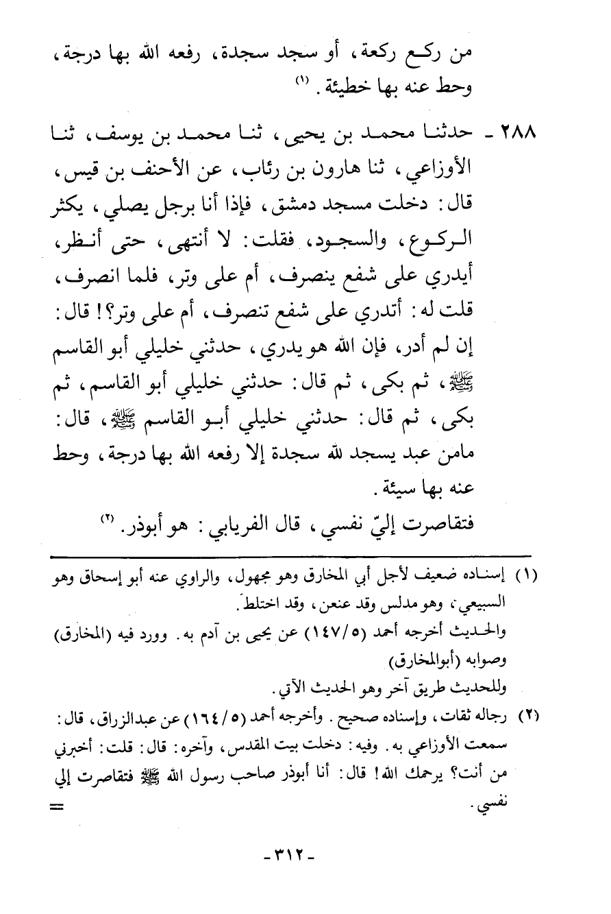 288 - حَدَّثَنَا مُحَمَّدُ بْنُ يَحْيَى، ثنا مُحَمَّدُ بْنُ يُوسُفَ، ثنا الْأَوْزَاعِيُّ، ثنا هَارُونُ بْنُ رِئَابٍ، عَنِ الْأَحْنَفِ بْنِ قَيْسٍ، قَالَ: دَخَلْتُ مَسْجِدَ دِمَشْقَ، فَإِذَا أَنَا بِرَجُلٍ يُصَلِّي، يُكْثِرُ الرُّكُوعَ وَالسُّجُودَ، فَقُلْتُ: لَا أَنْتَهِي حَتَّى أَنْظُرَ أَيَدْرِي عَلَى شَفْعٍ يَنْصَرِفُ أَمْ عَلَى وِتْرٍ، فَلَمَّا انْصَرَفَ قُلْتُ لَهُ: أَتَدْرِي عَلَى شَفْعٍ تَنْصَرِفُ أَمْ عَلَى وِتْرٍ؟ قَالَ: إِنْ لَمْ أَدْرِ فَإِنَّ اللَّهَ هُوَ يَدْرِي، حَدَّثَنِي خَلِيلِي أَبُو الْقَاسِمِ صَلَّى اللهُ عَلَيْهِ وَسَلَّمَ، ثُمَّ بَكَى، ثُمَّ قَالَ: حَدَّثَنِي خَلِيلِي أَبُو الْقَاسِمِ، ثُمَّ بَكَى، ثُمَّ قَالَ: حَدَّثَنِي خَلِيلِي أَبُو الْقَاسِمِ صَلَّى اللهُ عَلَيْهِ وَسَلَّمَ قَالَ: «§مَا مِنْ عَبْدٍ يَسْجُدُ لِلَّهِ سَجْدَةً إِلَّا رَفَعَهُ اللَّهُ بِهَا دَرَجَةً، وَحَطَّ عَنْهُ بِهَا سَيِّئَةً» فَتَقَاصَرَتْ إِلَيَّ نَفْسِي، قَالَ الْفِرْيَابِيُّ: هُوَ أَبُو ذَرٍّ