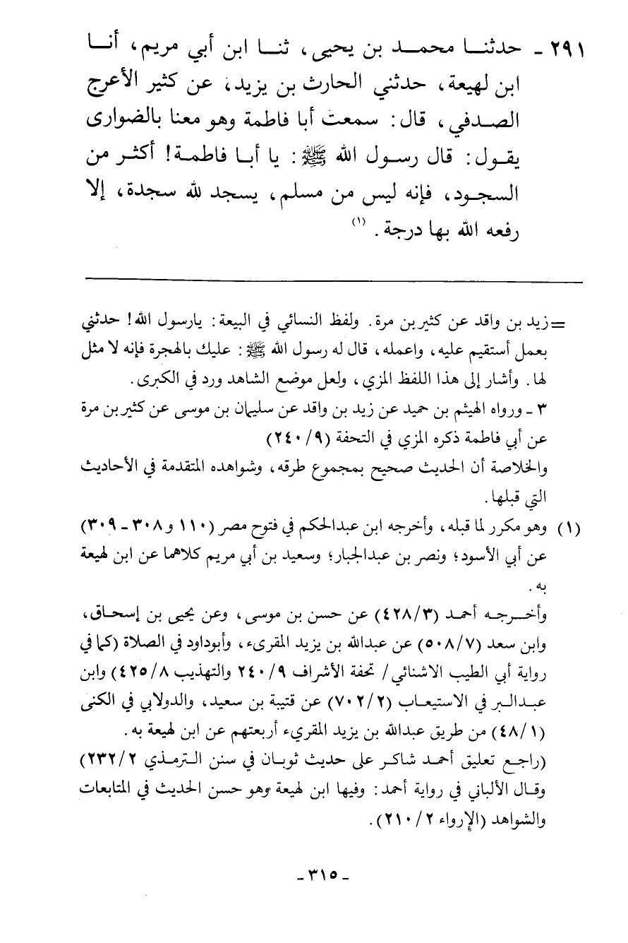 291 - حَدَّثَنَا مُحَمَّدُ بْنُ يَحْيَى، ثنا ابْنُ أَبِي مَرْيَمَ، أَنَا ابْنُ لَهِيعَةَ، حَدَّثَنِي الْحَارِثُ بْنُ يَزِيدَ، عَنْ كَثِيرٍ الْأَعْرَجِ الصَّدَفِيِّ، قَالَ: سَمِعْتُ أَبَا فَاطِمَةَ، وَهُوَ مَعَنَا بِالضَّوَارِي يَقُولُ: قَالَ رَسُولُ اللَّهِ صَلَّى اللهُ عَلَيْهِ وَسَلَّمَ: «يَا أَبَا فَاطِمَةَ، §أَكْثِرْ مِنَ السُّجُودِ، فَإِنَّهُ لَيْسَ مِنْ مُسْلِمٍ يَسْجُدُ لِلَّهِ سَجْدَةً إِلَّا رَفَعَهُ اللَّهُ بِهَا دَرَجَةً»