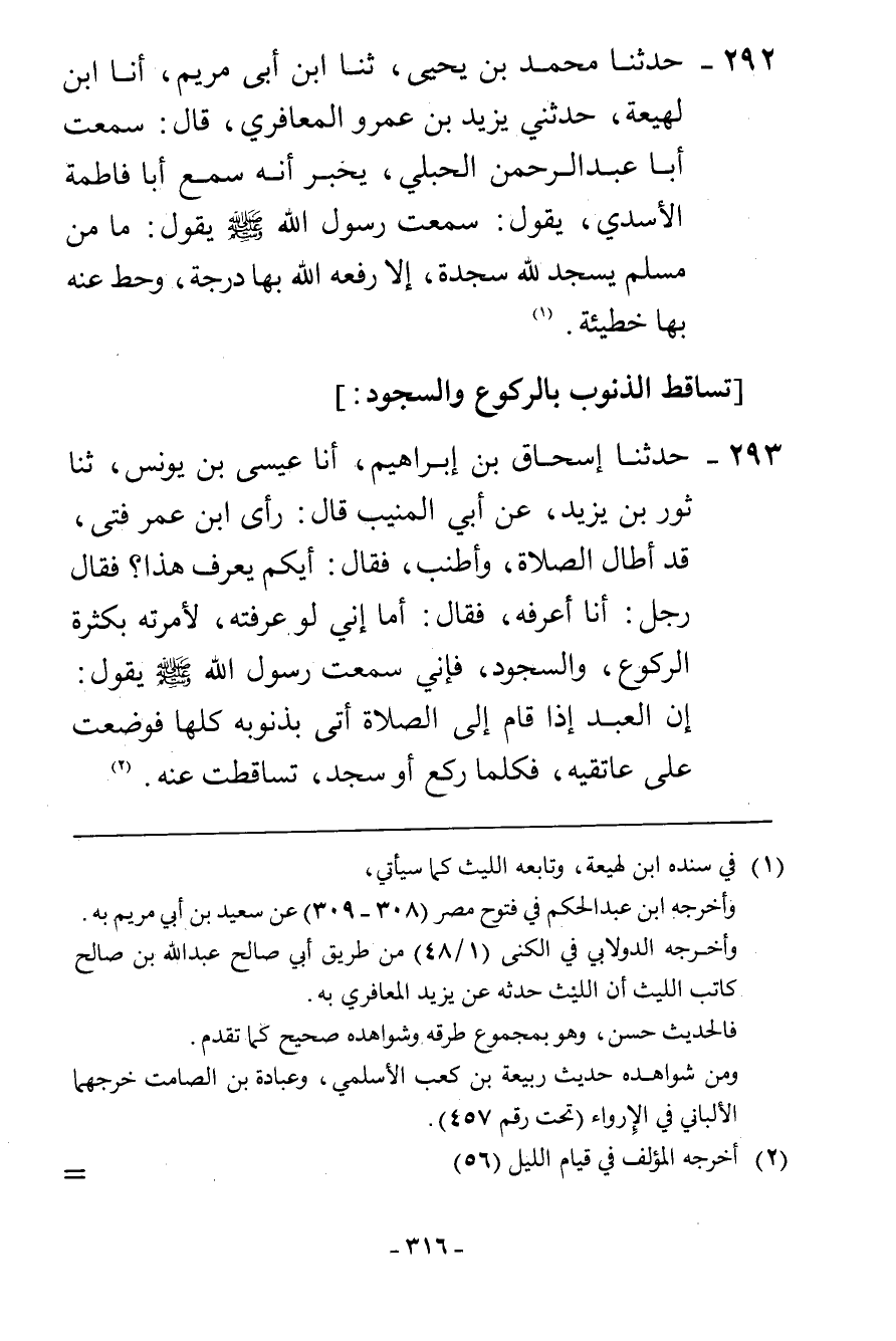 292 - حَدَّثَنَا مُحَمَّدُ بْنُ يَحْيَى، ثنا ابْنُ أَبِي مَرْيَمَ، أَنَا ابْنُ لَهِيعَةَ، حَدَّثَنِي يَزِيدُ بْنُ عَمْرٍو الْمَعَافِرِيُّ، قَالَ: سَمِعْتُ أَبَا عَبْدِ الرَّحْمَنِ الْحُبُلِيَّ يُخْبِرُ أَنَّهُ سَمِعَ أَبَا فَاطِمَةَ الْأَزْدِيَّ، يَقُولُ: سَمِعْتُ رَسُولَ اللَّهِ صَلَّى اللهُ عَلَيْهِ وَسَلَّمَ يَقُولُ: «§مَا مِنْ مُسْلِمٍ يَسْجُدُ لِلَّهِ سَجْدَةً إِلَّا رَفَعَهُ اللَّهُ بِهَا دَرَجَةً، وَحَطَّ عَنْهُ بِهَا خَطِيئَةً»