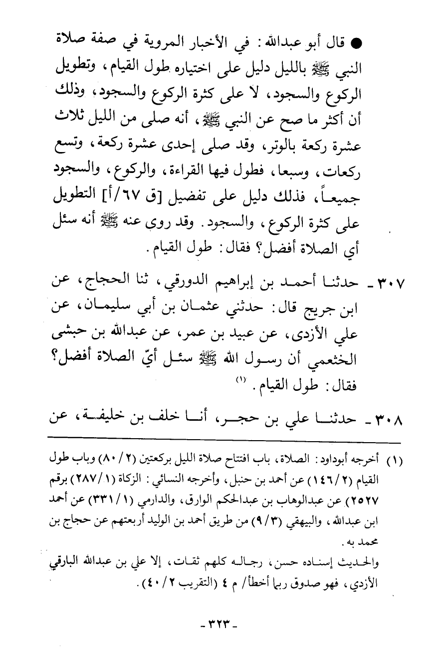 307 - حَدَّثَنَا أَحْمَدُ بْنُ إِبْرَاهِيمَ الدَّوْرَقِيُّ، ثنا الْحَجَّاجُ، عَنِ ابْنِ جُرَيْجٍ، قَالَ: حَدَّثَنِي عُثْمَانُ بْنُ أَبِي سُلَيْمَانَ، عَنْ عَلِيٍّ الْأَزْدِيِّ، عَنْ عُبَيْدِ بْنِ عُمَرَ، عَنْ عَبْدِ اللَّهِ بْنِ حُبْشِيٍّ الْخَثْعَمِيِّ، أَنَّ رَسُولَ اللَّهِ صَلَّى اللهُ عَلَيْهِ وَسَلَّمَ سُئِلَ: §أَيُّ الصَّلَاةِ أَفْضَلُ؟ فَقَالَ: «طُولُ الْقِيَامِ»