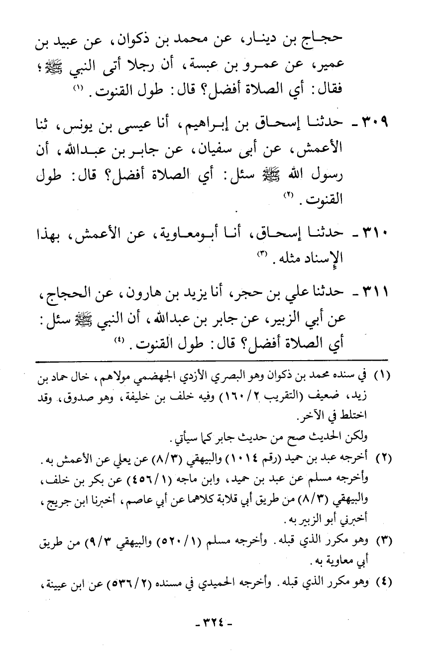 311 - حَدَّثَنَا عَلِيُّ بْنُ حُجْرٍ، أَنَا يَزِيدُ بْنُ هَارُونَ، عَنِ الْحَجَّاجِ، عَنْ أَبِي الزُّبَيْرِ، عَنْ جَابِرِ بْنِ عَبْدِ اللَّهِ، أَنَّ النَّبِيَّ صَلَّى اللهُ عَلَيْهِ وَسَلَّمَ سُئِلَ: §أَيُّ الصَّلَاةِ أَفْضَلُ " قَالَ: «طُولُ الْقُنُوتِ»