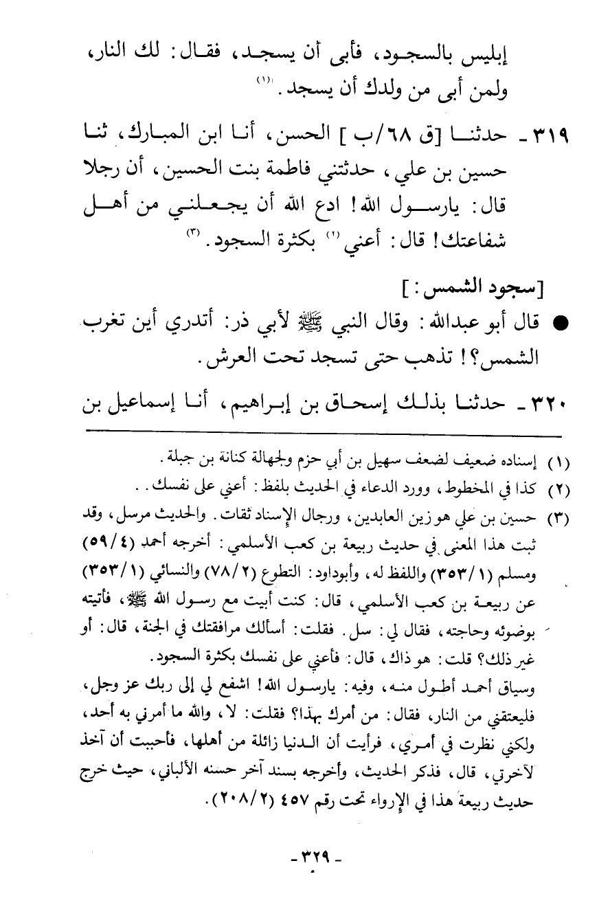 319 - حَدَّثَنَا الْحَسَنُ، أَنَا ابْنُ الْمُبَارَكِ، ثنا حُسَيْنُ بْنُ عَلِيٍّ، حَدَّثَتْنِي فَاطِمَةُ بِنْتُ الْحُسَيْنِ، أَنَّ رَجُلًا، قَالَ: يَا رَسُولَ اللَّهِ، ادْعُ اللَّهَ أَنْ يَجْعَلَنِي مِنْ أَهْلِ شَفَاعَتِكَ، قَالَ: «§أَعِنِّي بِكَثْرَةِ السُّجُودِ»