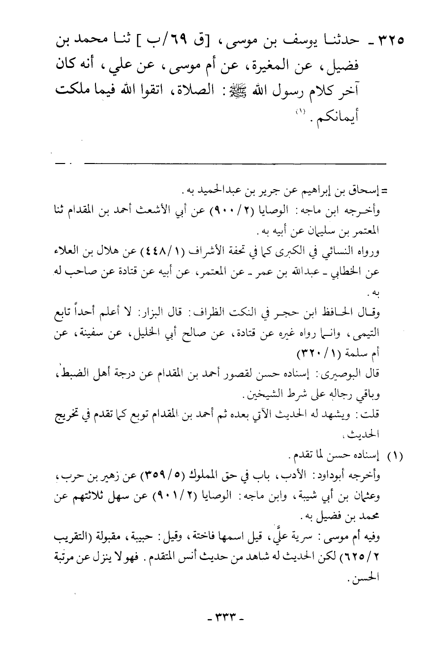 325 - حَدَّثَنَا يُوسُفُ بْنُ مُوسَى، ثنا مُحَمَّدُ بْنُ فُضَيْلٍ، عَنِ الْمُغِيرَةِ، عَنْ أُمِّ مُوسَى، عَنْ عَلِيٍّ، أَنَّهُ كَانَ آخِرُ كَلَامِ رَسُولِ اللَّهِ صَلَّى اللهُ عَلَيْهِ وَسَلَّمَ: «§الصَّلَاةَ، اتَّقُوا اللَّهَ فِيمَا مَلَكَتْ أَيْمَانُكُمْ»