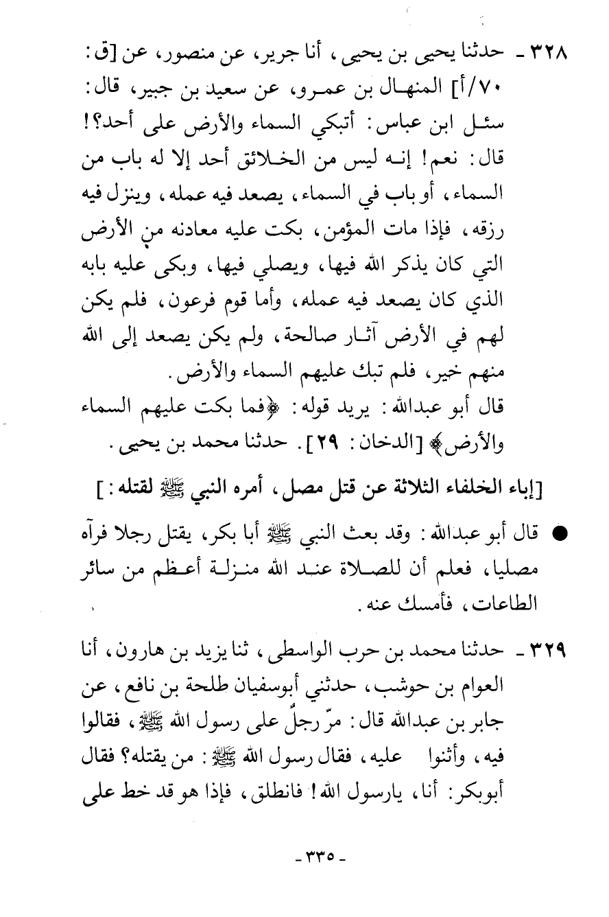 328 - حَدَّثَنَا يَحْيَى بْنُ يَحْيَى، أَنَا جَرِيرٌ، عَنْ مَنْصُورٍ، عَنِ الْمِنْهَالِ بْنِ عَمْرٍو، عَنْ سَعِيدِ بْنِ جُبَيْرٍ، قَالَ: سُئِلَ ابْنُ عَبَّاسٍ: §أَتَبْكِي السَّمَاءُ وَالْأَرْضُ عَلَى أَحَدٍ؟ قَالَ: «نَعَمْ، إِنَّهُ لَيْسَ مِنَ الْخَلَائِقِ أَحَدٌ إِلَّا لَهُ بَابٌ مِنَ السَّمَاءِ أَوْ بَابٌ فِي السَّمَاءِ، يَصْعَدُ فِيهِ عَمَلُهُ وَيَنْزِلُ فِيهِ رِزْقُهُ، فَإِذَا مَاتَ الْمُؤْمِنُ بَكَتْ عَلَيْهِ مَعَادِنُهُ مِنَ الْأَرْضِ الَّتِي كَانَ يَذْكُرُ اللَّهَ فِيهَا وَيُصَلِّي فِيهَا، وَبَكَى عَلَيْهِ بَابُهُ الَّذِي كَانَ يَصْعَدُ فِيهِ عَمَلُهُ، وَأَمَّا قَوْمُ فِرْعَوْنَ فَلَمْ يَكُنْ لَهُمْ فِي الْأَرْضِ آثَارٌ صَالِحَةٌ، وَلَمْ يَكُنْ يَصْعَدُ إِلَى اللَّهِ مِنْهُمْ خَيْرٌ، فَلَمْ تَبْكِ عَلَيْهِمُ السَّمَاءُ وَالْأَرْضُ» قَالَ أَبُو عَبْدِ اللَّهِ: يُرِيدُ قَوْلَهُ: {فَمَا بَكَتْ عَلَيْهِمُ السَّمَاءُ وَالْأَرْضُ} [الدخان: 29] حَدَّثَنَا مُحَمَّدُ بْنُ يَحْيَى