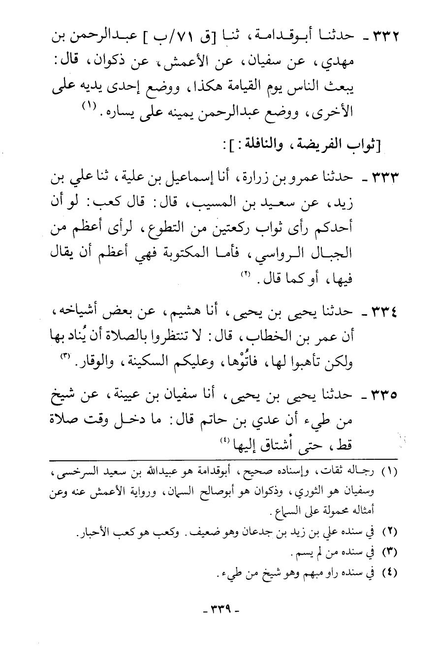 332 - حَدَّثَنَا أَبُو قُدَامَةَ، ثنا عَبْدُ الرَّحْمَنِ بْنُ مَهْدِيٍّ، عَنْ سُفْيَانَ، عَنِ الْأَعْمَشِ، عَنْ ذَكْوَانَ، قَالَ: §يُبْعَثُ النَّاسُ يَوْمَ الْقِيَامَةِ هَكَذَا، وَوَضَعَ إِحْدَى يَدَيْهِ عَلَى الْأُخْرَى، وَوَضَعَ عَبْدُ الرَّحْمَنِ يَمِينَهَ عَلَى يَسَارِهِ
