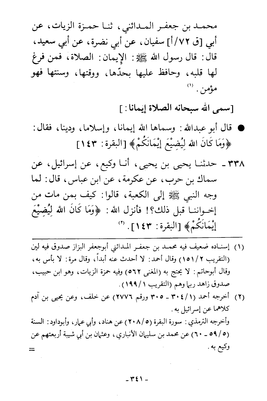 338 - حَدَّثَنَا يَحْيَى بْنُ يَحْيَى، أَنَا وَكِيعٌ، عَنْ إِسْرَائِيلَ، عَنْ سِمَاكِ بْنِ حَرْبٍ، عَنْ عِكْرِمَةَ، عَنِ ابْنِ عَبَّاسٍ، قَالَ: لَمَّا وَجَّهَ النَّبِيُّ صَلَّى اللهُ عَلَيْهِ وَسَلَّمَ إِلَى الْكَعْبَةِ قَالُوا: §كَيْفَ بِمَنْ مَاتَ مِنْ إِخْوَانِنَا قَبْلَ ذَلِكَ؟ فَأَنْزَلَ اللَّهُ {وَمَا كَانَ اللَّهُ لِيُضِيعَ إِيمَانَكُمْ} [البقرة: 143] "