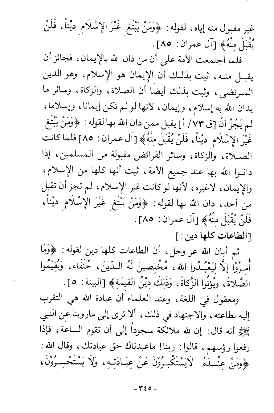 §الطَّاعَاتُ كُلُّهَا دِينٌ ثُمَّ أَبَانَ اللَّهُ عَزَّ وَجَلَّ أَنَّ الطَّاعَاتِ كُلَّهَا دِينٌ لِقَوْلِهِ {وَمَا أُمِرُوا إِلَّا لِيَعْبُدُوا اللَّهَ مُخْلِصِينَ لَهُ الدِّينَ حُنَفَاءَ وَيُقِيمُوا الصَّلَاةَ وَيُؤْتُوا الزَّكَاةَ وَذَلِكَ دِينُ الْقَيِّمَةِ} [البينة: 5] وَمَعْقُولٌ فِي اللُّغَةِ وَعِنْدَ الْعُلَمَاءِ أَنَّ عِبَادَةَ اللَّهِ هِيَ التَّقَرُّبُ إِلَيْهِ بِطَاعَتِهِ، وَالِاجْتِهَادُ فِي ذَلِكَ، أَلَا تَرَى إِلَى مَا رُوِّينَا عَنِ النَّبِيِّ صَلَّى اللهُ عَلَيْهِ وَسَلَّمَ أَنَّهُ قَالَ: " إِنَّ لِلَّهِ مَلَائِكَةً سُجُودًا إِلَى أَنْ تَقُومَ السَّاعَةُ، فَإِذَا رَفَعُوا رُءُوسَهُمْ قَالُوا: رَبَّنَا مَا عَبَدْنَاكَ حَقَّ عِبَادَتِكَ، وَقَالَ اللَّهُ: {وَمَنْ عِنْدَهُ لَا يَسْتَكْبِرُونَ عَنْ عِبَادَتِهِ وَلَا يَسْتَحْسِرُونَ -[346]- يُسَبِّحُونَ اللَّيْلَ وَالنَّهَارَ لَا يَفْتُرُونَ} [الأنبياء: 20]