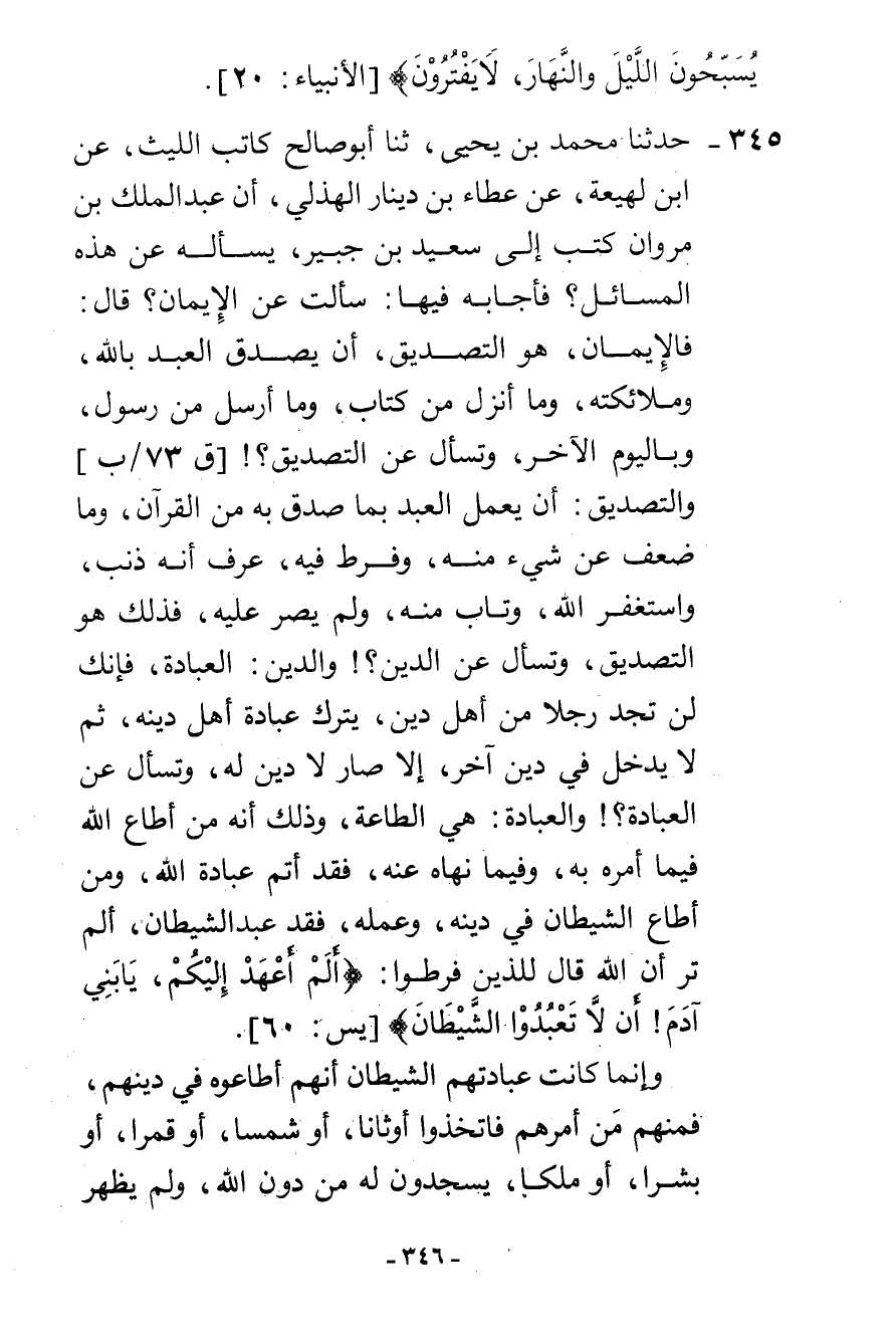 345 - حَدَّثَنَا مُحَمَّدُ بْنُ يَحْيَى، ثنا أَبُو صَالِحٍ، كَاتَبُ اللَّيْثِ، عَنِ ابْنِ لَهِيعَةَ، عَنْ عَطَاءِ بْنِ دِينَارٍ الْهُذَلِيِّ، أَنَّ عَبْدَ الْمَلِكِ بْنَ مَرْوَانَ، كَتَبَ إِلَى سَعِيدِ بْنِ جُبَيْرٍ يَسْأَلُهُ عَنْ هَذِهِ الْمَسَائِلِ، فَأَجَابَهُ فِيهَا: " §سَأَلْتَ عَنِ الْإِيمَانِ، قَالَ: فَالْإِيمَانُ هُوَ التَّصْدِيقُ، أَنْ يُصَدِّقَ الْعَبْدُ بِاللَّهِ وَمَلَائِكَتِهِ وَمَا أُنْزِلَ مِنْ كِتَابٍ، وَمَا أُرْسِلَ مِنْ رَسُولٍ، وَبِالْيَوْمِ الْآخِرِ، وَتَسْأَلُ عَنِ التَّصْدِيقِ: وَالتَّصْدِيقُ أَنْ يَعْمَلَ الْعَبْدُ بِمَا صَدَّقَ بِهِ مِنَ الْقُرْآنِ، وَمَا ضَعُفَ عَنْ شَيْءٍ مِنْهُ وَفَرَّطَ فِيهِ عَرَفَ أَنَّهُ ذَنْبٌ، وَاسْتَغْفَرَ اللَّهَ، وَتَابَ مِنْهُ وَلَمْ يُصِرَّ عَلَيْهِ، فَذَلِكَ هُوَ التَّصْدِيقُ، وَتَسْأَلُ عَنِ الدِّينِ: وَالدِّينُ الْعِبَادَةُ، فَإِنَّكَ لَنْ تَجِدَ رَجُلًا مِنْ أَهْلِ دِينٍ يَتْرُكَ عِبَادَةَ أَهْلِ دِينِهِ، ثُمَّ لَا يَدْخُلُ فِي دِينٍ آخَرَ إِلَّا صَارَ لَا دِينَ لَهُ، وَتَسْأَلُ عَنِ الْعِبَادَةِ: وَالْعِبَادَةُ هِيَ الطَّاعَةُ، وَذَلِكَ أَنَّهُ مَنْ أَطَاعَ اللَّهَ فِيمَا أَمَرَهُ بِهِ وَفِيمَا نَهَاهُ عَنْهُ فَقَدْ أَتَمَّ عِبَادَةَ اللَّهِ، وَمَنْ أَطَاعَ الشَّيْطَانَ فِي دِينِهِ وَعَمَلِهِ فَقَدْ عَبَدَ الشَّيْطَانَ، أَلَمْ تَرَ أَنَّ اللَّهَ قَالَ لِلَّذِينَ فَرَّطُوا: {أَلَمْ أَعْهَدْ إِلَيْكُمْ يَا بَنِي آدَمَ أَنْ لَا تَعْبُدُوا الشَّيْطَانَ} [يس: 60] وَإِنَّمَا كَانَتْ عِبَادَتُهُمُ الشَّيْطَانَ أَنَّهُمْ أَطَاعُوهُ فِي دِينِهِمْ، فَمِنْهُمْ مَنْ أَمَرَهُمْ فَاتَّخَذُوا أَوْثَانًا أَوْ شَمْسًا أَوْ قَمَرًا أَوْ بَشَرًا أَوْ مَلَكًا يَسْجُدُونَ لَهُ مِنْ دُونِ اللَّهِ، وَلَمْ يَظْهَرِ -[347]- الشَّيْطَانُ لِأَحَدٍ مِنْهُمْ، فَيَتَعَبَّدْ لَهُ، أَوْ يَسْجُدْ لَهُ، وَلَكِنَّهُمْ أَطَاعُوهُ فَاتَّخَذُوهَا آلِهَةً مِنْ دُونِ اللَّهِ، فَلَمَّا جُمِعُوا جَمِيعًا يَوْمَ الْقِيَامَةِ فِي النَّارِ قَالَ لَهُمُ الشَّيْطَانُ: {إِنِّي كَفَرْتُ بِمَا أَشْرَكْتُمُونِ مِنْ قَبْلُ} [إبراهيم: 22] ، {إِنَّكُمْ وَمَا تَعْبُدُونَ مِنْ دُونِ اللَّهِ حَصَبُ جَهَنَّمَ أَنْتُمْ لَهَا وَارِدُونَ} [الأنبياء: 98] فَعُبِدَ عِيسَى وَالْمَلَائِكَةُ مِنْ دُونِ اللَّهِ فَلَمْ يَجْعَلْهُمُ اللَّهُ فِي النَّارِ، فَلَيْسَ لِلشَّمْسِ وَالْقَمَرِ ذَنْبٌ، وَذَلِكَ يَصِيرُ إِلَى طَاعَةِ الشَّيْطَانِ، فَيَجْعَلُهُمْ مَعَهُمْ، فَذَلِكَ قَوْلُهُ حِينَ تَقَرَّبُوا مِنْهُمْ: {تَالَلَّهِ إِنْ كُنَّا لَفِي ضَلَالٍ مُبِينٍ إِذْ نُسَوِّيكُمْ بِرَبِّ الْعَالَمِينَ} [الشعراء: 98] وَقَالَتِ الْمَلَائِكَةُ حِينَ سَأَلَهُمُ اللَّهُ: {أَهَؤُلَاءِ إِيَّاكُمْ كَانُوا يَعْبُدُونَ قَالُوا سُبْحَانَكَ أَنْتَ وَلِيُّنَا مِنْ دُونِهِمْ بَلْ كَانُوا يَعْبُدُونَ الْجِنَّ أَكْثَرُهُمْ بِهِمْ مُؤْمِنُونَ} [سبأ: 40] قَالَ: أَفَلَا تَرَى إِلَى عِبَادَتِهِمُ الْجِنَّ إِنَّمَا هِيَ أَنَّهُمْ أَطَاعُوهُ فِي عِبَادَةِ غَيْرِ اللَّهِ، فَيَصِيرُ الْعِبَادَةُ إِلَى أَنَّهَا طَاعَةٌ "