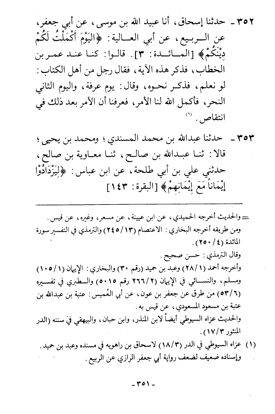 353 - حَدَّثَنَا عَبْدُ اللَّهِ بْنُ مُحَمَّدٍ الْمُسْنَدِيُّ، وَمُحَمَّدُ بْنُ يَحْيَى، قَالَا: ثنا عَبْدُ اللَّهِ بْنُ صَالِحٍ، ثنا مُعَاوِيَةُ بْنُ صَالِحٍ، حَدَّثَنِي عَلِيُّ بْنُ أَبِي طَلْحَةَ، عَنِ ابْنِ عَبَّاسٍ، {§لِيَزْدَادُوا إِيمَانًا مَعَ إِيمَانِهِمْ} [الفتح: 4]
