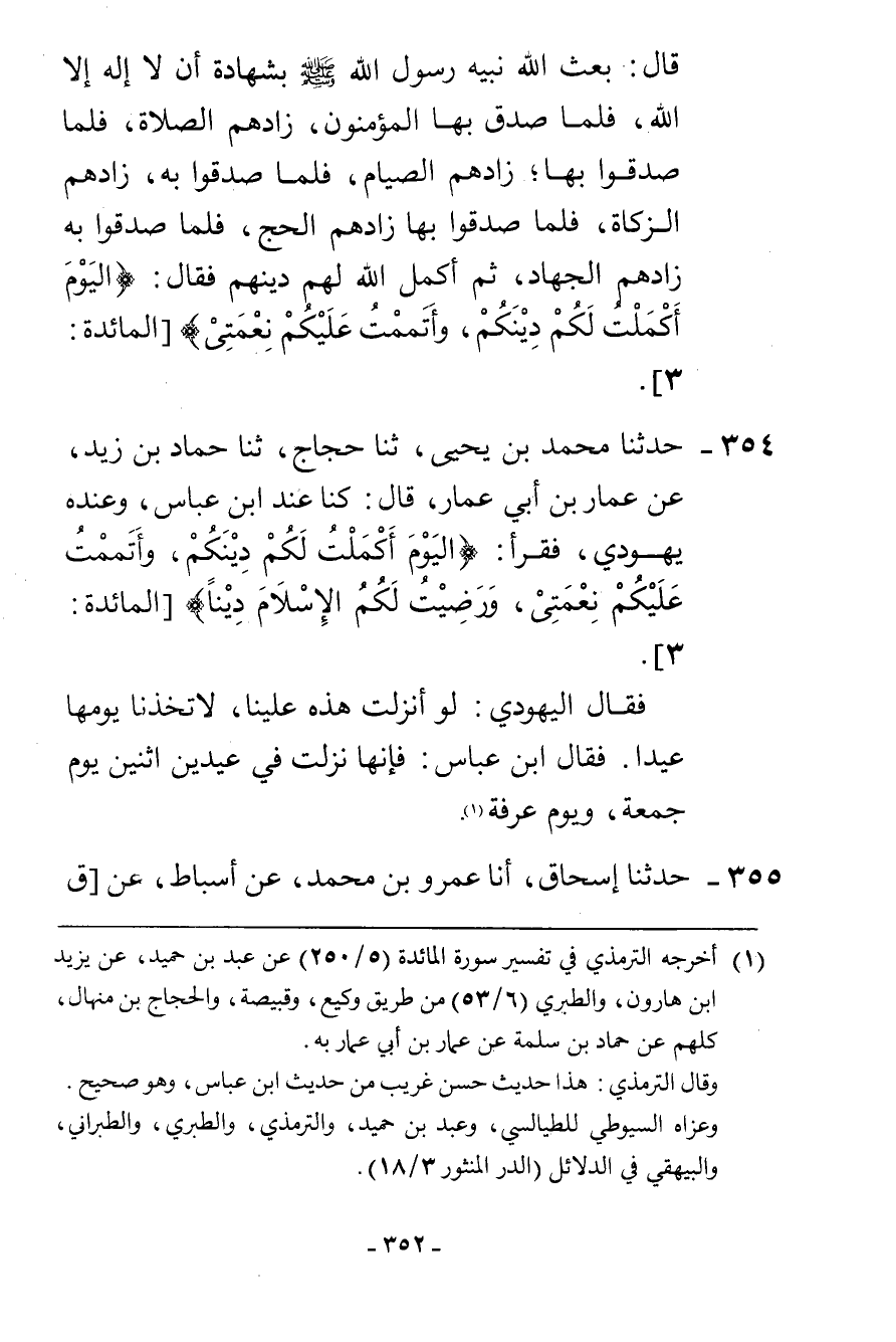 354 - حَدَّثَنَا مُحَمَّدُ بْنُ يَحْيَى، ثنا حَجَّاجٌ، ثنا حَمَّادُ بْنُ زَيْدٍ، عَنْ عَمَّارِ بْنِ أَبِي عَمَّارٍ، قَالَ: كُنَّا عِنْدَ ابْنِ عَبَّاسٍ وَعِنْدَهُ يَهُودِيُّ فَقَرَأَ " {§الْيَوْمَ أَكْمَلْتُ لَكُمْ دِينَكُمْ وَأَتْمَمْتُ عَلَيْكُمْ نِعْمَتِي وَرَضِيتُ لَكُمُ الْإِسْلَامَ دِينًا} [المائدة: 3] فَقَالَ الْيَهُودِيُّ: لَوْ أُنْزِلَتْ هَذِهِ عَلَيْنَا لَاتَّخَذْنَا يَوْمَهَا عِيدًا، فَقَالَ ابْنُ عَبَّاسٍ: " فَإِنَّهَا نَزَلَتْ فِي عِيدَيْنِ اثْنَيْنِ: يَوْمِ جُمُعَةٍ وَيَوْمِ عَرَفَةَ "