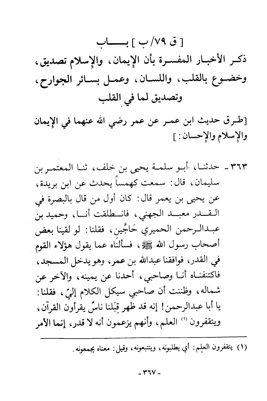 363 - حَدَّثَنَا أَبُو سَلَمَةَ يَحْيَى بْنُ خَلَفٍ، ثنا الْمُعْتَمِرُ بْنُ سُلَيْمَانَ، قَالَ: سَمِعْتُ كَهْمَسًا، يُحَدِّثُ، عَنِ ابْنِ بُرَيْدَةَ، عَنْ يَحْيَى بْنِ يَعْمَرَ، قَالَ: كَانَ أَوَّلَ مَنْ قَالَ بِالْبَصْرَةِ فِي الْقَدَرِ مَعْبَدٌ الْجُهَنِيُّ، فَانْطَلَقْتُ أَنَا وَحُمَيْدُ بْنُ عَبْدِ الرَّحْمَنِ الْحِمْيَرِيُّ حَاجَّيْنِ فَقُلْنَا: لَوْ لَقِينَا بَعْضَ أَصْحَابِ رَسُولِ اللَّهِ صَلَّى اللهُ عَلَيْهِ وَسَلَّمَ فَسَأَلْنَاهُ عَمَّا يَقُولُ هَؤُلَاءِ الْقَوْمِ فِي الْقَدَرِ، فَوَافَقْنَا عَبْدَ اللَّهِ بْنَ عُمَرَ وَهُوَ يَدْخُلُ الْمَسْجِدَ فَاكْتَنَفْنَاهُ أَنَا وَصَاحِبِي، أَحَدُنَا عَنْ يَمِينِهِ، وَالْآخَرُ عَنْ شِمَالِهِ، وَظَنَنْتُ أَنَّ صَاحِبِي سَيَكِلُ الْكَلَامَ إِلَيَّ فَقُلْنَا: يَا أَبَا عَبْدِ الرَّحْمَنِ، إِنَّهُ قَدْ ظَهَرَ قِبَلَنَا نَاسٌ يَقْرَءُونَ الْقُرْآنَ وَيَتَقَفَّرُونَ الْعِلْمَ، وإِنَّهُمْ يَزْعُمُونَ أَنَّهُ لَا قَدَرَ، إِنَّمَا الْأَمْرُ -[368]- أُنُفٌ، قَالَ: إِذَا لَقِيتَ أُولَئِكَ فَأَخْبِرْهُمْ أَنِّي بَرِيءٌ مِنْهُمْ، وَأَنَّهُمْ بَرَاءٌ مِنِّي، فَوَالَّذِي يَحْلِفُ بِهِ عَبْدُ اللَّهِ بْنُ عُمَرَ لَوْ كَانَ لِأَحَدِهِمْ مِثْلُ أُحُدٍ ذَهَبًا فَأَنْفَقَهُ مَا قَبِلَ اللَّهُ مِنْهُ حَتَّى يُؤْمِنَ بِالْقَدَرِ، ثُمَّ قَالَ: أَخْبَرَنِي عُمَرُ بْنُ الْخَطَّابِ قَالَ: " §بَيْنَمَا نَحْنُ عِنْدَ رَسُولِ اللَّهِ صَلَّى اللهُ عَلَيْهِ وَسَلَّمَ ذَاتَ يَوْمٍ إِذْ طَلَعَ عَلَيْنَا رَجُلٌ شَدِيدُ بَيَاضِ الثِّيَابِ، شَدِيدُ سَوَادِ الشَّعْرِ، لَا يُرَى عَلَيْهِ أَثَرُ السَّفَرِ، وَلَا يَعْرِفُهُ مِنَّا أَحَدٌ، حَتَّى جَلَسَ إِلَى رَسُولِ اللَّهِ صَلَّى اللهُ عَلَيْهِ وَسَلَّمَ، فَوَضَعَ رُكْبَتَيْهِ إِلَى رُكْبَتَيْهِ، وَوَضَعَ كَفَّيْهِ عَلَى فَخِذَيْهِ، ثُمَّ قَالَ: يَا مُحَمَّدُ، أَخْبِرْنِي عَنِ الْإِسْلَامِ، مَا الْإِسْلَامُ؟ قَالَ: «أَنْ تَشْهَدَ أَنْ لَا إِلَهَ إِلَّا اللَّهُ، وَأَنَّ مُحَمَّدًا رَسُولُ اللَّهِ، وَتُقِيمَ الصَّلَاةَ، وَتُؤْتِيَ الزَّكَاةَ، وَتَصُومَ شَهْرَ رَمَضَانَ، وَتَحُجَّ الْبَيْتَ إِنِ اسْتَطَعْتَ إِلَيْهِ سَبِيلًا» قَالَ: صَدَقْتَ، فَعَجِبْنَا لَهُ، يَسْأَلُهُ وَيُصَدِّقُهُ، ثُمَّ قَالَ: أَخْبِرْنِي عَنِ الْإِيمَانِ، قَالَ: «الْإِيمَانُ أَنْ تُؤْمِنَ بِاللَّهِ، وَمَلَائِكَتِهِ، وَكُتُبِهِ، وَرُسُلِهِ، وَالْيَوْمِ الْآخِرِ، وَالْقَدَرِ كُلِّهِ خَيْرِهِ وَشَرِّهِ» قَالَ: صَدَقْتَ، قَالَ فَأَخْبِرْنِي عَنِ الْإِحْسَانِ، مَا الْإِحْسَانُ؟ قَالَ: «أَنْ تَعْبُدَ اللَّهَ كَأَنَّكَ تَرَاهُ، فَإِنْ لَمْ تَكُنْ تَرَاهُ فَإِنَّهُ يَرَاكَ» قَالَ: فَأَخْبِرْنِي عَنِ السَّاعَةِ، قَالَ: «مَا الْمَسْئُولُ عَنْهَا بِأَعْلَمَ بِهَا مِنَ السَّائِلِ» قَالَ: فَأَخْبِرْنِي عَنْ أَمَارَتِهَا، قَالَ: «أَنْ تَلِدَ الْأَمَةُ رَبَّتَهَا، وَأَنْ تَرَى الْحُفَاةَ الْعُرَاةَ الْعَالَةَ رِعَاءَ الشَّاةِ يَتَطَاوَلُونَ -[369]- فِي الْبُنْيَانِ» ثُمَّ انْطَلَقَ، قَالَ عُمَرُ: فَلَبِثْتُ ثَلَاثًا ثُمَّ قَالَ رَسُولُ اللَّهِ صَلَّى اللهُ عَلَيْهِ وَسَلَّمَ: «يَا عُمَرُ، أَتَدْرِي مَنِ السَّائِلُ؟» قُلْتُ: اللَّهُ وَرَسُولُهُ أَعْلَمُ، قَالَ: «فَإِنَّهُ جِبْرِيلُ أَتَاكُمْ يُعَلِّمُكُمْ دِينَكُمْ»