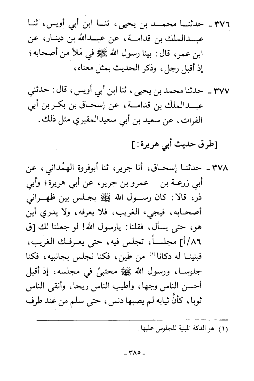 378 - حَدَّثَنَا إِسْحَاقُ، أَنَا جَرِيرٌ، ثنا أَبُو فَرْوَةَ الْهَمْدَانِيُّ، عَنْ أَبِي زُرْعَةَ بْنِ عَمْرِو بْنِ جَرِيرٍ، عَنْ أَبِي هُرَيْرَةَ، وَأَبِي ذَرٍّ قَالَا: كَانَ رَسُولُ اللَّهِ صَلَّى اللهُ عَلَيْهِ وَسَلَّمَ يَجْلِسُ بَيْنَ ظَهْرَانِي أَصْحَابِهِ فَيَجِيءُ الْغَرِيبُ فَلَا يَعْرِفُهُ وَلَا يَدْرِي أَيْنَ هُوَ حَتَّى يَسْأَلَ، فَقُلْنَا: يَا رَسُولَ اللَّهِ، لَوْ جَعَلْنَا لَكَ مَجْلِسًا تَجْلِسُ فِيهِ حَتَّى يَعْرِفَكَ الْغَرِيبُ، فَبَنَيْنَا لَهُ دُكَّانًا مِنْ طِينٍ، فَكُنَّا نَجْلِسُ بِجَانِبِيهِ، فَكُنَّا جُلُوسًا وَرَسُولُ اللَّهِ صَلَّى اللهُ عَلَيْهِ وَسَلَّمَ مُحْتَبٍ فِي مَجْلِسِهِ، إِذْ أَقْبَلَ أَحْسَنُ النَّاسِ وَجْهًا، وَأَطْيَبُ النَّاسِ رِيحًا، وَأَنْقَى النَّاسِ ثَوْبًا، كَأَنَّ ثِيَابَهُ لَمْ يُصِبْهَا دَنَسٌ، حَتَّى سَلَّمَ مِنْ عِنْدِ طَرَفِ -[386]- السِّمَاطِ فَقَالَ: السَّلَامُ عَلَيْكَ يَا مُحَمَّدُ، فَرَدَّ عَلَيْهِ السَّلَامَ، ثُمَّ قَالَ لَهُ: أَدْنُو يَا مُحَمَّدُ؟ قَالَ: «ادْنُ» فَمَا زَالَ يَقُولُ: أَدْنُو يَا مُحَمَّدُ، فَيَقُولُ مُحَمَّدٌ: «ادْنُ» حَتَّى وَضَعَ يَدَيْهِ عَلَى رُكْبَتِي رَسُولِ اللَّهِ صَلَّى اللهُ عَلَيْهِ وَسَلَّمَ فَقَالَ: يَا مُحَمَّدُ، §مَا الْإِسْلَامُ؟ قَالَ: أَنْ تَعْبُدَ اللَّهَ وَلَا تُشْرِكَ بِهِ شَيْئًا، وَتُقِيمَ الصَّلَاةَ، وَتُؤْتِيَ الزَّكَاةَ، وَتَصُومَ رَمَضَانَ، وَتَحُجَّ الْبَيْتَ " قَالَ: فَإِذَا فَعَلْتُ ذَلِكَ فَقَدْ أَسْلَمْتُ؟ قَالَ: «نَعَمْ» قَالَ: صَدَقْتَ، فَأَنْكَرْنَا مِنْهُ قَوْلَهُ: صَدَقْتَ، قَالَ: يَا مُحَمَّدُ، فَأَخْبِرْنِي عَنِ الْإِيمَانِ، قَالَ: «أَنْ تُؤْمِنَ بِاللَّهِ، وَالْمَلَائِكَةِ، وَالْكِتَابِ، وَالنَّبِيِّينَ، وَبِالْقَدَرِ كُلِّهِ» فَقَالَ: يَا مُحَمَّدُ، أَخْبِرْنِي عَنِ الْإِحْسَانِ، قَالَ: «أَنْ تَعْبُدَ اللَّهَ كَأَنَّكَ تَرَاهُ، فَإِنْ لَمْ تَكُنْ تَرَاهُ فَإِنَّهُ يَرَاكَ» قَالَ: صَدَقْتَ، قَالَ: يَا مُحَمَّدُ، فَأَخْبِرْنِي عَنِ السَّاعَةِ، قَالَ: فَنَكَّسَ وَلَمْ يُجِبْهُ، ثُمَّ عَادَ فَلَمْ يُجِبْهُ، ثُمَّ عَادَ فَلَمْ يُجِبْهُ، ثُمَّ رَفَعَ رَأْسَهُ فَحَلَفَ بِاللَّهِ أَوْ قَالَ: «وَالَّذِي بَعَثَ مُحَمَّدًا بِالْهُدَى وَدِينِ الْحَقِّ، مَا الْمَسْئُولُ عَنْهَا بِأَعْلَمَ مِنَ السَّائِلِ، وَلَكِنْ لَهَا عَلَامَاتٌ تُعْرَفُ بِهَا، إِذَا رَأَيْتَ رِعَاءَ -[387]- الْبَهْمِ يَتَطَاوَلُونَ فِي الْبُنْيَانِ، وَرَأَيْتَ الْحُفَاةَ الْعُرَاةَ مُلُوكَ الْأَرْضِ، وَإِذَا وَلَدَتِ الْأَمَةُ رَبَّهَا، فِي خَمْسٍ مِنَ الْغَيْبِ لَا يَعْلَمُهَا إِلَّا اللَّهُ» ثُمَّ قَرَأَ {إِنَّ اللَّهَ عِنْدَهُ عِلْمُ السَّاعَةِ وَيُنَزِّلُ الْغَيْثَ} [لقمان: 34] إِلَى {عَلِيمٌ خَبِيرٌ} [الحجرات: 13] ثُمَّ سَطَعَ غُبَارٌ مِنَ السَّمَاءِ، فَقَالَ رَسُولُ اللَّهِ صَلَّى اللهُ عَلَيْهِ وَسَلَّمَ: «وَالَّذِي بَعَثَ مُحَمَّدًا بِالْهُدَى وَدِينِ الْحَقِّ، مَا أَنَا بِأَعْلَمَ بِهِ مِنْ رَجُلٍ مِنْكُمْ، وَإِنَّهُ لِجِبْرِيلُ جَاءَ لَيُعَلِّمَكُمْ فِي صُورَةِ دِحْيَةَ الْكَلْبِيِّ»