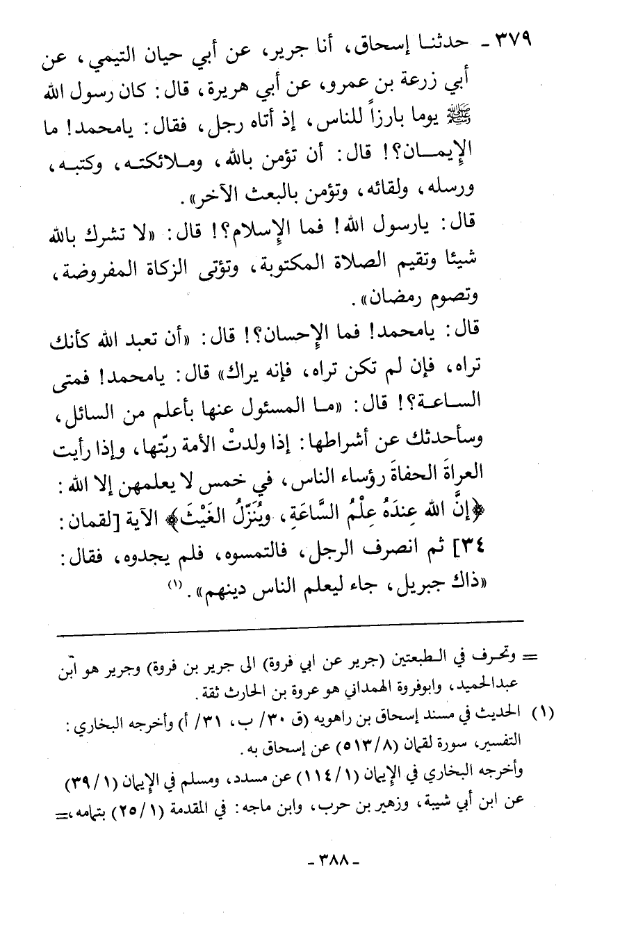 379 - حَدَّثَنَا إِسْحَاقُ، أَنَا جَرِيرٌ، عَنْ أَبِي حَيَّانَ التَّيْمِيِّ، عَنْ أَبِي زُرْعَةَ بْنِ عَمْرٍو، عَنْ أَبِي هُرَيْرَةَ، قَالَ: كَانَ رَسُولُ اللَّهِ صَلَّى اللهُ عَلَيْهِ وَسَلَّمَ يَوْمًا بَارِزًا لِلنَّاسِ إِذْ أَتَاهُ رَجُلٌ فَقَالَ: يَا مُحَمَّدُ، §مَا الْإِيمَانُ؟ قَالَ: «أَنَّ تُؤْمِنَ بِاللَّهِ، وَمَلَائِكَتِهِ، وَكُتُبِهِ، وَرُسُلِهِ، وَلِقَائِهِ، وَتُؤْمِنَ بِالْبَعْثِ الْآخِرِ» قَالَ: يَا رَسُولَ اللَّهِ، فَمَا الْإِسْلَامُ؟ قَالَ: «لَا تُشْرِكُ بِاللَّهِ شَيْئًا، وَتُقِيمُ الصَّلَاةَ الْمَكْتُوبَةَ، وَتُؤْتِي الزَّكَاةَ الْمَفْرُوضَةَ، وَتَصُومُ رَمَضَانَ» قَالَ: يَا مُحَمَّدُ، فَمَا الْإِحْسَانُ؟ قَالَ: «أَنْ تَعْبُدَ اللَّهَ كَأَنَّكَ تَرَاهُ، فَإِنْ لَمْ تَكُنْ تَرَاهُ فَإِنَّهُ يَرَاكَ» قَالَ: يَا مُحَمَّدُ، فَمَتَى السَّاعَةُ؟ قَالَ: " مَا الْمَسْئُولُ عَنْهَا بِأَعْلَمَ مِنَ السَّائِلِ، وَسَأُحَدِّثُكَ عَنْ أَشْرَاطِهَا: إِذَا وَلَدَتِ الْأَمَةُ رَبَّتَهَا، وَإِذَا رَأَيْتَ الْعُرَاةَ الْحُفَاةَ رُؤَسَاءَ النَّاسِ، فِي خَمْسٍ لَا يَعْلَمُهُنَّ إِلَّا اللَّهُ {إِنَّ اللَّهَ عِنْدَهُ عِلْمُ السَّاعَةِ وَيُنَزِّلُ الْغَيْثَ} [لقمان: 34] ثُمَّ انْصَرَفَ الرَّجُلُ، فَالْتَمَسُوهُ فَلَمْ يَجِدُوهُ، فَقَالَ: «ذَاكَ جِبْرِيلُ جَاءَ لِيُعَلِّمَ النَّاسَ دِينَهُمْ»