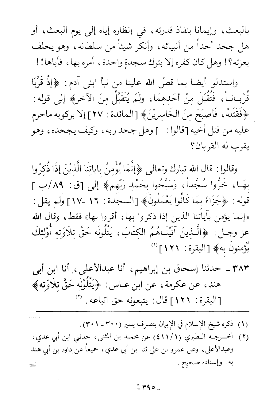 383 - حَدَّثَنَا إِسْحَاقُ بْنُ إِبْرَاهِيمَ، أَنَا عَبْدُ الْأَعْلَى، أَنَا ابْنُ أَبِي هِنْدٍ، عَنْ عِكْرِمَةَ، عَنِ ابْنِ عَبَّاسٍ، " {§يَتْلُونَهُ حَقَّ تِلَاوَتِهِ} [البقرة: 121] قَالَ: يَتَّبِعُونَهُ حَقَّ اتِّبَاعِهِ "