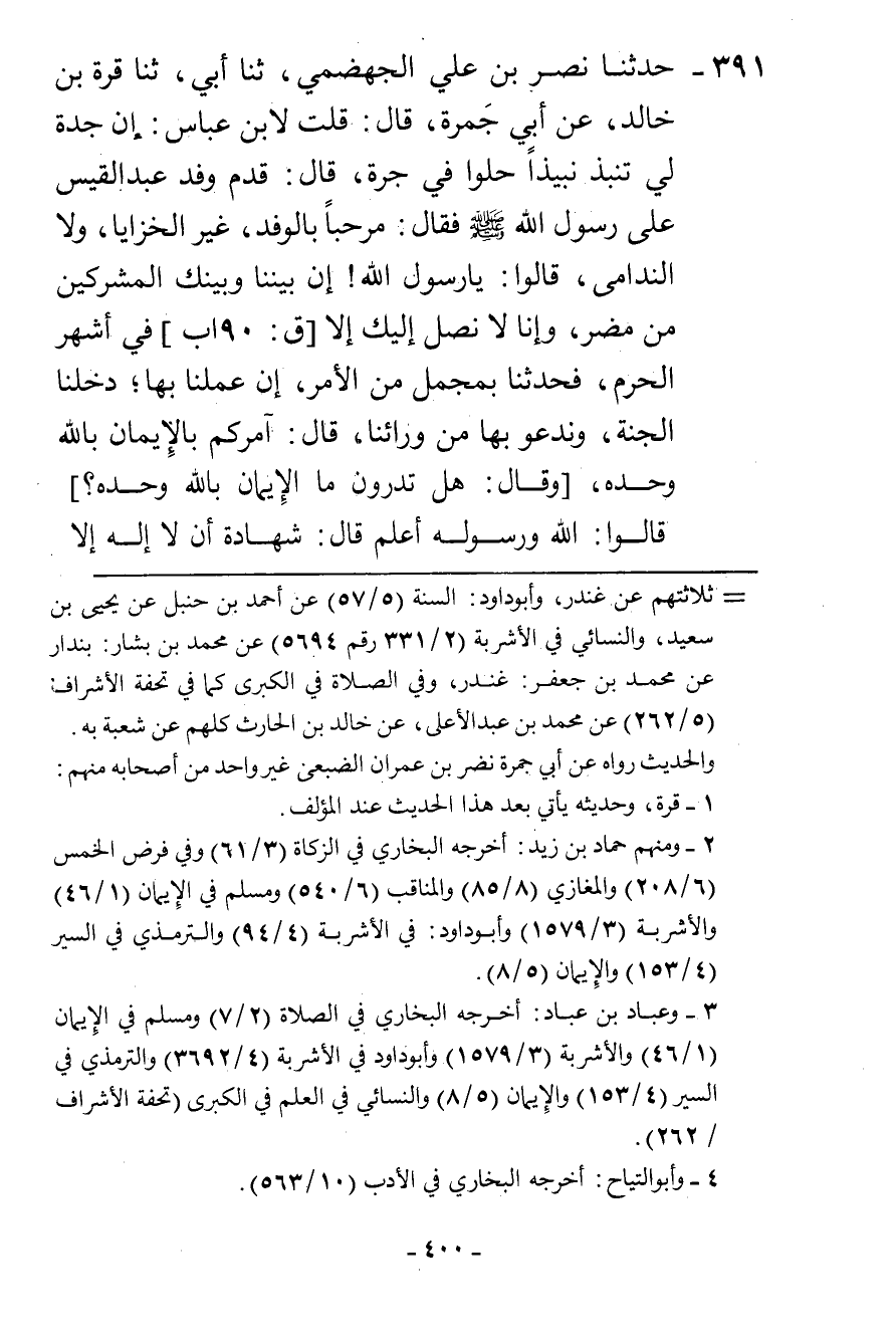 391 - حَدَّثَنَا نَصْرُ بْنُ عَلِيٍّ الْجَهْضَمِيُّ، ثنا أَبِي، ثنا قُرَّةُ بْنُ خَالِدٍ، عَنْ أَبِي جَمْرَةَ، قَالَ: قُلْتُ لِابْنِ عَبَّاسٍ: إِنَّ جَدَّةً لِي تَنْبِذُ نَبِيذًا حُلْوًا فِي جَرَّةٍ، قَالَ: قَدِمَ وَفْدُ عَبْدِ الْقَيْسِ عَلَى رَسُولِ اللَّهِ صَلَّى اللهُ عَلَيْهِ وَسَلَّمَ فَقَالَ: «مَرْحَبًا بِالْوَفْدِ، غَيْرِ الْخَزَايَا وَلَا النَّدَامَى» قَالُوا: يَا رَسُولَ اللَّهِ، إِنَّ بَيْنَنَا وَبَيْنَكَ الْمُشْرِكِينَ مِنْ مُضَرَ، وَإِنَّا لَا نَصِلُ إِلَيْكَ إِلَّا فِي أَشْهُرِ الْحُرُمِ، فَحَدِّثْنَا بِمُجْمَلٍ مِنَ الْأَمْرِ، إِنْ عَمِلْنَا بِهَا دَخَلْنَا الْجَنَّةَ، وَنَدْعُو بِهَا مَنْ وَرَاءَنَا، قَالَ: «§آمُرُكُمْ بِالْإِيمَانِ بِاللَّهِ وَحْدَهُ» وَقَالَ: «هَلْ تَدْرُونَ مَا الْإِيمَانُ بِاللَّهِ وَحْدَهُ؟» قَالُوا: اللَّهُ وَرَسُولُهُ أَعْلَمُ، قَالَ: «شَهَادَةُ أَنْ لَا إِلَهَ إِلَّا -[401]- اللَّهُ، وَإِقَامُ الصَّلَاةِ، وَإِيتَاءُ الزَّكَاةِ، وَأَنْ تُعْطُوا مِنَ الْغَنَائِمِ الْخُمُسَ، وَأَنْهَاكُمْ عَمَّا يُنْتَبَذُ فِي الْحَنْتَمِ وَالدُّبَّاءِ وَالنَّقِيرِ وَالْمُزَفَّتِ» قَالَ أَبُو عَبْدِ اللَّهِ: قَالُوا: فَهَذَا رَسُولُ رَبِّ الْعَالَمِينَ الَّذِي جَاءَ بِالْإِيمَانِ وَدَعَا إِلَيْهِ، سَأَلَهُ الْوَفْدُ عَنْ أَمْرٍ يُدْخِلُهُمُ الْجَنَّةَ، وَيُنَجِّيهِمْ مِنَ النَّارِ، فَأَمَرَهُمْ بِالْإِيمَانِ بِاللَّهِ، ثُمَّ قَالَ لَهُمْ مَخَافَةَ أَنْ يَحْمِلُوا ذَلِكَ عَلَى غَيْرِ وَجْهِهِ: «أَتَدْرُونَ مَا الْإِيمَانُ بِاللَّهِ؟» ثُمَّ فَسَّرَهُ لَهُمْ، فَجَعَلَهُ تَوْحِيدَهُ، وَالْإِقْرَارَ بِرَسُولِهِ، وَإِقَامَ الصَّلَاةِ، وَإِيتَاءَ الزَّكَاةِ، وَإِيتَاءَ الْخُمُسِ مِنَ الْغَنَائِمِ، فَهَذَا مِمَّا يُبَيِّنُ لَكَ أَنَّ الْإِيمَانَ بِاللَّهِ إِنَّمَا هُوَ تَوْحِيدُهُ وَعِبَادَتُهُ