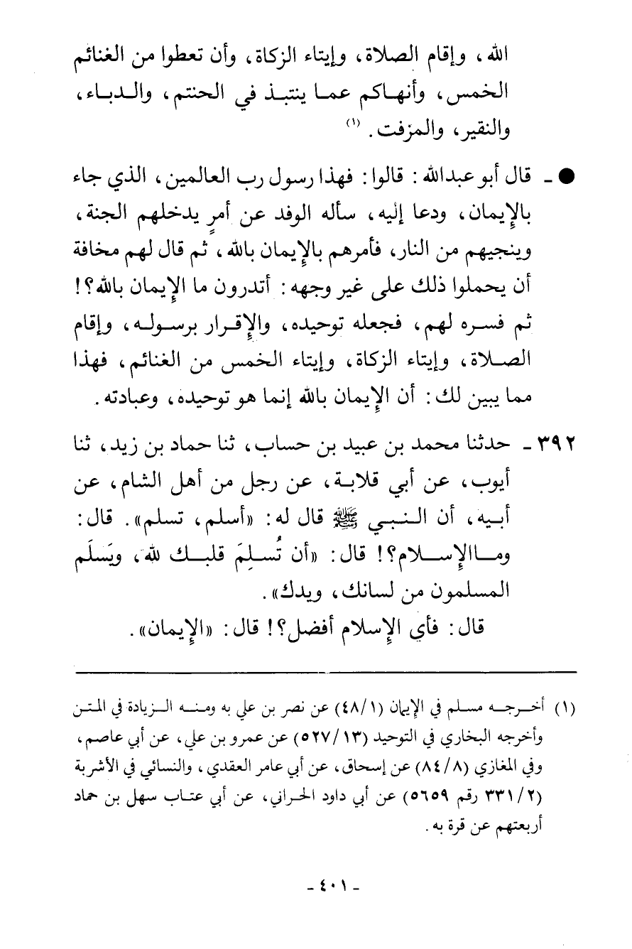 392 - حَدَّثَنَا مُحَمَّدُ بْنُ عُبَيْدِ بْنِ حِسَابٍ، ثنا حَمَّادُ بْنُ زَيْدٍ، ثنا أَيُّوبُ، عَنْ أَبِي قِلَابَةَ، عَنْ رَجُلٍ، مِنْ أَهْلِ الشَّامِ، عَنْ أَبِيهِ، أَنَّ النَّبِيَّ صَلَّى اللهُ عَلَيْهِ وَسَلَّمَ قَالَ لَهُ: «§أَسْلِمْ تَسْلَمْ» قَالَ: وَمَا الْإِسْلَامُ؟ قَالَ: «أَنْ تُسْلِمَ قَلْبَكَ لِلَّهِ، وَيَسْلَمَ الْمُسْلِمُونَ مِنْ لِسَانِكَ وَيَدِكَ» قَالَ: فَأَيُّ الْإِسْلَامِ أَفْضَلُ؟ قَالَ: «الْإِيمَانُ» -[402]- قَالَ: وَمَا الْإِيمَانُ؟ قَالَ: «أَنْ تُؤْمِنَ بِاللَّهِ، وَمَلَائِكَتِهِ، وَكُتُبِهِ، وَرُسُلِهِ، وَبِالْبَعْثِ بَعْدَ الْمَوْتِ» قَالَ: فَأَيُّ الْإِيمَانِ أَفْضَلُ؟ قَالَ: «الْهِجْرَةُ» قَالَ: وَمَا الْهِجْرَةُ؟ قَالَ: «أَنْ تَهْجُرَ السُّوءَ» قَالَ: فَأَيُّ الْهِجْرَةِ أَفْضَلُ؟ قَالَ: «الْجِهَادُ» قَالَ: وَمَا الْجِهَادُ؟ قَالَ: " أَنْ تُجَاهِدَ، أَوْ قَالَ: تُقَاتِلَ، الْكُفَّارَ إِذَا لَقِيتَهُمْ، وَلَا تَغُلَّ، وَلَا تَجْبُنَ " ثُمَّ قَالَ رَسُولُ اللَّهِ صَلَّى اللهُ عَلَيْهِ وَسَلَّمَ بِإِصْبَعَيْهِ: «ثُمَّ عَمَلَانِ هُمَا أَفْضَلُ الْأَعْمَالِ، أَلَا مَنْ عَمِلَ بِمِثْلِهِمَا، قَالَهَا ثَلَاثًا، حَجَّةٌ مَبْرُورَةٌ، أَوْ عُمْرَةٌ» قَالَ أَبُو عَبْدِ اللَّهِ: أَوَلَسْتَ تَرَى أَنَّ النَّبِيَّ صَلَّى اللهُ عَلَيْهِ وَسَلَّمَ قَالَ لَهُ: «أَسْلِمْ تَسْلَمْ» فَجَعَلَ دُعَاءَهُ إِلَى الْإِسْلَامِ كَلِمَةً وَاحِدَةً جَامِعَةً، أَيْ إِنَّكَ إِذَا أَسْلَمْتَ سَلِمْتَ مِنْ كُلِّ سُوءٍ، فَلَمَّا سَأَلَهُ: مَا الْإِسْلَامُ؟ قَالَ: «أَنْ تُسْلِمَ قَلْبَكَ لِلَّهِ، وَأَنْ يَسْلَمَ الْمُسْلِمُونَ مِنْ لِسَانِكَ وَيَدِكَ» فَزَادَهُ تَفْسِيرًا وَبَيَانًا، فَلَمَّا قَالَ لَهُ: أَيُّ الْإِسْلَامِ أَفْضَلُ؟ قَالَ: «الْإِيمَانُ» فَجَعَلَ الْإِيمَانَ مِنَ الْإِسْلَامِ، فَلَمَّا قَالَ لَهُ: وَمَا الْإِيمَانُ؟ قَالَ: «أَنْ تُؤْمِنَ بِاللَّهِ، وَمَلَائِكَتِهِ، وَكُتُبِهِ، وَرُسُلِهِ» وَسَكَتَ لَهُ عَنْ ذِكْرِ الْعَمَلِ، فَكَأَنَّ الرَّجُلَ عَلِمَ أَنَّ الْعَمَلَ قَدْ دَخَلَ فِي ذَلِكَ فَقَالَ لَهُ: فَأَيُّ الْإِيمَانِ أَفْضَلُ؟ قَالَ: «الْهِجْرَةُ» -[403]- فَجَعَلَهَا كَلِمَةً وَاحِدَةً جَامِعَةً، فَلَمَّا قَالَ لَهُ: فَمَا الْهِجْرَةُ؟ قَالَ: «أَنْ تَهْجُرَ السُّوءَ» فَزَادَهُ تَفْسِيرًا وَبَيَانًا، فَلَمَّا قَالَ لَهُ: فَأَيُّ الْهِجْرَةِ أَفْضَلُ؟ قَالَ: «الْجِهَادُ فِي سَبِيلِ اللَّهِ» وَقَدْ قَالَ لَهُ قَبْلَ ذَلِكَ: «الْهِجْرَةُ أَنْ تَهْجُرَ السُّوءَ» أَيْ إِنَّكَ إِذَا هَجَرْتَ السُّوءَ رَغِبْتَ فِي الْخَيْرِ، وَمِنْ خَيْرِ مَا أَنْتَ رَاغِبٌ فِيهِ الْجِهَادُ فِي سَبِيلِ اللَّهِ، ثُمَّ الْحَجُّ وَالْعُمْرَةُ مِنَ الْإِيمَانِ، وَقَدْ بَدَأَ قَبْلَ ذَلِكَ فَأَخْبَرَهُ أَنَّ الْإِيمَانَ إِنَّمَا هُوَ أَنْ تُؤْمِنَ بِاللَّهِ، وَمَلَائِكَتِهِ، وَكُتُبِهِ، وَرُسُلِهِ، فَفِي ذَلِكَ بَيَانُ مَا قُلْنَا إِنَّ الْإِيمَانَ بِكِتَابِ اللَّهِ إِنَّمَا هُوَ اتِّبَاعُ مَا فِيهِ، فَقَدْ أَمَرَ فِيهِ بِالْهِجْرَةِ، وَالْحَجِّ، وَالْعُمْرَةِ، وَالْجِهَادِ، وَاجْتِنَابِ السُّوءِ