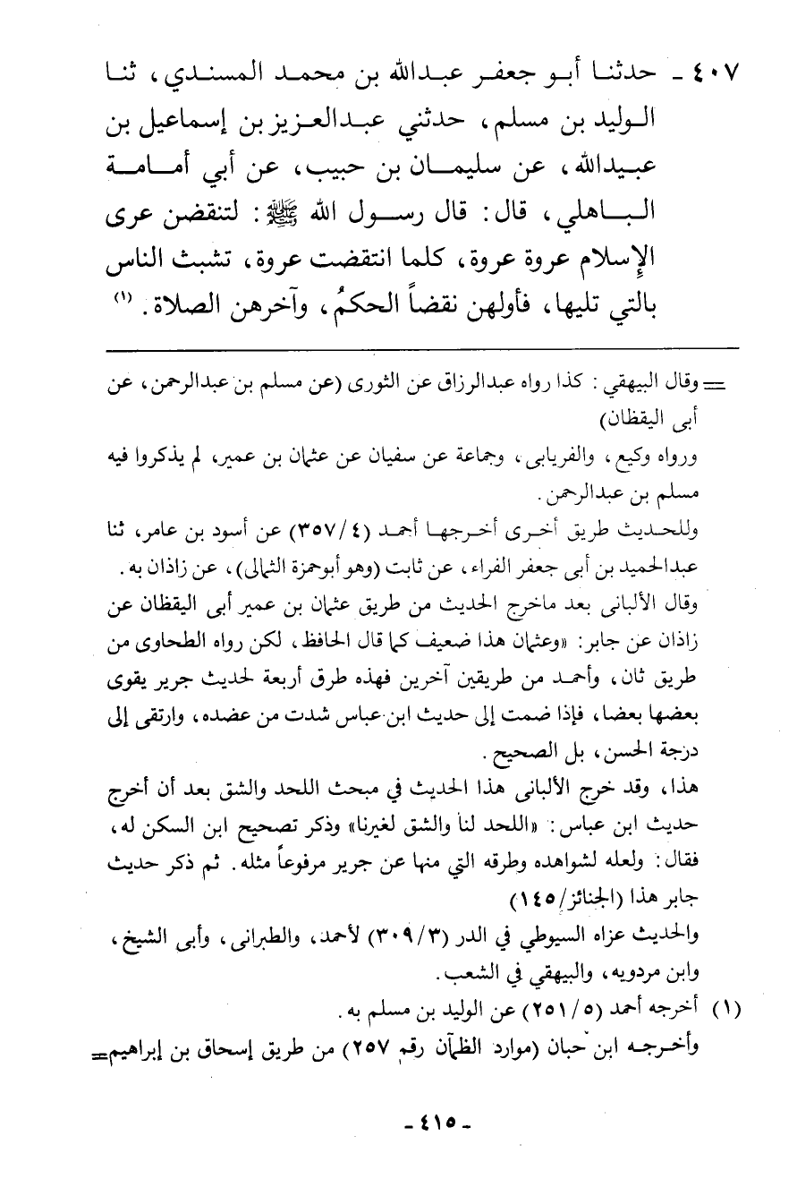 407 - حَدَّثَنَا أَبُو جَعْفَرٍ عَبْدُ اللَّهِ بْنُ مُحَمَّدٍ الْمُسْنَدِيُّ، ثنا الْوَلِيدُ بْنُ مُسْلِمٍ، حَدَّثَنِي عَبْدُ الْعَزِيزِ بْنُ إِسْمَاعِيلَ بْنِ عُبَيْدِ اللَّهِ، عَنْ سُلَيْمَانَ بْنِ حَبِيبٍ، عَنْ أَبِي أُمَامَةَ الْبَاهِلِيِّ، قَالَ: قَالَ رَسُولُ اللَّهِ صَلَّى اللهُ عَلَيْهِ وَسَلَّمَ: «§لَتُنْقَضَنَّ عُرَى الْإِسْلَامِ عُرْوَةً عُرْوَةً، كُلَّمَا انْتَقَضَتْ عُرْوَةٌ تَشَبَّثَ النَّاسُ بِالَّتِي تَلِيهَا، فَأَوَّلُهُنَّ نَقْضًا الْحُكْمُ، وَآخِرُهُنَّ الصَّلَاةُ»