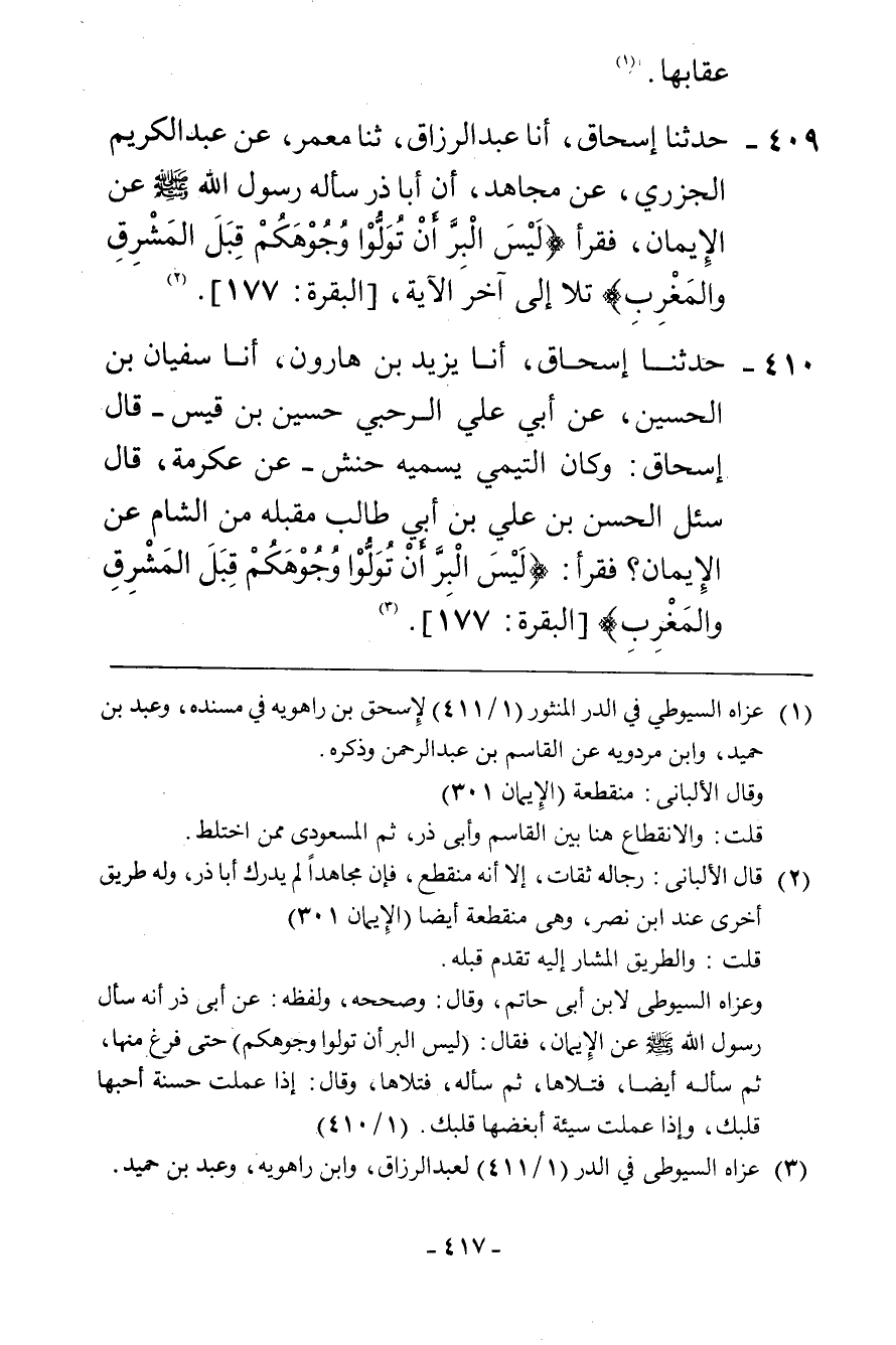409 - حَدَّثَنَا إِسْحَاقُ، أَنَا عَبْدُ الرَّزَّاقِ، ثنا مَعْمَرٌ، عَنْ عَبْدِ الْكَرِيمِ الْجَزَرِيِّ، عَنْ مُجَاهِدٍ، أَنَّ أَبَا ذَرٍّ، سَأَلَ رَسُولَ اللَّهِ صَلَّى اللهُ عَلَيْهِ وَسَلَّمَ عَنِ الْإِيمَانِ فَقَرَأَ " {§لَيْسَ الْبِرَّ أَنْ تُوَلُّوا وجُوهَكُمْ قِبَلَ الْمَشْرِقِ وَالْمَغْرِبِ} [البقرة: 177] تَلَا إِلَى آخِرِ الْآيَةِ "