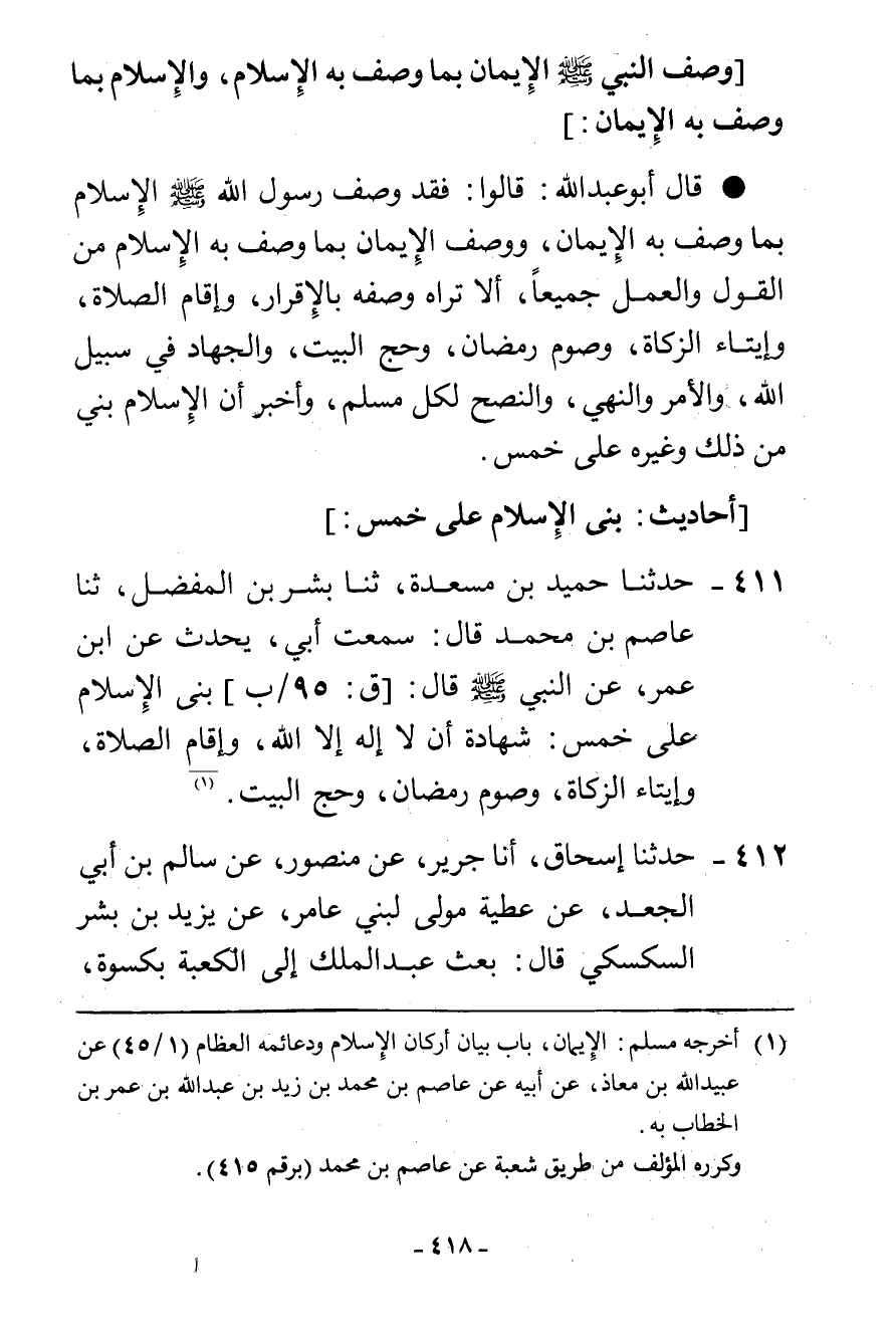411 - حَدَّثَنَا حُمَيْدُ بْنُ مَسْعَدَةَ، ثنا بِشْرُ بْنُ الْمُفَضَّلِ، ثنا عَاصِمُ بْنُ مُحَمَّدٍ، قَالَ: سَمِعْتُ أَبِيَ يُحَدِّثُ، عَنِ ابْنِ عُمَرَ، عَنِ النَّبِيِّ صَلَّى اللهُ عَلَيْهِ وَسَلَّمَ قَالَ: " §بُنِيَ الْإِسْلَامُ عَلَى خَمْسٍ: شَهَادَةِ أَنْ لَا إِلَهَ إِلَّا اللَّهُ، وَإِقَامِ الصَّلَاةِ، وَإِيتَاءِ الزَّكَاةِ، وَصَوْمِ رَمَضَانَ، وَحَجِّ الْبَيْتِ "