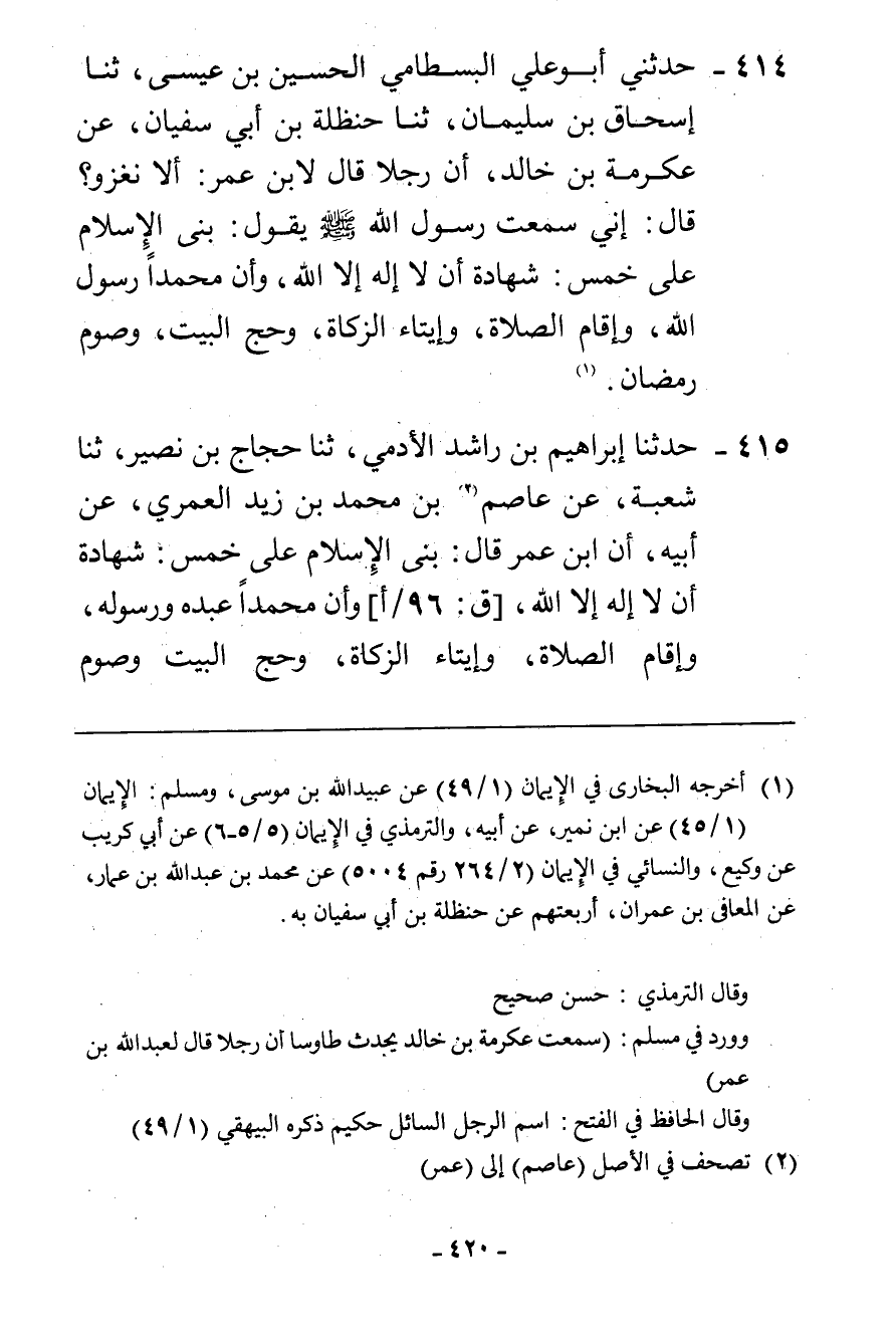 414 - حَدَّثَنِي أَبُو عَلِيٍّ الْبِسْطَامِيُّ الْحُسَيْنُ بْنُ عِيسَى، ثنا إِسْحَاقُ بْنُ سُلَيْمَانَ، ثنا حَنْظَلَةُ بْنُ أَبِي سُفْيَانَ، عَنْ عِكْرِمَةَ بْنِ خَالِدٍ، أَنَّ رَجُلًا، قَالَ لِابْنِ عُمَرَ: أَلَا نَغْزُو؟ قَالَ: إِنِّي سَمِعْتُ رَسُولَ اللَّهِ صَلَّى اللهُ عَلَيْهِ وَسَلَّمَ يَقُولُ: " §بُنِيَ الْإِسْلَامُ عَلَى خَمْسٍ: شَهَادَةِ أَنْ لَا إِلَهَ إِلَّا اللَّهُ، وَأَنَّ مُحَمَّدًا رَسُولُ اللَّهِ، وَإِقَامِ الصَّلَاةِ، وَإِيتَاءِ الزَّكَاةِ، وَحَجِّ الْبَيْتِ، وَصَوْمِ رَمَضَانَ "