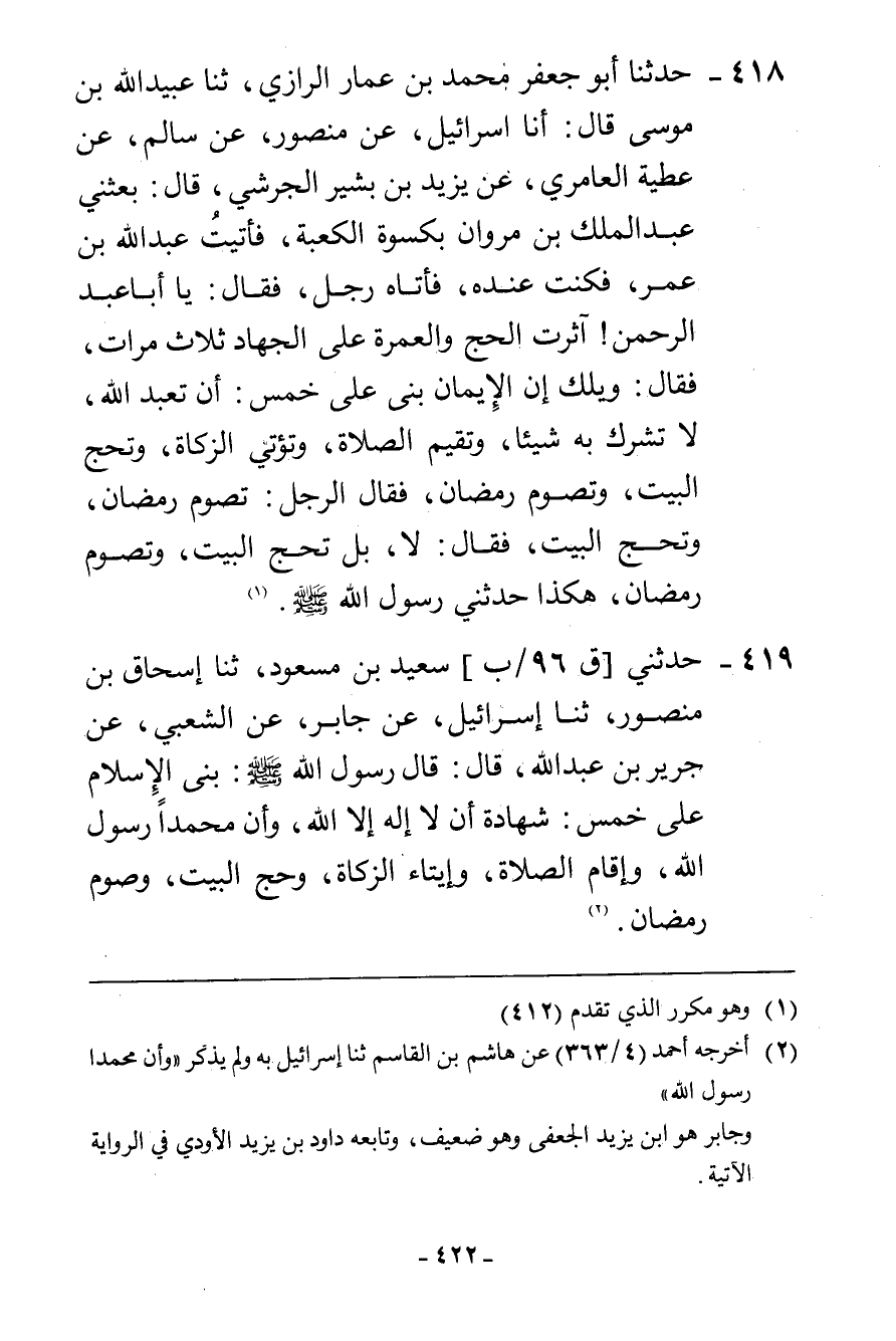 419 - حَدَّثَنِي سَعِيدُ بْنُ مَسْعُودٍ، ثنا إِسْحَاقُ بْنُ مَنْصُورٍ، ثنا إِسْرَائِيلُ، عَنْ جَابِرٍ، عَنِ الشَّعْبِيِّ، عَنْ جَرِيرِ بْنِ عَبْدِ اللَّهِ، قَالَ: قَالَ رَسُولُ اللَّهِ صَلَّى اللهُ عَلَيْهِ وَسَلَّمَ: " §بُنِيَ الْإِسْلَامُ عَلَى خَمْسٍ: شَهَادَةِ أَنْ لَا إِلَهَ إِلَّا اللَّهُ، وَأَنَّ مُحَمَّدًا رَسُولُ اللَّهِ، وَإِقَامِ الصَّلَاةِ، وَإِيتَاءِ الزَّكَاةِ، وَحَجِّ الْبَيْتِ، وَصَوْمِ رَمَضَانَ "