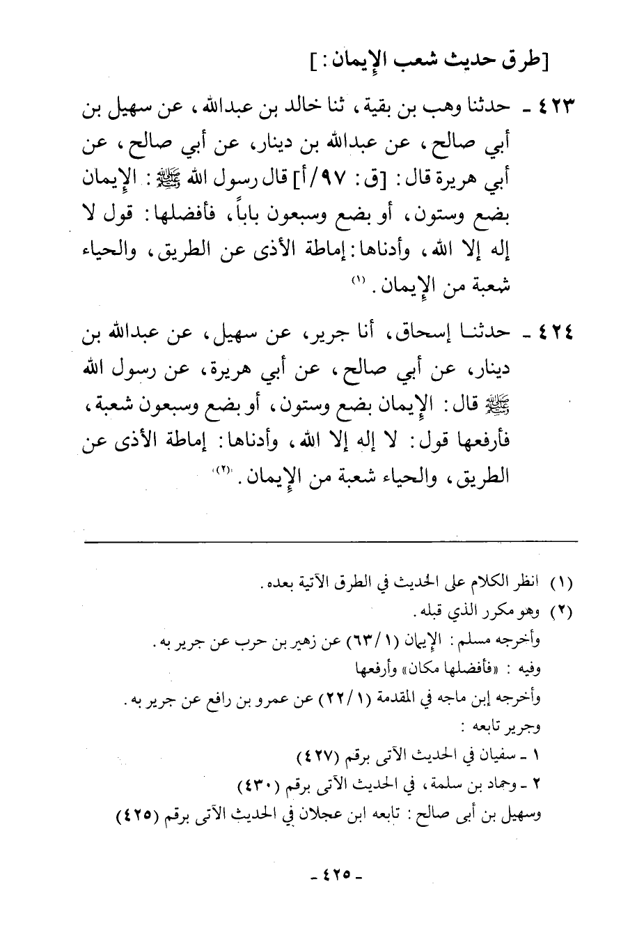 424 - حَدَّثَنَا إِسْحَاقُ، أَنَا جَرِيرٌ، عَنْ سُهَيْلٍ، عَنْ عَبْدِ اللَّهِ بْنِ دِينَارٍ، عَنْ أَبِي صَالِحٍ، عَنْ أَبِي هُرَيْرَةَ، عَنْ رَسُولِ اللَّهِ صَلَّى اللهُ عَلَيْهِ وَسَلَّمَ قَالَ: " §الْإِيمَانُ بِضْعٌ وَسِتُّونَ، أَوْ بِضْعٌ وَسَبْعُونَ شُعْبَةً، فَأَرْفَعُهَا قَوْلُ: لَا إِلَهَ إِلَّا اللَّهُ، وَأَدْنَاهَا إِمَاطَةُ الْأَذَى عَنِ الطَّرِيقِ، وَالْحَيَاءُ شُعْبَةٌ مِنَ الْإِيمَانِ "