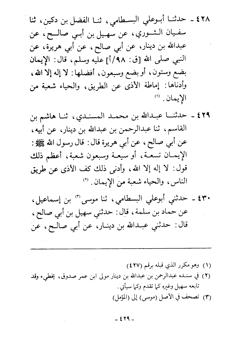 429 - حَدَّثَنَا عَبْدُ اللَّهِ بْنُ مُحَمَّدٍ الْمُسْنَدِيُّ، ثنا هَاشِمُ بْنُ الْقَاسِمِ، ثنا عَبْدُ الرَّحْمَنِ بْنُ عَبْدِ اللَّهِ بْنِ دِينَارٍ، عَنْ أَبِيهِ، عَنْ أَبِي صَالِحٍ، عَنْ أَبِي هُرَيْرَةَ، قَالَ: قَالَ رَسُولُ اللَّهِ صَلَّى اللهُ عَلَيْهِ وَسَلَّمَ: " §الْإِيمَانُ تِسْعَةٌ، أَوْ سَبْعَةٌ، وَسَبْعُونَ شُعْبَةً، أَعْظَمُ ذَلِكَ قَوْلُ: لَا إِلَهَ إِلَّا اللَّهُ، وَأَدْنَى ذَلِكَ كَفُّ الْأَذَى عَنْ طَرِيقِ النَّاسِ، وَالْحَيَاءُ شُعْبَةٌ مِنَ الْإِيمَانِ "