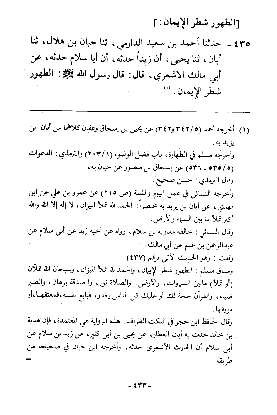 435 - حَدَّثَنَا أَحْمَدُ بْنُ سَعِيدٍ الدَّارِمِيُّ، ثنا حَبَّانُ بْنُ هِلَالٍ، ثنا أَبَانُ، ثنا يَحْيَى، أَنَّ زَيْدًا، حَدَّثَهُ، أَنَّ أَبَا سَلَّامٍ حَدَّثَهُ، عَنْ أَبِي مَالِكٍ الْأَشْعَرِيِّ، قَالَ: قَالَ رَسُولُ اللَّهِ صَلَّى اللهُ عَلَيْهِ وَسَلَّمَ: «§الطُّهُورُ شَطْرُ الْإِيمَانِ»