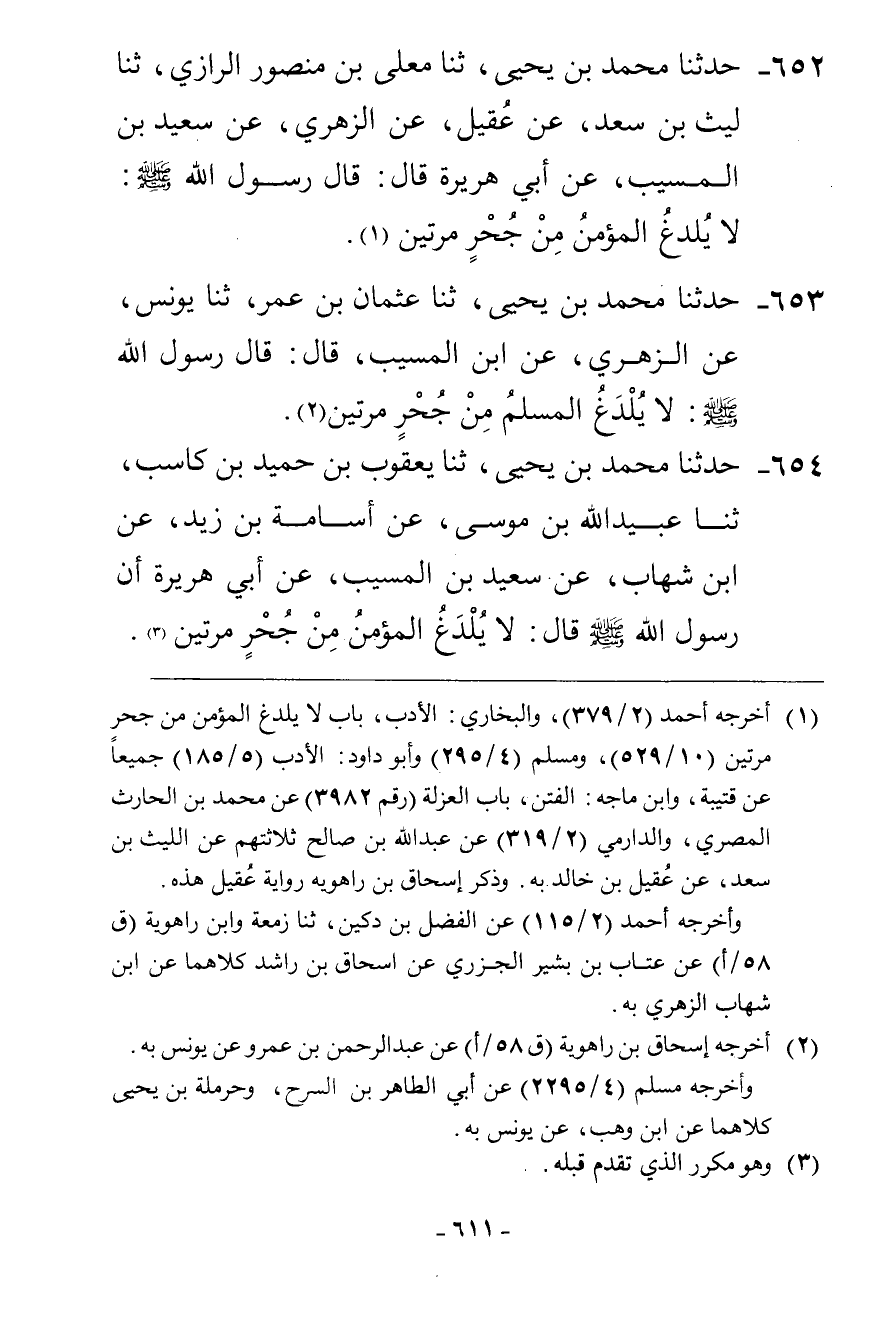 653 - حَدَّثَنَا مُحَمَّدُ بْنُ يَحْيَى، ثنا عُثْمَانُ بْنُ عُمَرَ، ثنا يُونُسُ، عَنِ الزُّهْرِيِّ، عَنِ ابْنِ الْمُسَيِّبِ، قَالَ: قَالَ رَسُولُ اللَّهِ صَلَّى اللهُ عَلَيْهِ وَسَلَّمَ: «§لَا يُلْدَغُ الْمُسْلِمُ مِنْ جُحْرٍ مَرَّتَيْنِ»