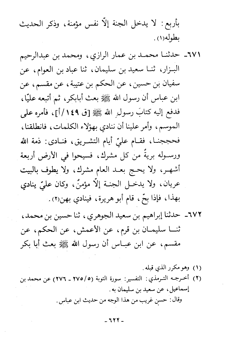 671 - حَدَّثَنَا مُحَمَّدُ بْنُ عَمَّارٍ الرَّازِيُّ، وَمُحَمَّدُ بْنُ عَبْدِ الرَّحِيمِ الْبَزَّازُ، ثنا سَعِيدُ بْنُ سُلَيْمَانَ، ثنا عَبَّادُ بْنُ الْعَوَّامِ، عَنْ سُفْيَانَ بْنِ حُسَيْنٍ، عَنِ الْحَكَمِ بْنِ عُتَيْبَةَ، عَنْ مِقْسَمٍ، عَنِ ابْنِ عَبَّاسٍ، أَنَّ رَسُولَ اللَّهِ صَلَّى اللهُ عَلَيْهِ وَسَلَّمَ بَعَثَ أَبَا بَكْرٍ ثُمَّ أَتْبَعَهُ عَلِيًّا فَدَفَعَ إِلَيْهِ كِتَابَ رَسُولِ اللَّهِ صَلَّى اللهُ عَلَيْهِ وَسَلَّمَ فَأَمَّرَهُ عَلَى الْمَوْسِمِ، وَأَمَرَ عَلَيْنَا أَنْ نُنَادِيَ بِهَؤُلَاءِ الْكَلِمَاتِ فَانْطَلَقْنَا فَحَجَجْنَا فَقَامَ عَلِيٌّ أَيَّامَ التَّشْرِيقِ فَنَادَى: «§ذِمَّةُ اللَّهِ وَرَسُولِهِ بَرِيَّةٌ مِنْ كُلِّ مُشْرِكٍ فَسِيحُوا فِي الْأَرْضِ أَرْبَعَةَ أَشْهُرٍ، وَلَا يَحُجُّ بَعْدَ الْعَامِ مُشْرِكٌ، وَلَا يَطُوفُ بِالْبَيْتِ عُرْيَانُ، وَلَا يَدْخُلُ الْجَنَّةَ إِلَّا مُؤْمِنٌ، وَكَانَ عَلِيٌّ يُنَادِي بِهَذَا فَإِذَا بُحَّ، قَامَ أَبُو هُرَيْرَةَ فَيُنَادِي بِهِنَّ»