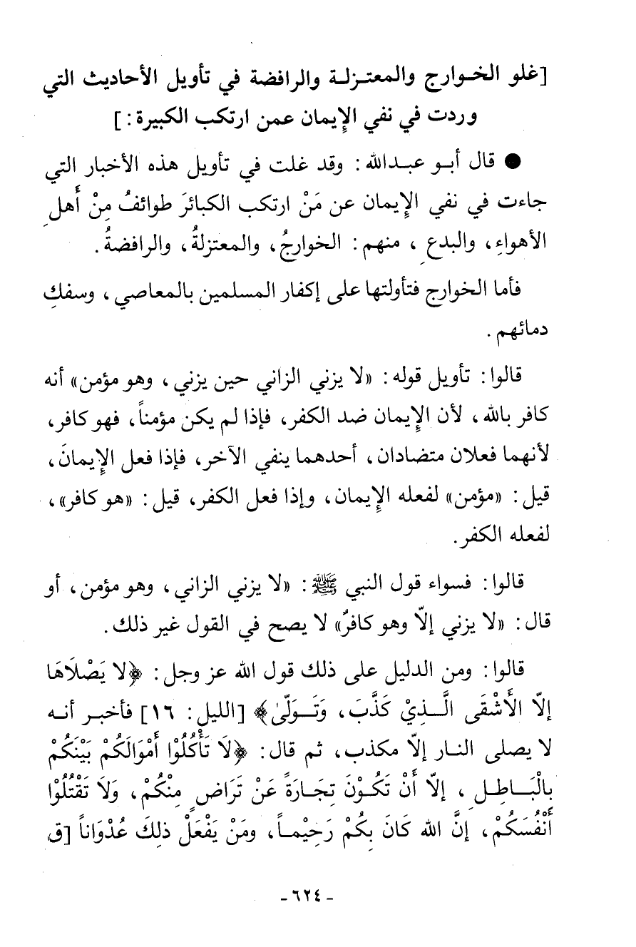 §غُلُوُّ الْخَوَارِجِ وَالْمُعْتَزِلَةِ وَالرَّافِضَةِ فِي تَأْوِيلِ الْأَحَادِيثِ الَّتِي وَرَدَتْ فِي نَفْيِ الْإِيمَانِ عَمَّنِ ارْتَكَبَ الْكَبِيرَةَ. قَالَ أَبُو عَبْدِ اللَّهِ: وَقَدْ غَلَتْ فِي تَأْوِيلِ هَذِهِ الْأَخْبَارِ الَّتِي جَاءَتْ فِي نَفْيِ الْإِيمَانِ عَنْ مَنِ ارْتَكَبَ الْكَبَائِرَ طَوَائِفُ مِنْ أَهْلِ الْأَهْوَاءِ وَالْبِدَعِ مِنْهُمُ الْخَوَارِجُ وَالْمُعْتَزِلَةُ وَالرَّافِضَةُ. فَأَمَّا الْخَوَارِجُ فَتَأَوَّلَتْهَا عَلَى إِكْفَارِ الْمُسْلِمِينَ بِالْمَعَاصِي، وَسَفْكِ دِمَائِهِمْ. قَالُوا: تَأْوِيلُ قَوْلِهِ: «لَا يَزْنِي الزَّانِي حِينَ يَزْنِي وَهُوَ مُؤْمِنٌ» أَنَّهُ كَافِرٌ بِاللَّهِ لِأَنَّ الْإِيمَانَ ضِدُّ الْكُفْرِ فَإِذَا لَمْ يَكُنْ مُؤْمِنًا فَهُوَ كَافِرٌ لِأَنَّهُمَا فِعْلَانِ مُتَضَادَّانِ أَحَدُهُمَا يَنْفِي الْآخَرَ، فَإِذَا فَعَلَ الْإِيمَانَ قِيلَ مُؤْمِنٌ لِفِعْلِهِ الْإِيمَانَ، وَإِذَا فَعَلَ الْكُفْرَ قِيلَ هُوَ كَافِرٌ لِفِعْلِهِ الْكُفْرَ. قَالُوا: فَسَوَاءٌ قَوْلُ النَّبِيِّ صَلَّى اللهُ عَلَيْهِ وَسَلَّمَ: «لَا يَزْنِي الزَّانِي وَهُوَ مُؤْمِنٌ» أَوْ قَالَ: «لَا يَزْنِي إِلَّا وَهُوَ كَافِرٌ» لَا يَصِحُّ فِي الْقَوْلِ غَيْرُ ذَلِكَ. قَالُوا: وَمِنَ الدَّلِيلِ عَلَى ذَلِكَ قَوْلُ اللَّهِ عَزَّ وَجَلَّ: {لَا يَصْلَاهَا إِلَّا الْأَشْقَى الَّذِي كَذَّبَ وَتَوَلَّى} [الليل: 16] فَأَخْبَرَ أَنَّهُ لَا يَصْلَى النَّارَ إِلَّا مُكَذِّبٌ، ثُمَّ قَالَ: {لَا تَأْكُلُوا أَمْوَالَكُمْ بَيْنَكُمْ بِالْبَاطِلِ إِلَّا أَنْ تَكُونَ تِجَارَةً عَنْ تَرَاضِ مِنْكُمْ وَلَا تَقْتُلُوا أَنْفُسَكُمْ إِنَّ اللَّهَ كَانَ بِكُمْ رَحِيمًا وَمَنْ يَفْعَلْ ذَلِكَ عُدْوَانًا وَظُلْمًا فَسَوْفَ نُصْلِيهِ نَارًا وَكَانَ ذَلِكَ عَلَى اللَّهِ يَسِيرًا} [النساء