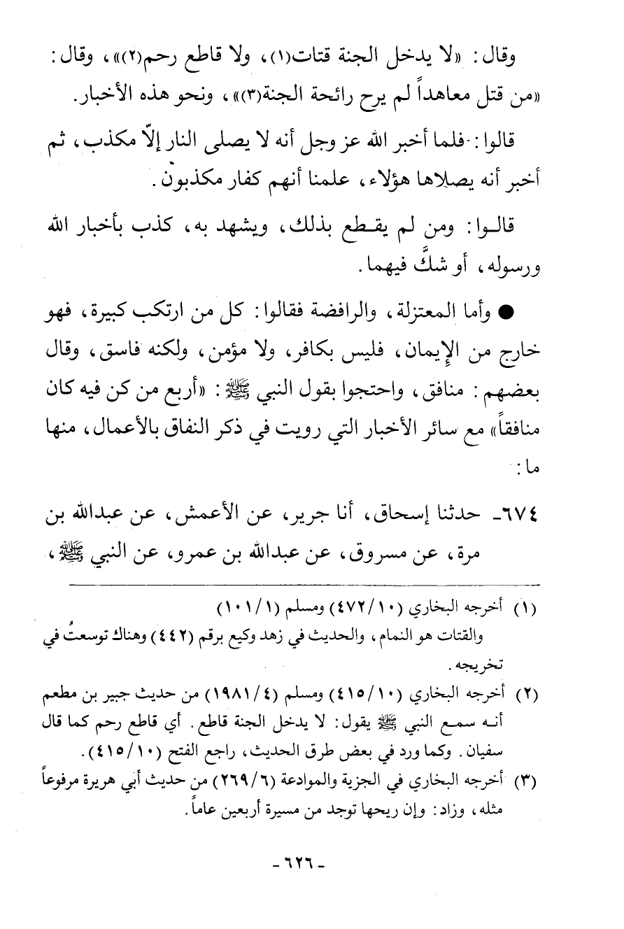 وَقَالَ: «لَا يَدْخُلُ الْجَنَّةَ قَتَّاتٌ، وَلَا قَاطِعُ رَحِمٍ» وَقَالَ: «مَنْ قَتَلَ مُعَاهَدًا لَمْ يَرِحْ رَائِحَةَ الْجَنَّةِ» وَنَحْوَ هَذِهِ الْأَخْبَارِ. قَالُوا: فَلَمَّا أَخْبَرَ اللَّهُ عَزَّ وَجَلَّ أَنَّهُ لَا يَصْلَى النَّارَ إِلَّا مُكَذِّبٌ، ثُمَّ أَخْبَرَ أَنَّهُ يَصْلَاهَا هَؤُلَاءِ عَلِمْنَا أَنَّهُمْ كُفَّارٌ مُكَذِّبُونَ قَالُوا: وَمَنْ لَمْ يَقْطَعْ بِذَلِكَ وَيَشْهَدْ بِهِ كَذَّبَ بِأَخْبَارِ اللَّهِ وَرَسُولِهِ أَوْ شَكَّ فِيهِمَا. وَأَمَّا الْمُعْتَزِلَةُ وَالرَّافِضَةُ فَقَالُوا: كُلُّ مَنِ ارْتَكَبَ كَبِيرَةً فَهُوَ خَارِجٌ مِنَ الْإِيمَانِ فَلَيْسَ بِكَافِرٍ وَلَا مُؤْمِنٍ وَلَكِنَّهُ فَاسِقٌ، وَقَالَ بَعْضُهُمْ مُنَافِقٌ، وَاحْتَجُّوا بِقَوْلِ النَّبِيِّ صَلَّى اللهُ عَلَيْهِ وَسَلَّمَ: «أَرْبَعٌ مَنْ كُنَّ فِيهِ كَانَ مُنَافِقًا» مَعَ سَائِرِ الْأَخْبَارِ الَّتِي رُوِيَتْ فِي ذِكْرِ النِّفَاقِ بِالْأَعْمَالِ مِنْهَا مَا
