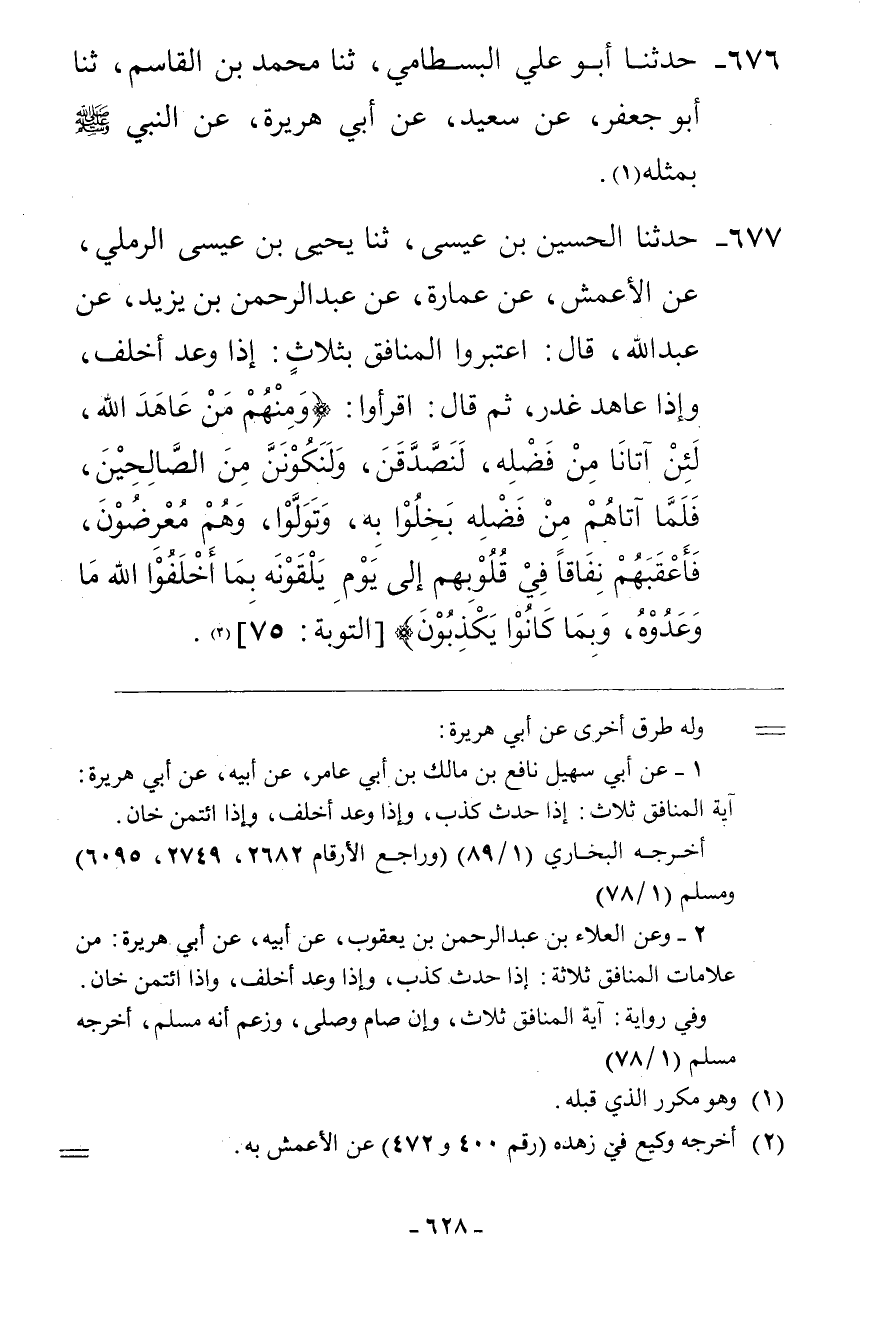 677 - حَدَّثَنَا الْحُسَيْنُ بْنُ عِيسَى، ثنا يَحْيَى بْنُ عِيسَى الرَّمْلِيُّ، عَنِ الْأَعْمَشِ، عَنْ عُمَارَةَ، عَنْ عَبْدِ الرَّحْمَنِ بْنِ يَزِيدَ، عَنْ عَبْدِ اللَّهِ، قَالَ: §اعْتَبَرُوا الْمُنَافِقَ بِثَلَاثٍ: إِذَا وَعَدَ أَخْلَفَ، وَإِذَا عَاهَدَ غَدَرَ، ثُمَّ قَالَ: اقْرَءُوا: {وَمِنْهُمْ مَنْ عَاهَدَ اللَّهَ لَئِنْ آتَانَا مِنْ فَضْلِهِ لَنَصَّدَّقَنَّ وَلَنَكُونَنَّ مِنَ الصَّالِحِينَ، فَلَمَّا آتَاهُمْ مِنْ فَضْلِهِ بَخِلُوا بِهِ وَتَوَلَّوْا وَهُمْ مُعْرِضُونَ فَأَعْقَبَهُمْ نِفَاقًا فِي قُلُوبِهِمْ إِلَى يَوْمِ يَلْقَوْنَهُ بِمَا أَخْلَفُوا اللَّهَ مَا وَعَدُوهُ وَبِمَا كَانُوا يَكْذِبُونَ} [التوبة: 76] "