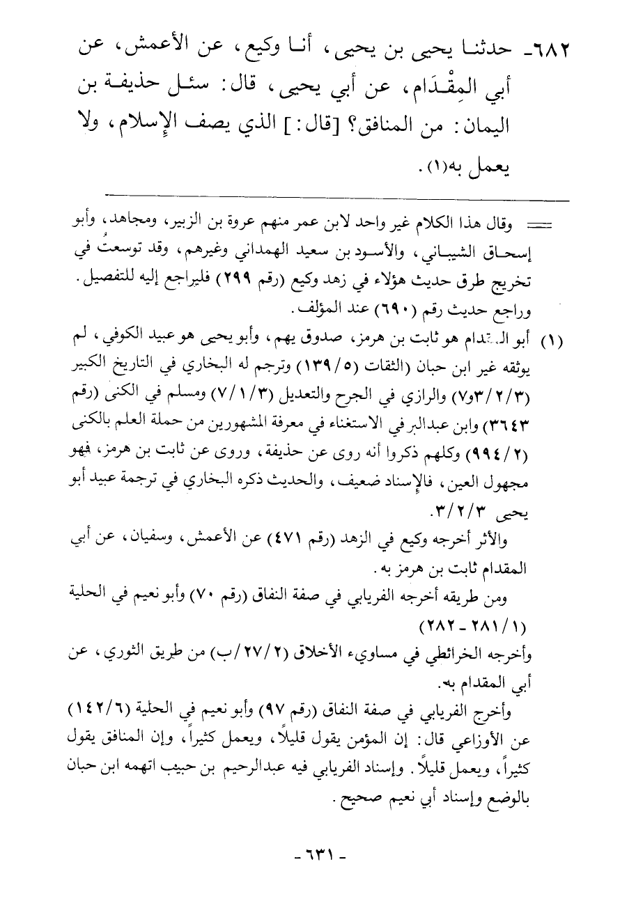 682 - حَدَّثَنَا يَحْيَى بْنُ يَحْيَى، أنا وَكِيعٌ، عَنِ الْأَعْمَشِ، عَنْ أَبِي الْمِقْدَامِ، عَنْ أَبِي يَحْيَى، قَالَ: سُئِلَ حُذَيْفَةُ بْنُ الْيَمَانِ §مَنِ الْمُنَافِقُ؟ قَالَ: «الَّذِي يَصِفُ الْإِسْلَامَ وَلَا يَعْمَلُ بِهِ»