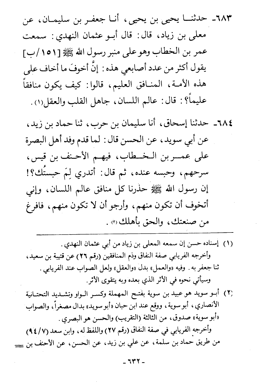 684 - حَدَّثَنَا إِسْحَاقُ، أنا سُلَيْمَانُ بْنُ حَرْبٍ، ثنا حَمَّادُ بْنُ زَيْدٍ، عَنْ أَبِي سُوَيْدٍ، عَنِ الْحَسَنِ، قَالَ: لَمَّا قَدِمَ وَفْدُ أَهْلِ الْبَصْرَةِ عَلَى عُمَرَ بْنِ الْخَطَّابِ فِيهِمُ الْأَحْنَفُ بْنُ قَيْسٍ سَرَّحَهُمْ وَحَبَسَهُ عِنْدَهُ، ثُمَّ قَالَ: أَتَدْرِي لِمَ حَبَسْتُكَ؟ إِنَّ رَسُولَ اللَّهِ صَلَّى اللهُ عَلَيْهِ وَسَلَّمَ «§حَذَّرَنَا كُلَّ مُنَافِقٍ عَالِمِ اللِّسَانِ وَإِنِّي أَتَخَوَّفُ أَنْ تَكُونَ مِنْهُمْ، وَأَرْجُو أَنْ لَا تَكُونَ مِنْهُمْ، فَافْرُغْ مِنْ صَنْعَتِكَ وَالْحَقْ بِأَهْلِكَ»