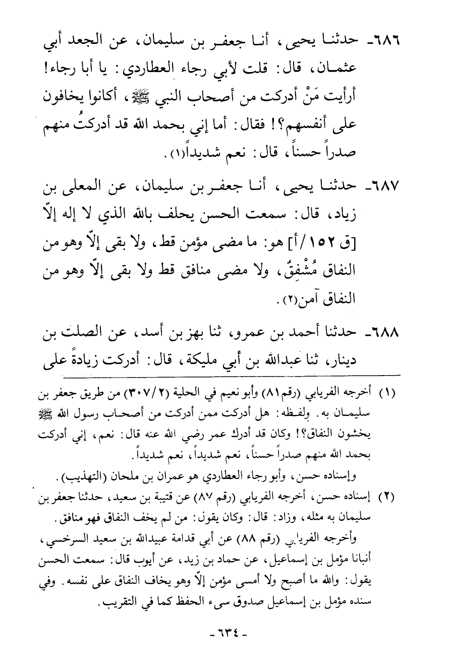 687 - حَدَّثَنَا يَحْيَى، أنا جَعْفَرُ بْنُ سُلَيْمَانَ، عَنِ الْمُعَلَّى بْنِ زِيَادٍ، قَالَ: سَمِعْتُ الْحَسَنَ، يَحْلِفُ بِاللَّهِ الَّذِي لَا إِلَهَ إِلَّا هُوَ: «§مَا مَضَى مُؤْمِنٌ قَطُّ وَلَا بَقَى إِلَّا وَهُوَ مِنَ النِّفَاقِ مُشْفِقٌ، وَلَا مَضَى مُنَافِقٌ قَطُّ وَلَا بَقَى إِلَّا وَهُوَ مِنَ النِّفَاقِ آمِنٌ»