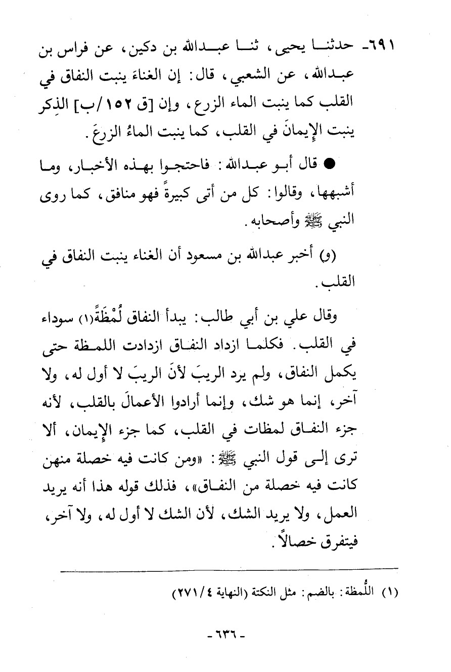 691 - حَدَّثَنَا يَحْيَى، ثنا عَبْدُ اللَّهِ بْنُ دُكَيْنٍ، عَنْ فِرَاسِ بْنِ عَبْدِ اللَّهِ، عَنِ الشَّعْبِيِّ، قَالَ: «إِنَّ §الْغِنَاءَ يُنْبِتُ النِّفَاقَ فِي الْقَلْبِ كَمَا يُنْبِتُ الْمَاءُ الزَّرْعَ، وَإِنَّ الذِّكْرَ يُنْبِتُ الْإِيمَانَ فِي الْقَلْبِ كَمَا يُنْبِتُ الْمَاءُ الزَّرْعَ» قَالَ أَبُو عَبْدِ اللَّهِ: فَاحْتَجُّوا بِهَذِهِ الْأَخْبَارِ وَمَا أَشْبَهَهَا، وَقَالُوا: كُلُّ مَنْ أَتَى كَبِيرَةً فَهُوَ مُنَافِقٌ، كَمَا رَوَى النَّبِيُّ صَلَّى اللهُ عَلَيْهِ وَسَلَّمَ وَأَصْحَابُهُ. وَأَخْبَرَ عَبْدُ اللَّهِ بْنُ مَسْعُودٍ: أَنَّ الْغِنَاءَ يُنْبِتُ النِّفَاقَ فِي الْقَلْبِ. وَقَالَ عَلِيُّ بْنُ أَبِي طَالِبٍ: يَبْدَأُ النِّفَاقُ لُمْظَةً سَوْدَاءَ فِي الْقَلْبِ، فَكُلَّمَا ازْدَادَ النِّفَاقُ ازْدَادَتِ اللُّمْظَةُ حَتَّى يَكْمُلَ النِّفَاقُ، وَلَمْ يُرِدِ الرَّيْبَ لِأَنَّ الرَّيْبَ لَا أَوَّلَ لَهُ وَلَا آخِرَ إِنَّمَا هُوَ شَكٌّ، وَإِنَّمَا أَرَادُوا الْأَعْمَالَ بِالْقَلْبِ لِأَنَّهُ جَزَّأَ النِّفَاقَ لُمْظَاتٍ فِي الْقَلْبِ، كَمَا جَزَّأَ الْإِيمَانَ أَلَا تَرَى إِلَى قَوْلِ النَّبِيِّ صَلَّى اللهُ عَلَيْهِ وَسَلَّمَ: «وَمَنْ كَانَتْ فِيهِ خَصْلَةٌ مِنْهُنَّ كَانَتْ فِيهِ خَصْلَةٌ مِنَ النِّفَاقِ» فَذَلِكَ قَوْلُهُ: هَذَا أَنَّهُ يُرِيدُ الْعَمَلَ وَلَا يُرِيدُ الشَّكَّ لِأَنَّ الشَّكَّ لَا أَوَّلَ لَهُ وَلَا آخِرَ فَيَتَفَرَّقُ خِصَالًا -[637]-. وَاحْتَجُّوا بِهَذِهِ الْأَخْبَارِ وَزَعَمُوا أَنَّهُ مُنَافِقٌ مُخَلَّدٌ فِي النَّارِ، وَقَدْ وَافَقَهُمْ عَلَى ذَلِكَ فِرْقَةٌ مِمَّنْ يَقُولُ بِالْحَدِيثِ فَزَعَمُوا أَنَّهُ مُنَافِقٌ لِمَا جَاءَ فِيهِ مِنَ الْأَخْبَارِ عَلَى غَيْرِ تَلْخِيصٍ وَلَا شُهُودٍ عَلَيْهِ بِالنَّارِ، وَلَكِنِ اتِّبَاعًا لِلْأَخْبَارِ عَلَى مَا جَاءَتْ يُسَمُّونَهُ بِالنِّفَاقِ، وَلَا يُسَمُّونَهُ مُؤْمِنًا، وَلَا مُسْلِمًا، وَلَا كَافِرًا قَالَ أَبُو عَبْدِ اللَّهِ: وَقَدِ اتَّفَقَتْ هَذِهِ الْفِرَقُ الَّتِي ذَكَرْنَاهَا مِنْ أَهْلِ الْبِدَعِ مَعَ اخْتِلَافِهَا فِي اسْمِ مَنِ ارْتَكَبَ الْكَبَائِرَ عَلَى أَنَّ كُلَّ مَنِ ارْتَكَبَ كَبِيرَةً فَمَاتَ غَيْرَ تَائِبٍ مِنْهَا فَهُوَ مِنْ أَهْلِ النَّارِ خَالِدًا مُخَلَّدًا لَا يَخْرُجُ مِنْهَا أَبَدًا، وَأَيَّسُوهُ مِنْ رَحْمَةِ اللَّهِ، وَجَمِيعُ مَا كَتَبْنَاهُ مِنَ الْحُجَجِ عَلَى الطَّائِفَتَيْنِ اللَّتَيْنِ ذَكَرْنَا خِلَافَهُمْ لَنَا مِنْ أَصْحَابِ الْحَدِيثِ فَهِيَ دَاخِلَةٌ عَلَى هَؤُلَاءِ وَلَازِمَةٌ لَهُمْ