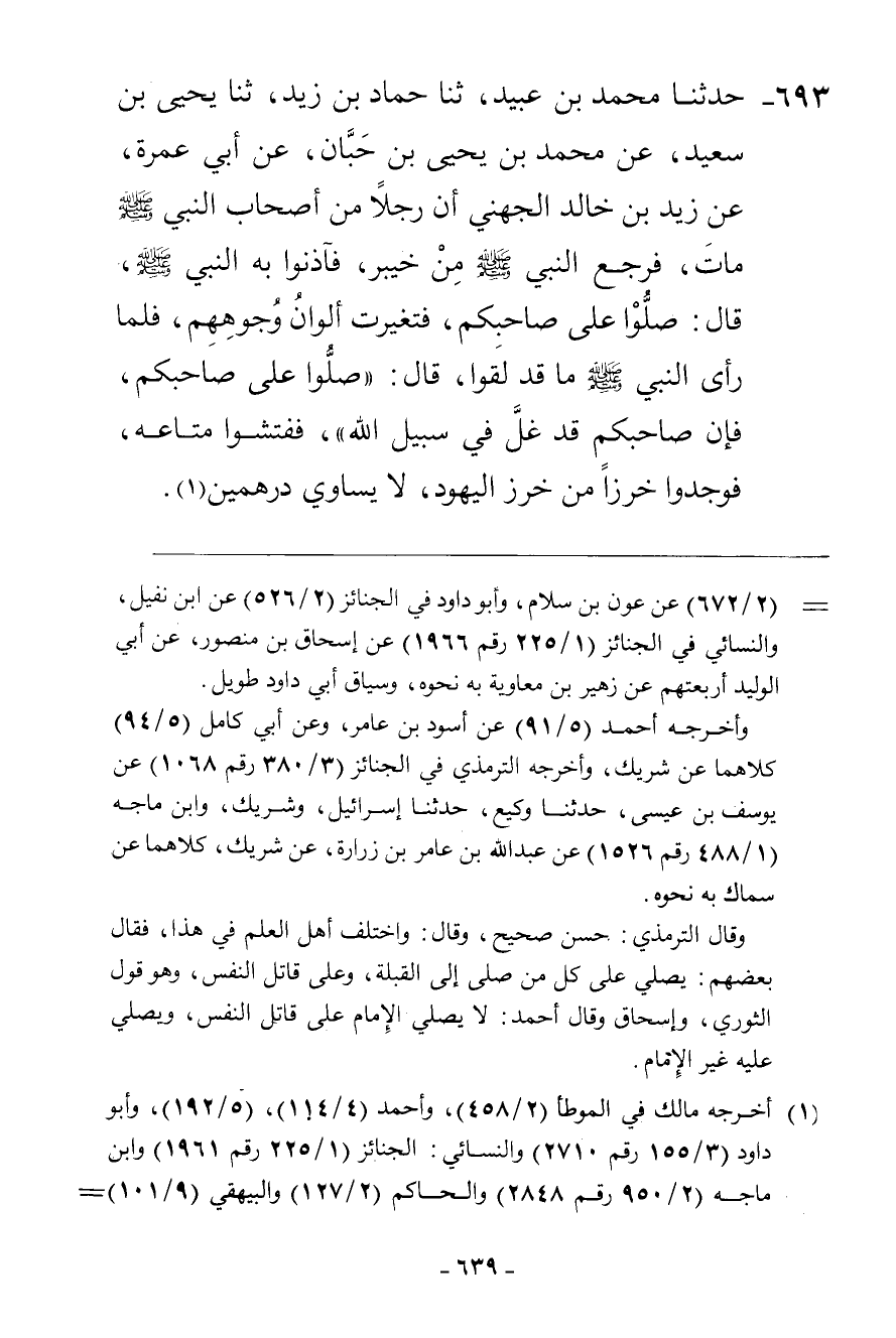 693 - حَدَّثَنَا مُحَمَّدُ بْنُ عُبَيْدٍ، ثنا حَمَّادُ بْنُ زَيْدٍ، ثنا يَحْيَى بْنُ سَعِيدٍ، عَنْ مُحَمَّدِ بْنِ يَحْيَى بْنِ حِبَّانَ، عَنْ أَبِي عَمْرَةَ، عَنْ زَيْدِ بْنِ خَالِدٍ الْجُهَنِيِّ، أَنَّ رَجُلًا، مِنْ أَصْحَابِ النَّبِيِّ صَلَّى اللهُ عَلَيْهِ وَسَلَّمَ مَاتَ فَرَجَعَ النَّبِيُّ صَلَّى اللهُ عَلَيْهِ وَسَلَّمَ مِنْ خَيْبَرَ فَآذَنُوا بِهِ النَّبِيَّ صَلَّى اللهُ عَلَيْهِ وَسَلَّمَ قَالَ: «§صَلُّوا عَلَى صَاحِبِكُمْ» فَتَغَيَّرَتْ أَلْوَانُ وُجُوهِهِمْ فَلَمَّا رَأَى النَّبِيُّ صَلَّى اللهُ عَلَيْهِ وَسَلَّمَ مَا قَدْ لَقُوا، قَالَ: «صَلُّوا عَلَى صَاحِبِكُمْ فَإِنَّ صَاحِبَكُمْ قَدْ غَلَّ فِي سَبِيلِ اللَّهِ فَفَتَّشُوا مَتَاعَهُ فَوَجَدُوا خَرَزًا مِنْ خَرَزِ الْيَهُودِ لَا يُسَاوِي دِرْهَمَيْنِ»